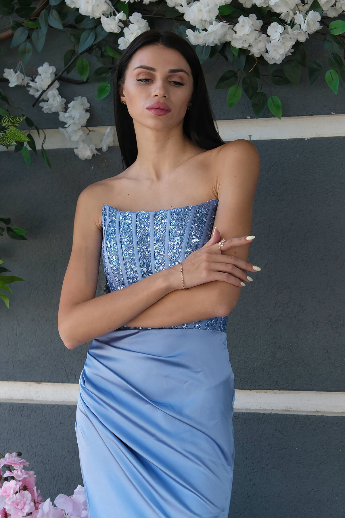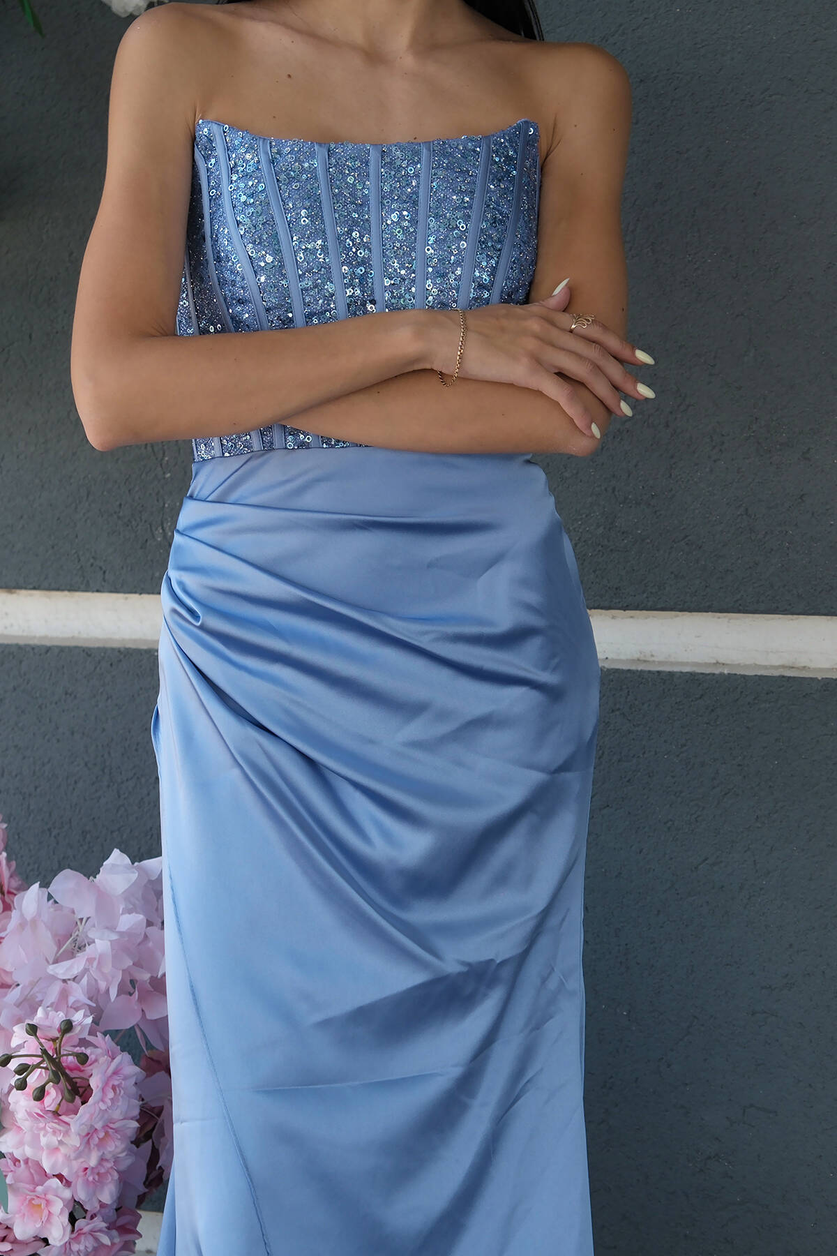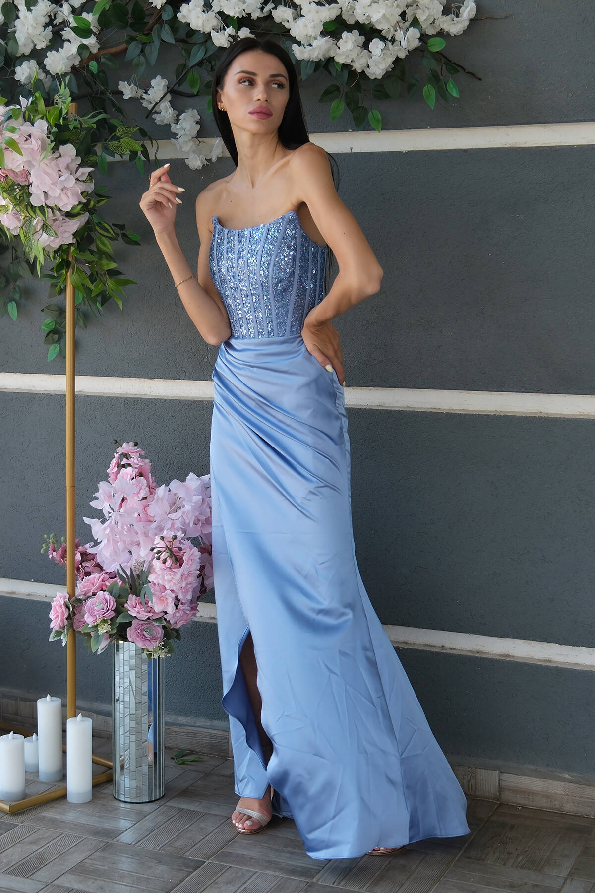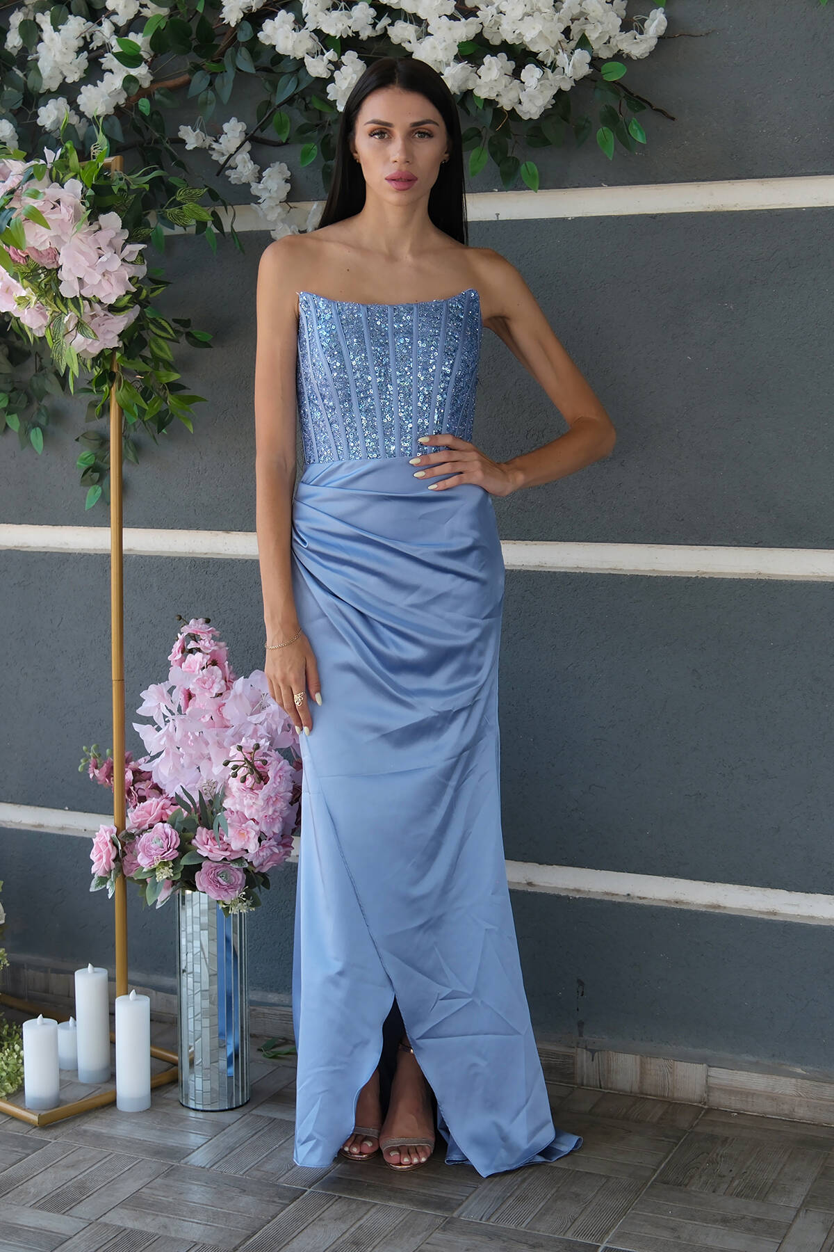 Bebe Mavi Önü Taş Detaylı Yırtmaçlı Pul Payet Straplez Abiye 0801163.449