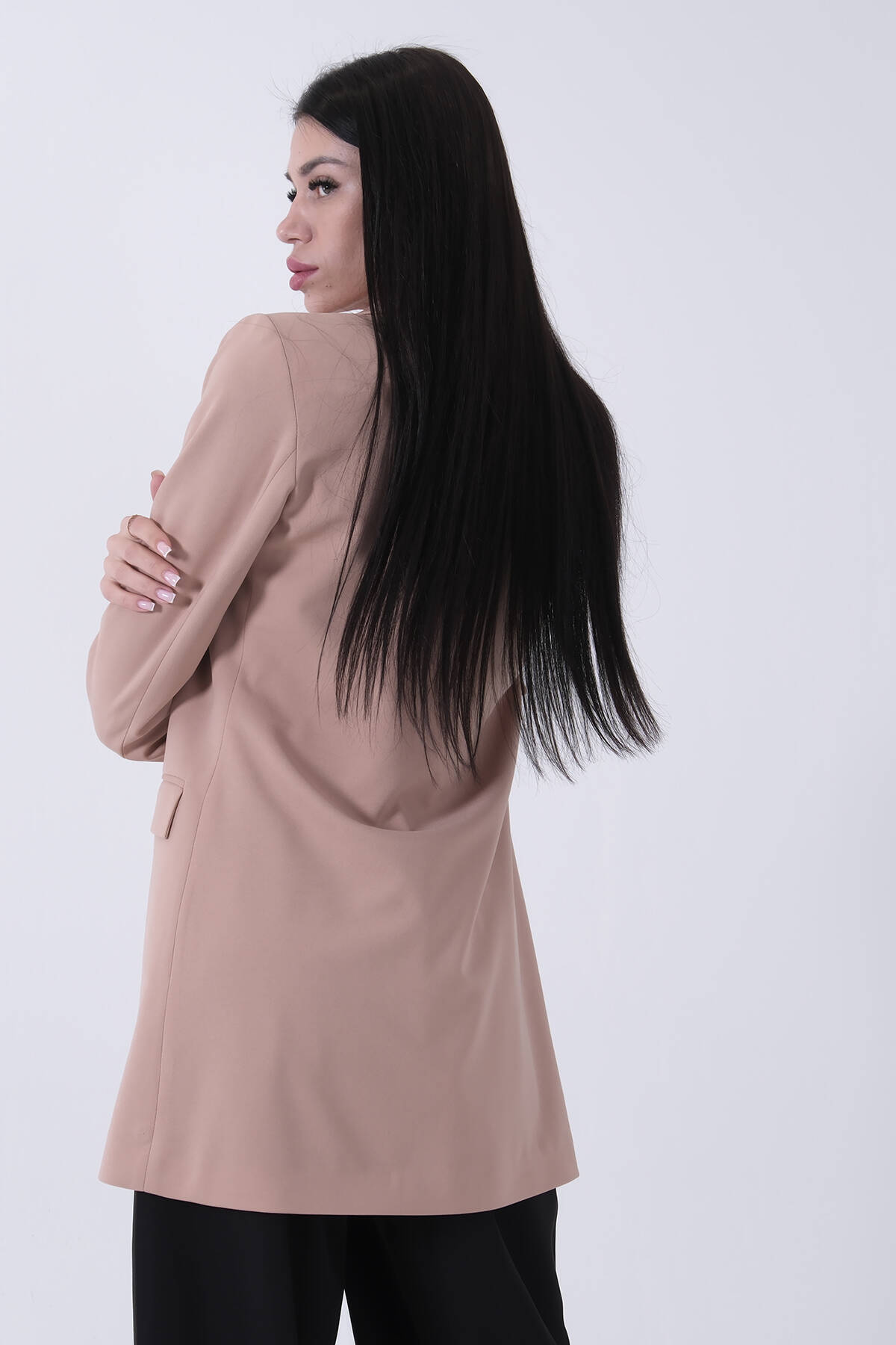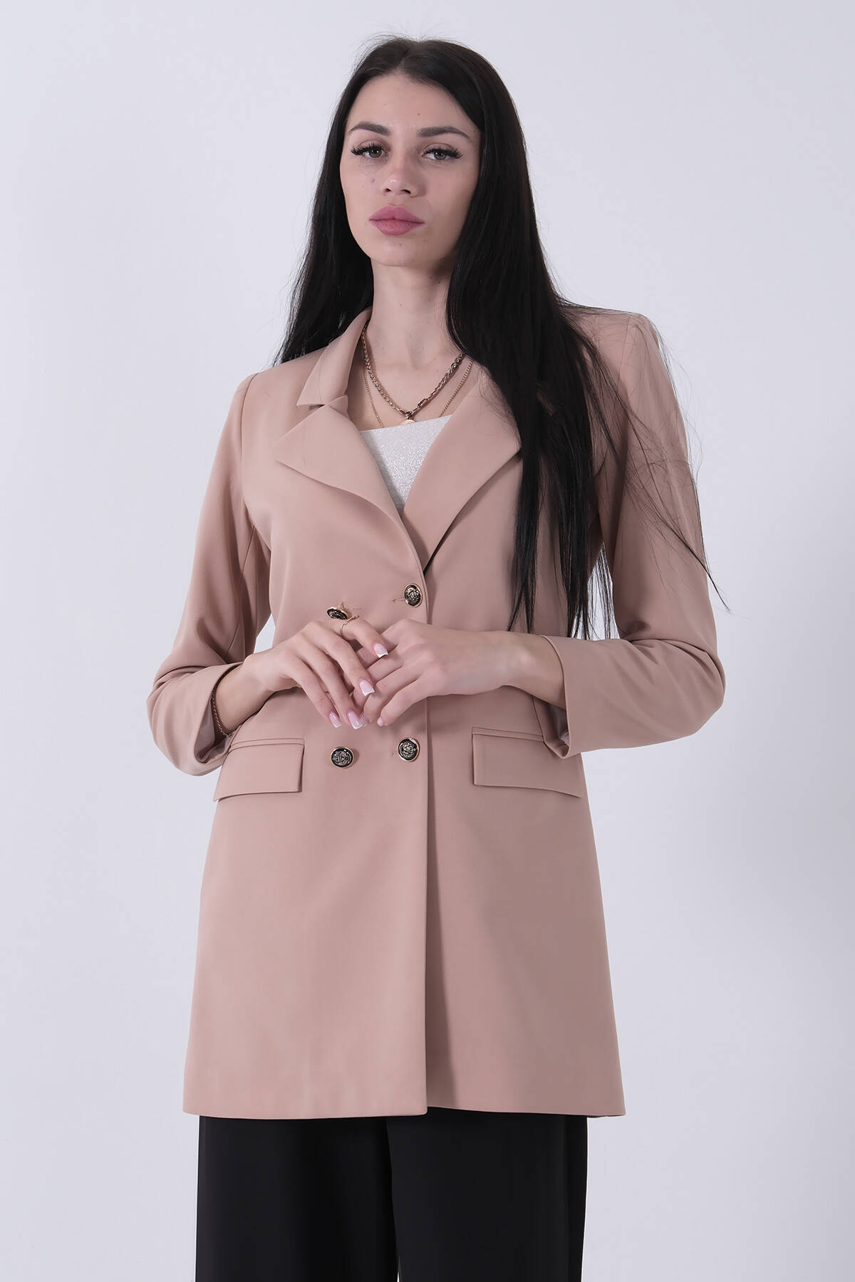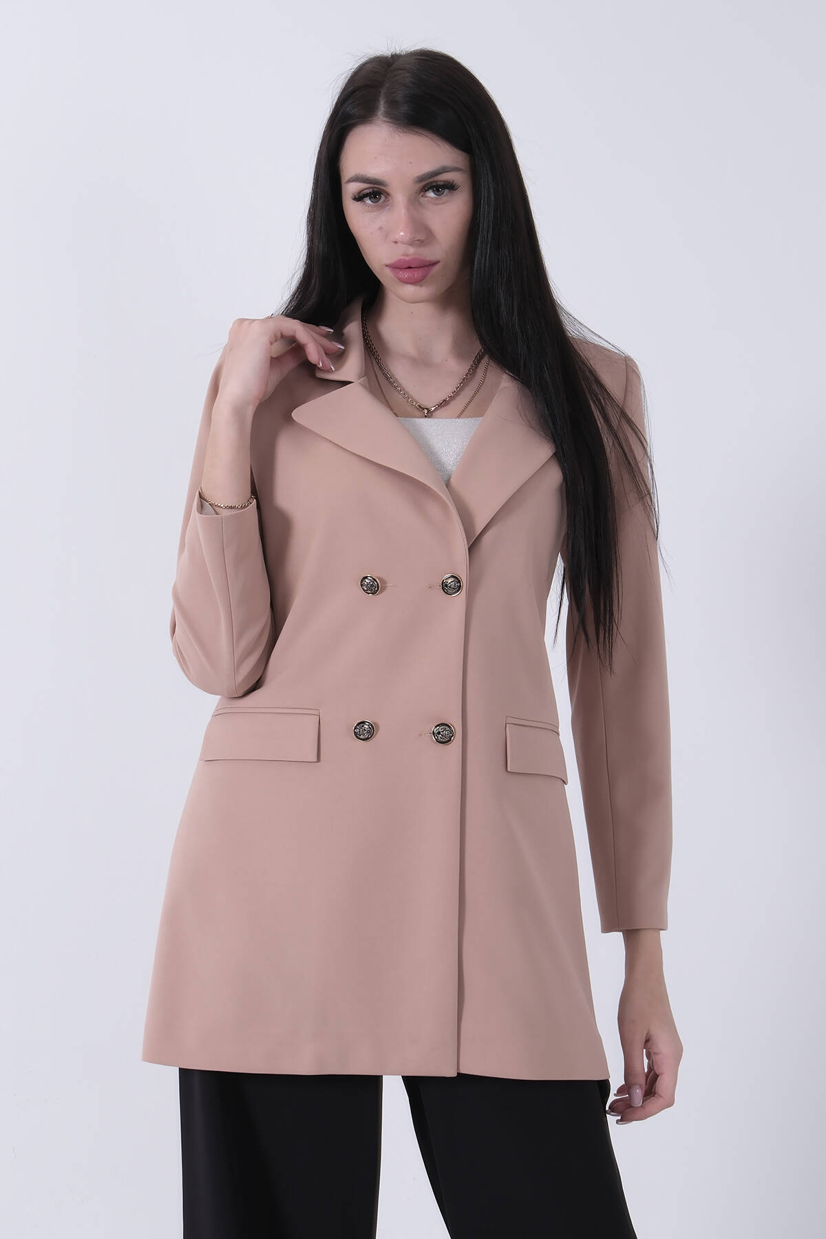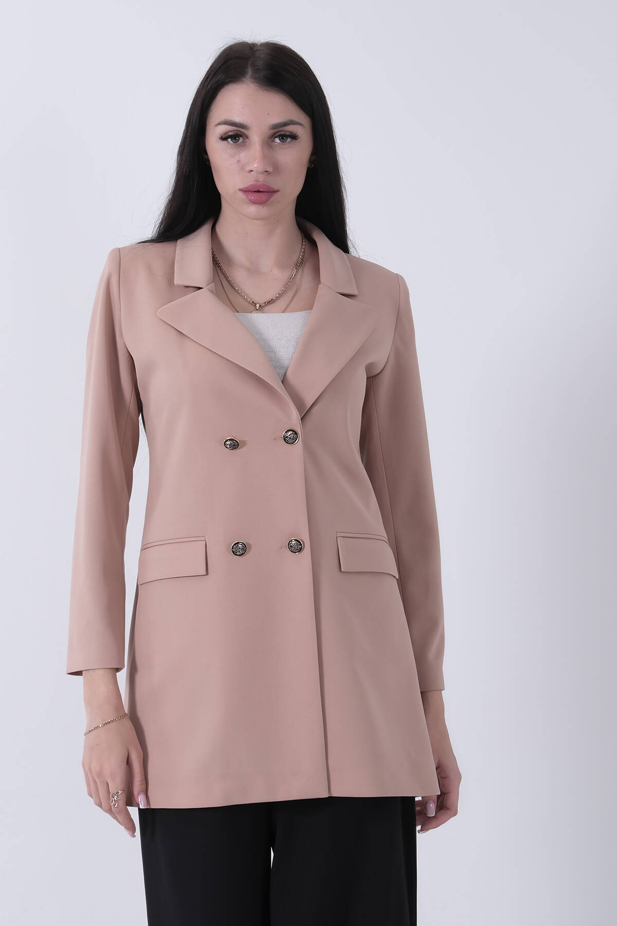 Uzun Kol Klasik Yaka Düğme Kapamalı Astarlı Vatka Detaylı Çift Cepli Blazer Ceket