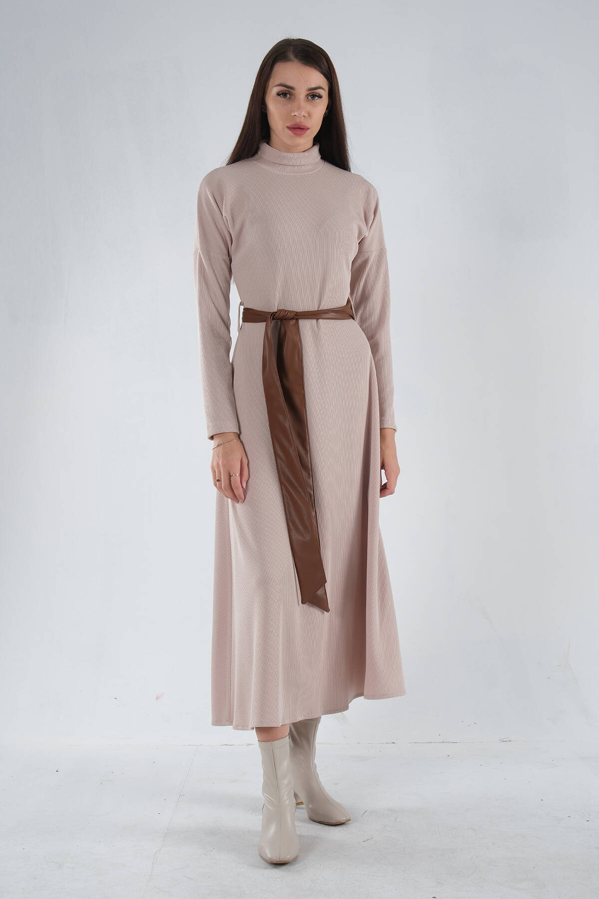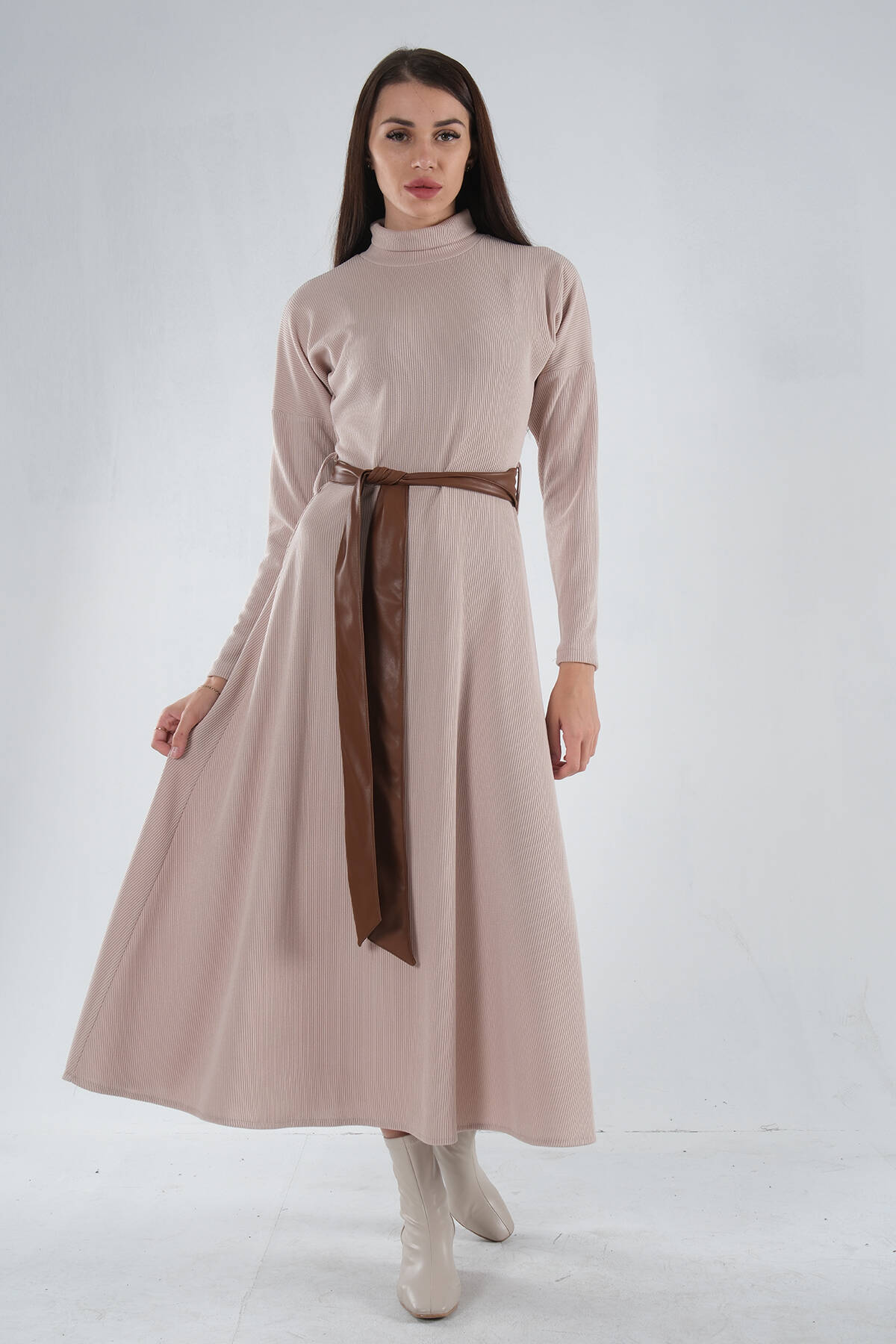 Bej Beli Kemerli Örme Elbise 0104030.55