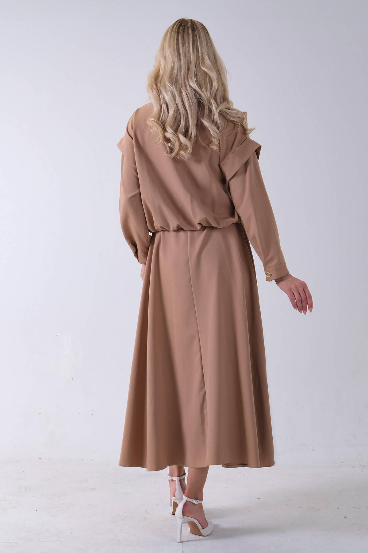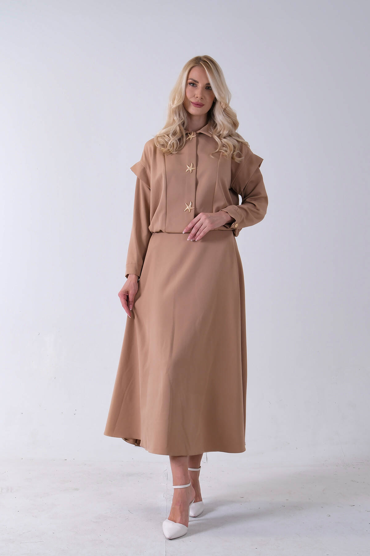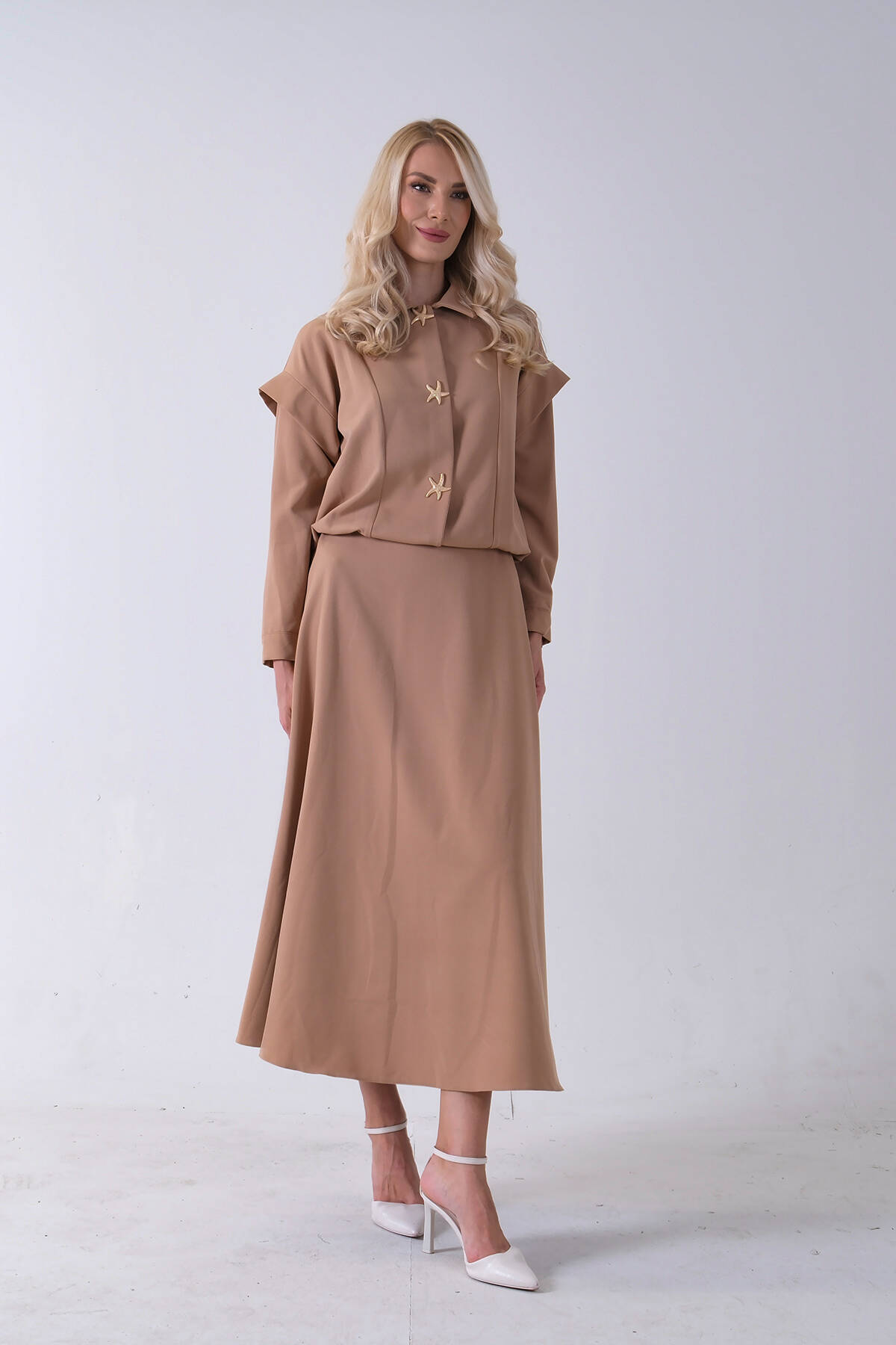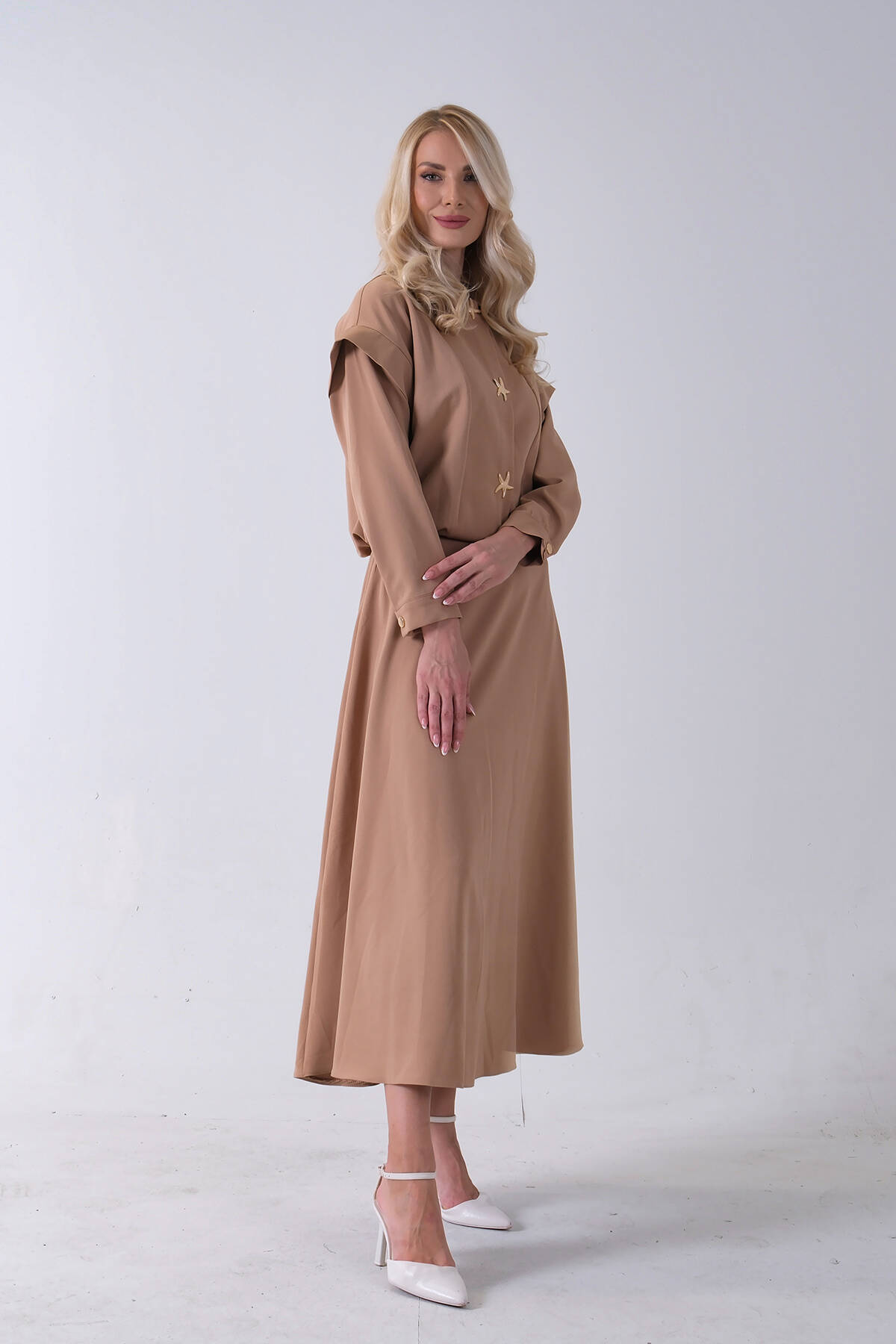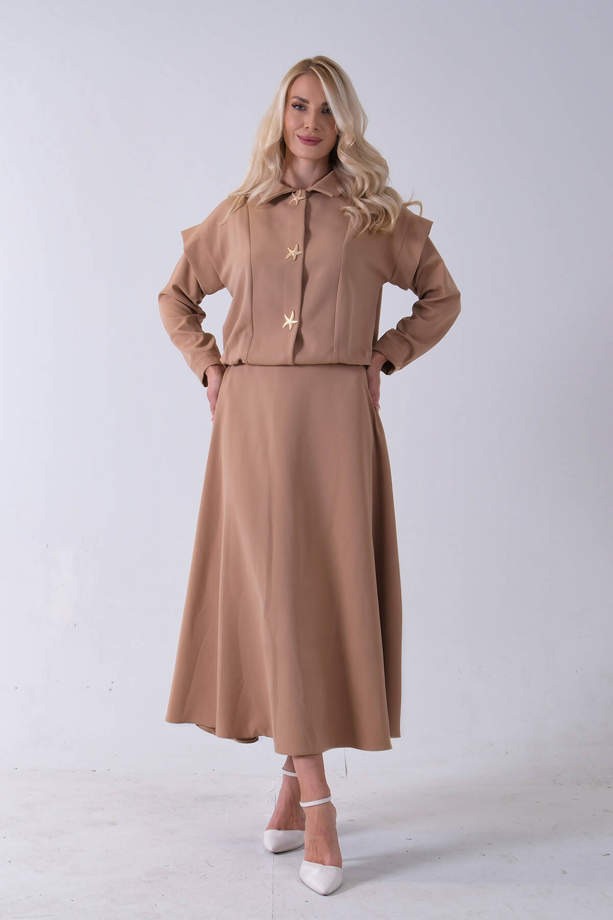 Bej Beli Lastikli Deniz Yıldızı Çıt Çıt Kapamalı Ceket Detaylı Etekli Takım 4592269.55
