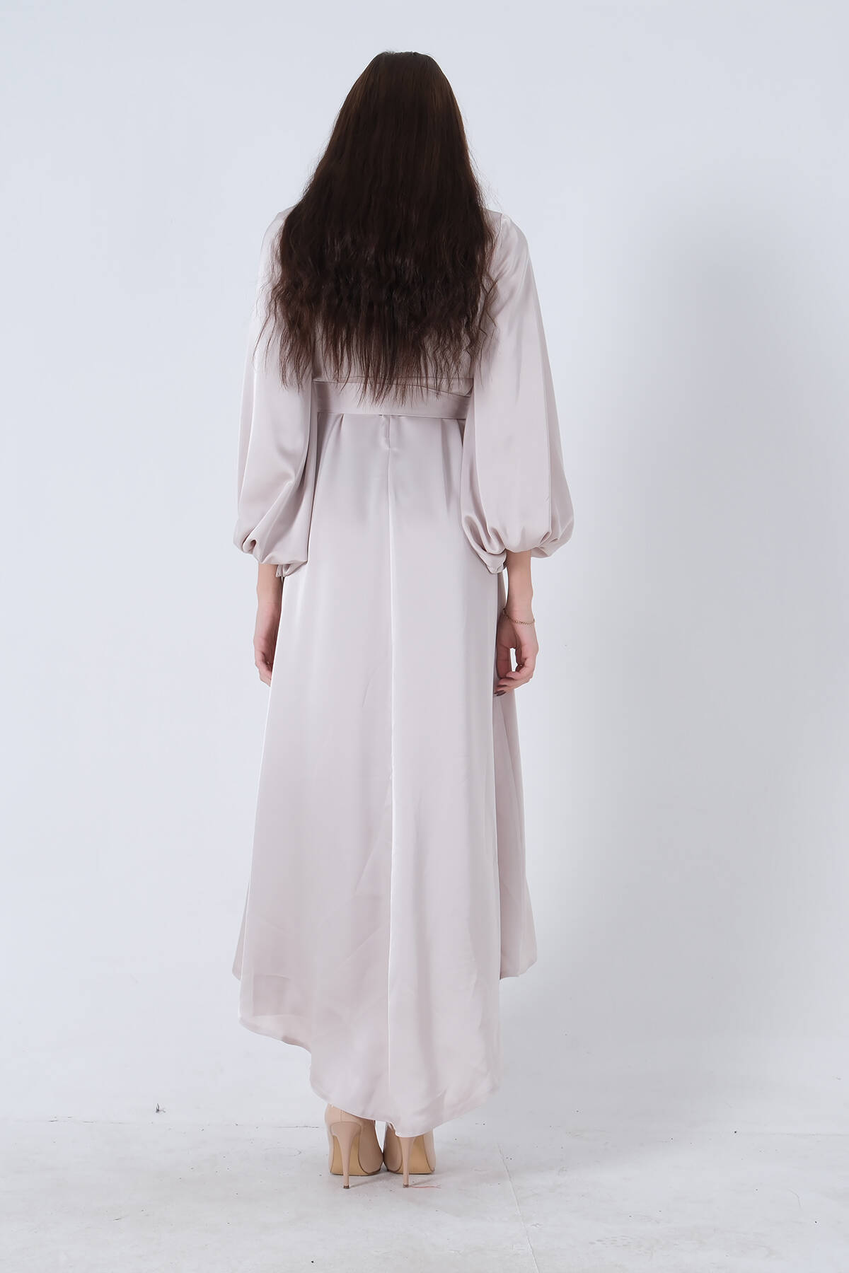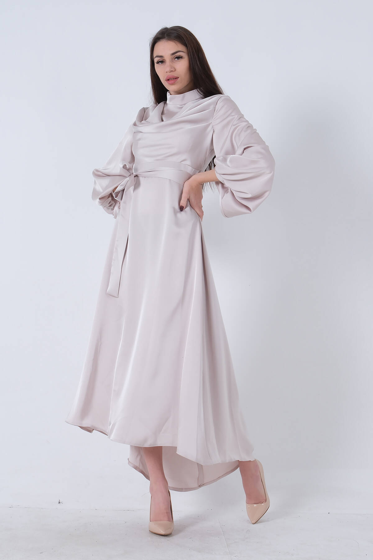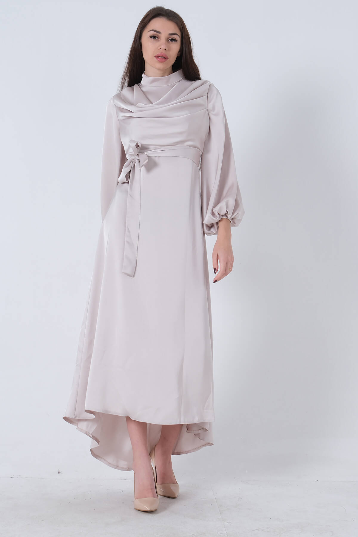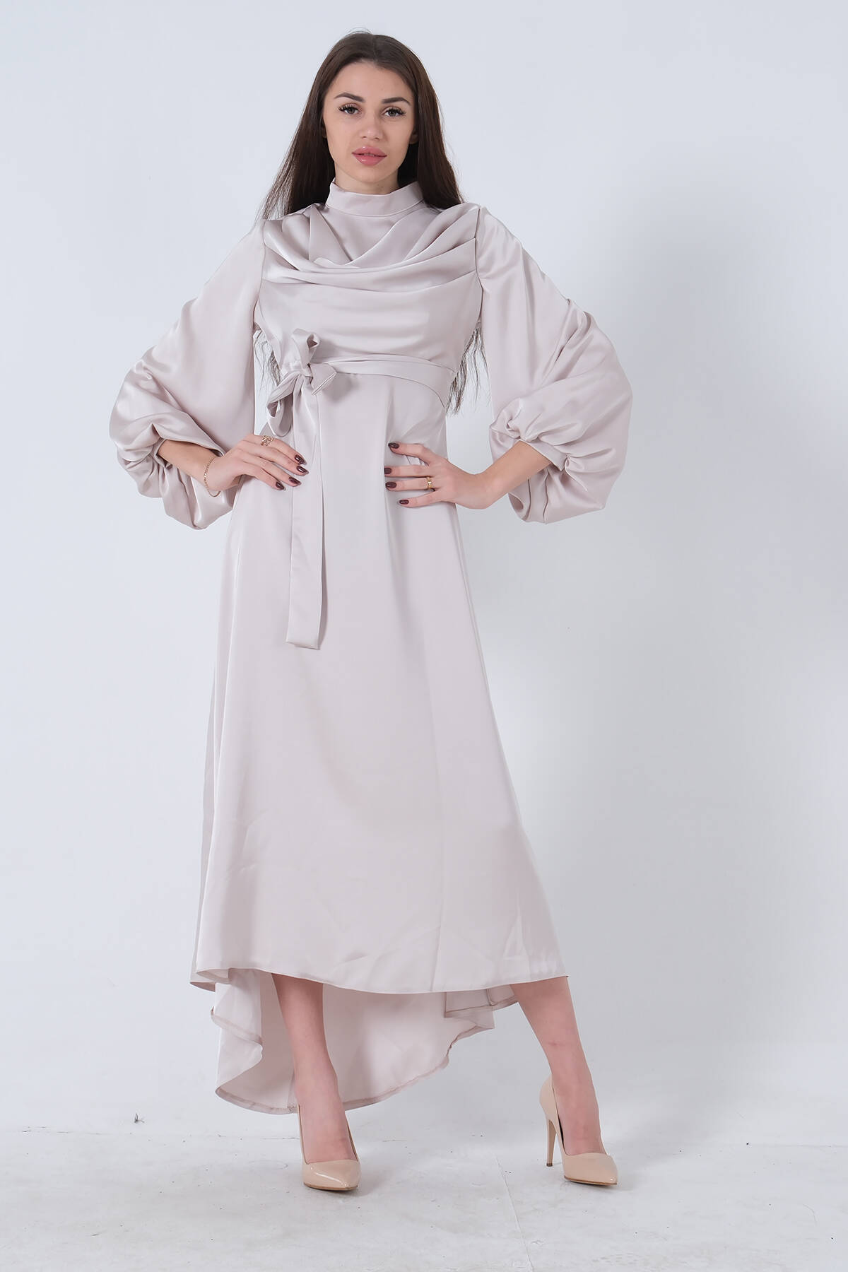 Bej Degaje Saten Balon Kol Tesettür Elbise 5305035.55
