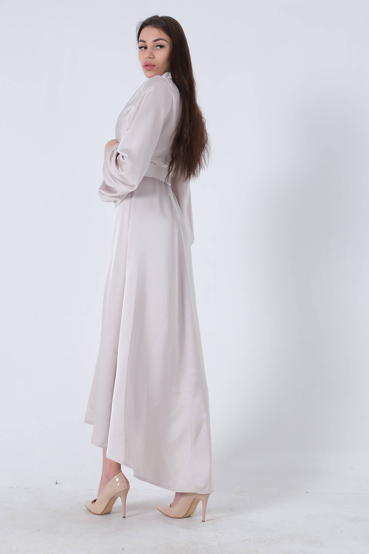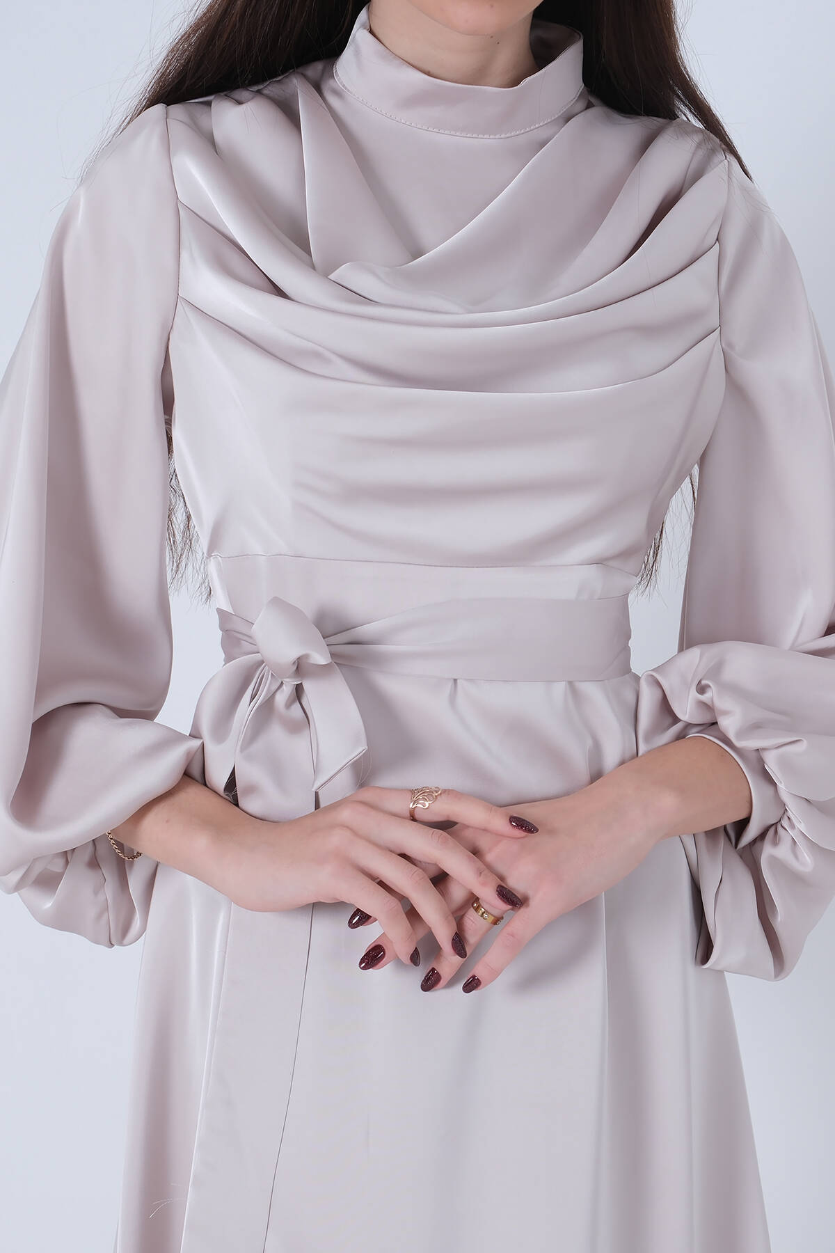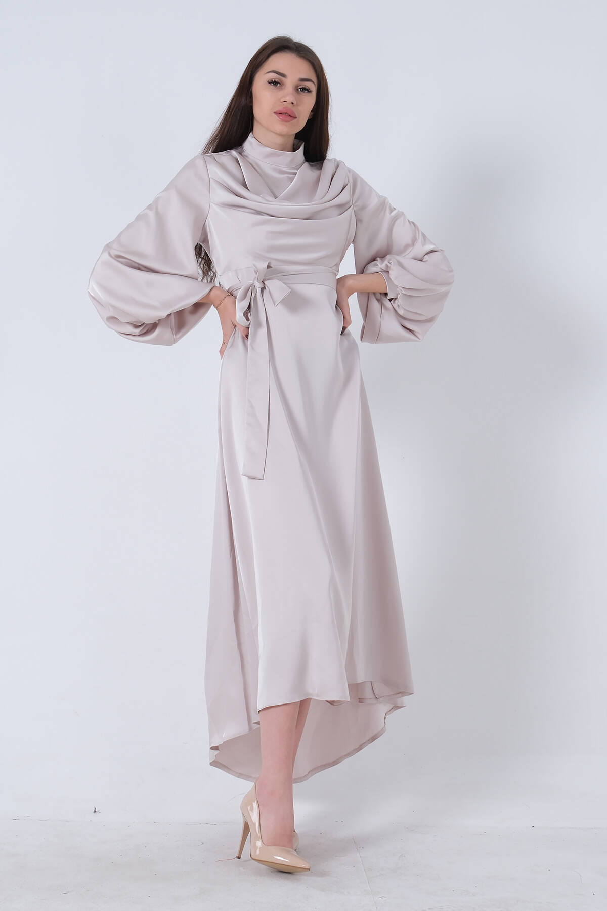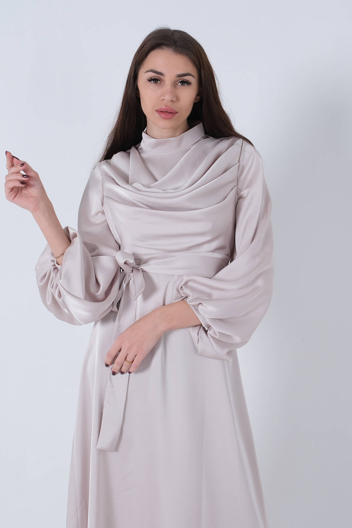 Bej Degaje Saten Balon Kol Tesettür Elbise 5305035.55
