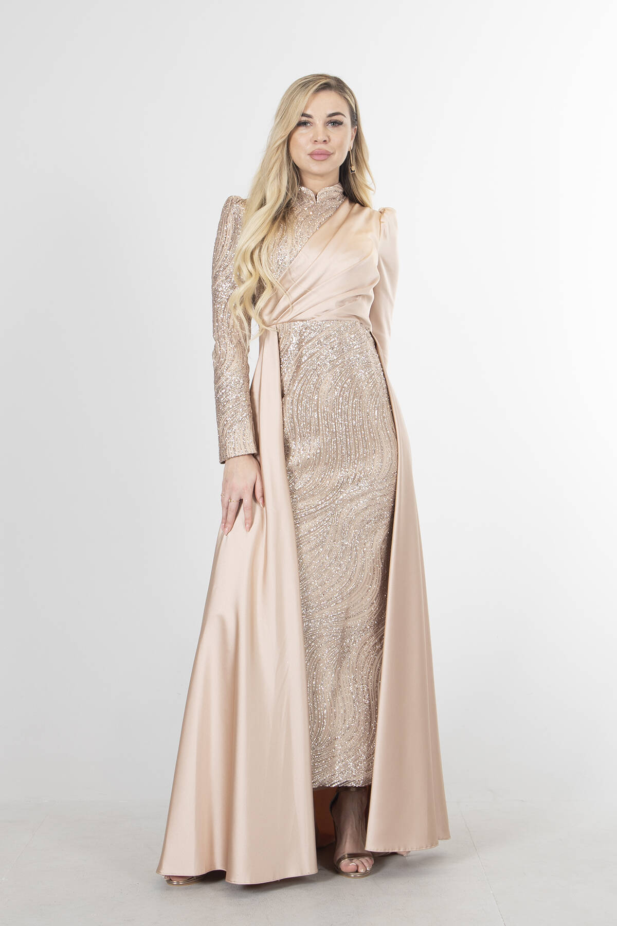 Modelin Ölçüleri : Boy: 1.80 cm / Göğüs: 88 cm / Bel: 69 cm /Basen : 94 cm Mankenin Üzerindeki Ürün 36/S Bedendir %100 Polyester Uzun Kol Dik Yaka Saten Drape Ve Kuyruk Detaylı Simli Abiye Elbise Ürün Boyu : 108 cm Stüdyo Çekimlerinde Renkler Işık Farklılıgından Dolayı Değişiklik Gösterebilir (Dikkat! Ürünlerimiz güvenlik bandı ile gönderilmektedir . Güvenlik bandı olmayan ürünlerin iadesi kabul edilmeyecektir)