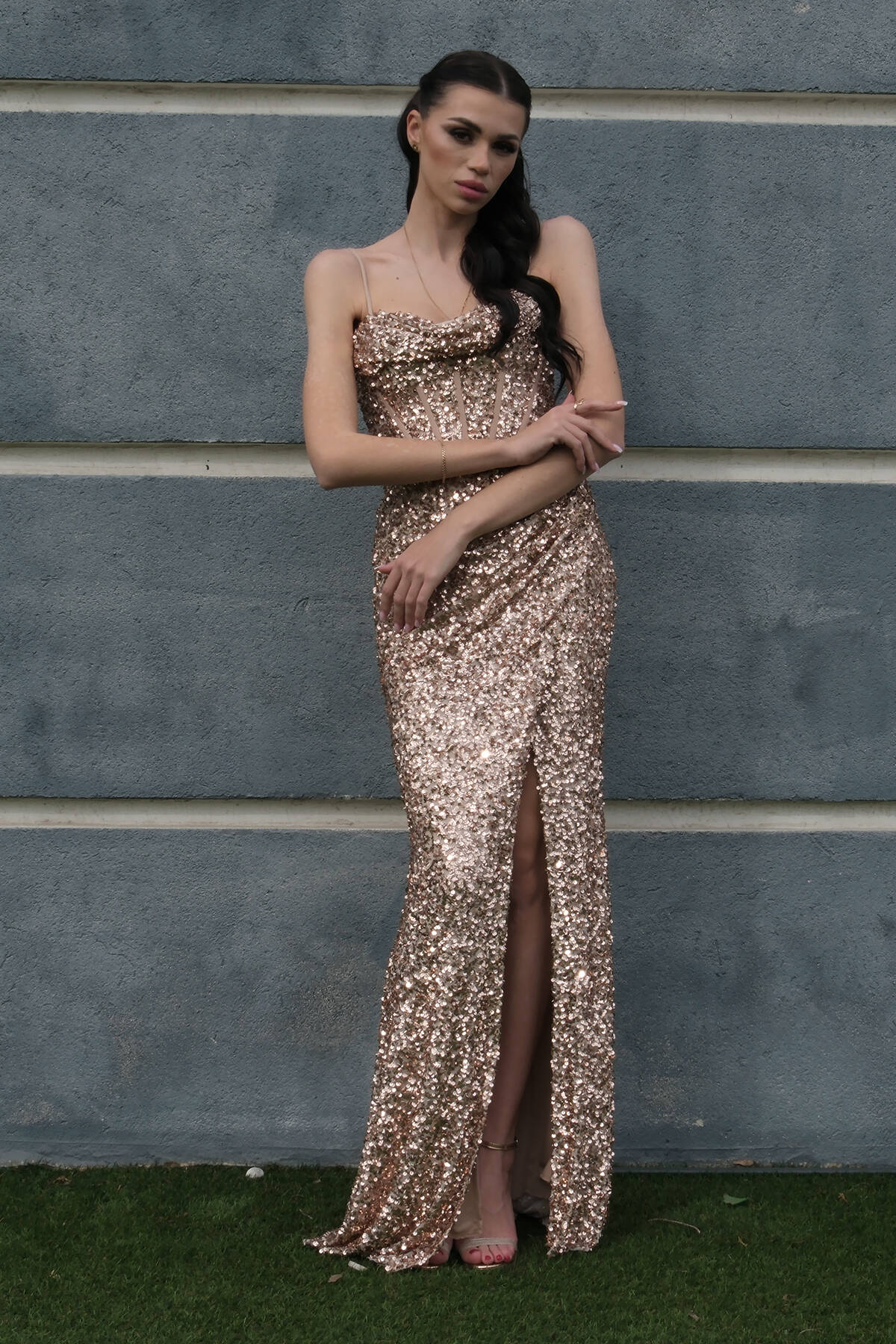 Gold Önü Taş Detaylı Yırtmaçlı Pul Payet Straplez Abiye 0801163.122