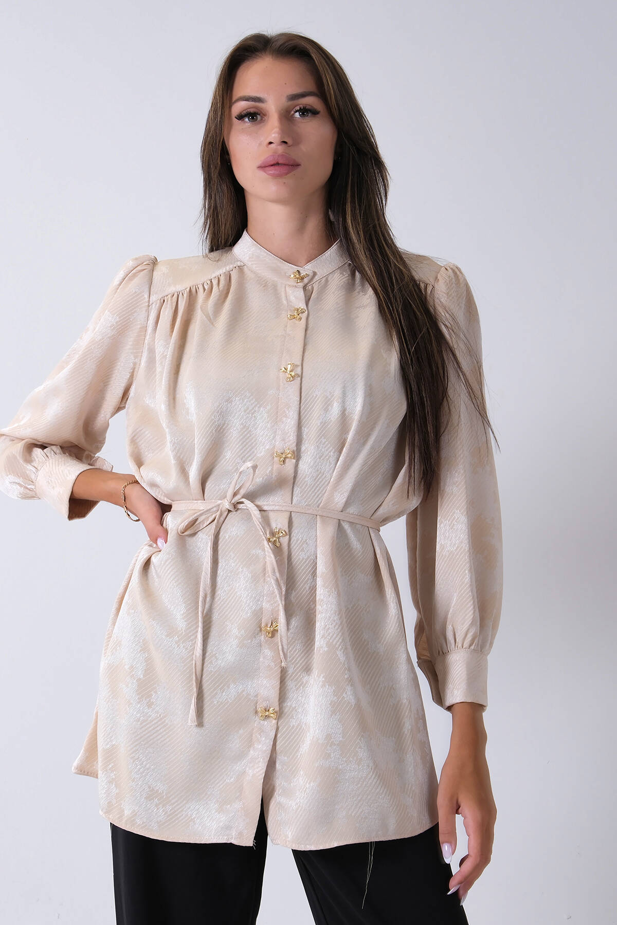 Bej Hakim Yaka Bel Bağlamalı Desenli Tunik 4595333.55