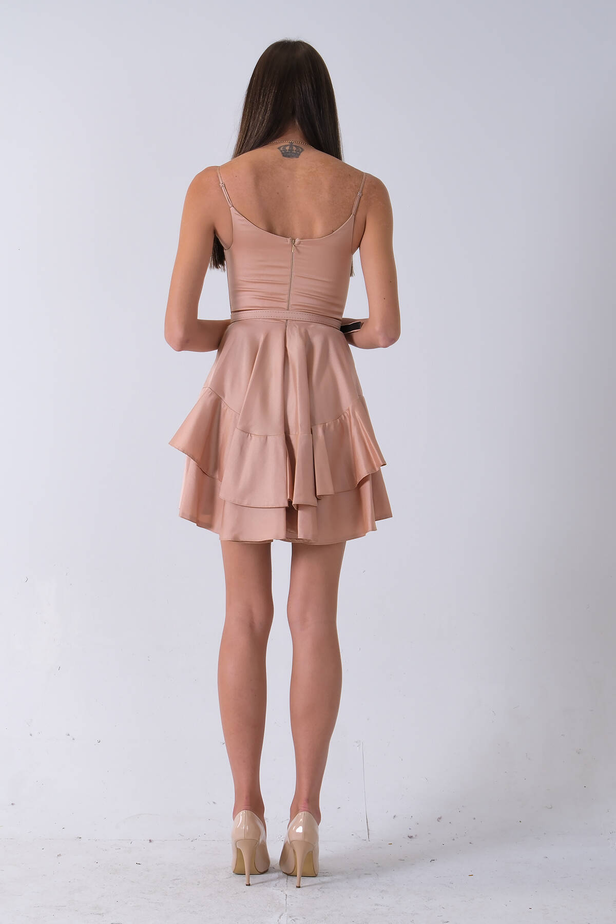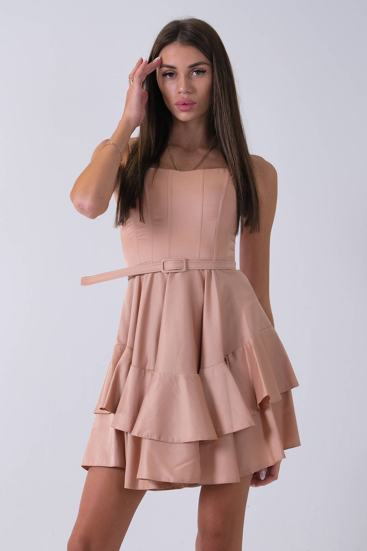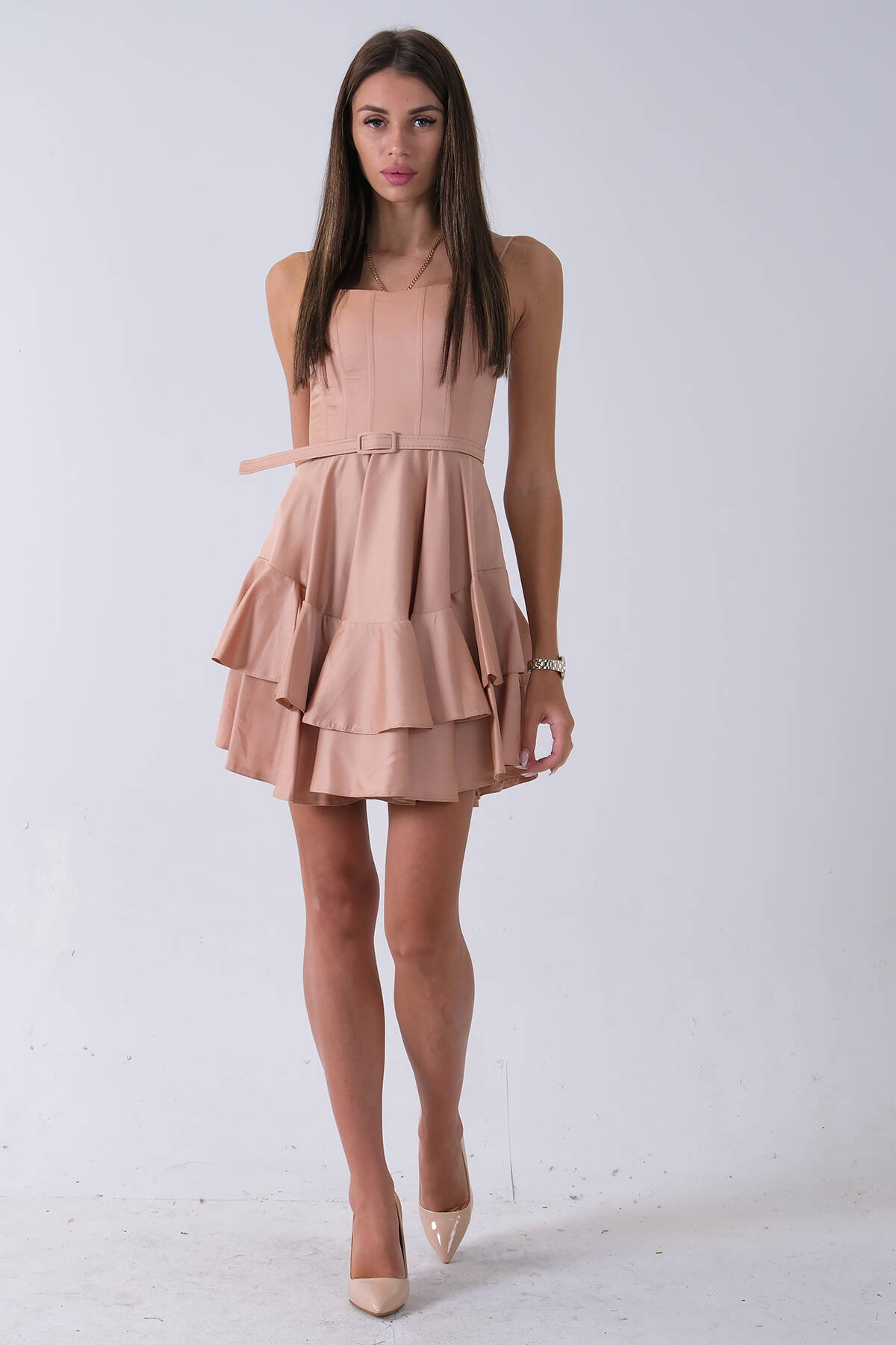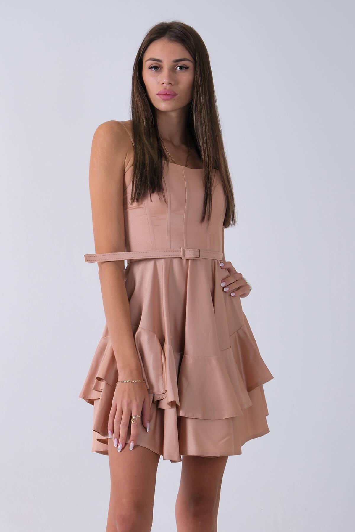 Bej İp Askılı Bel Kemer Bağlamalı Mini Boy Abiye 0802004.55