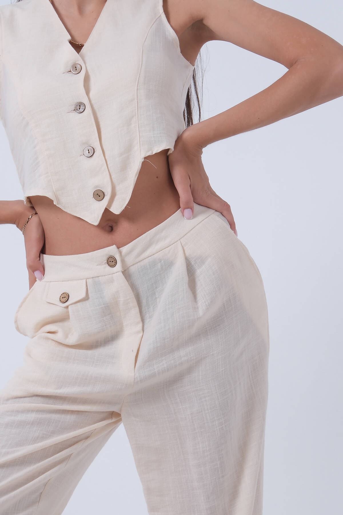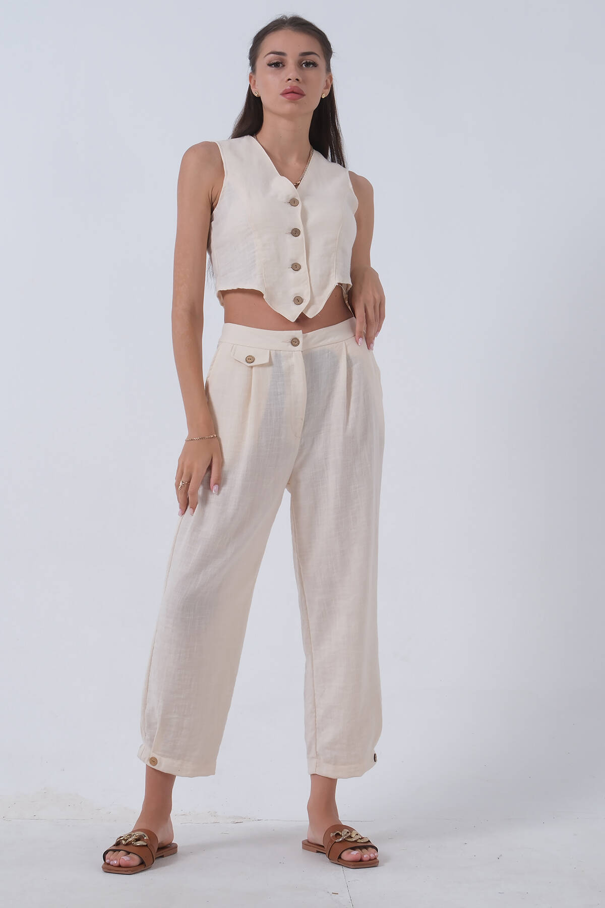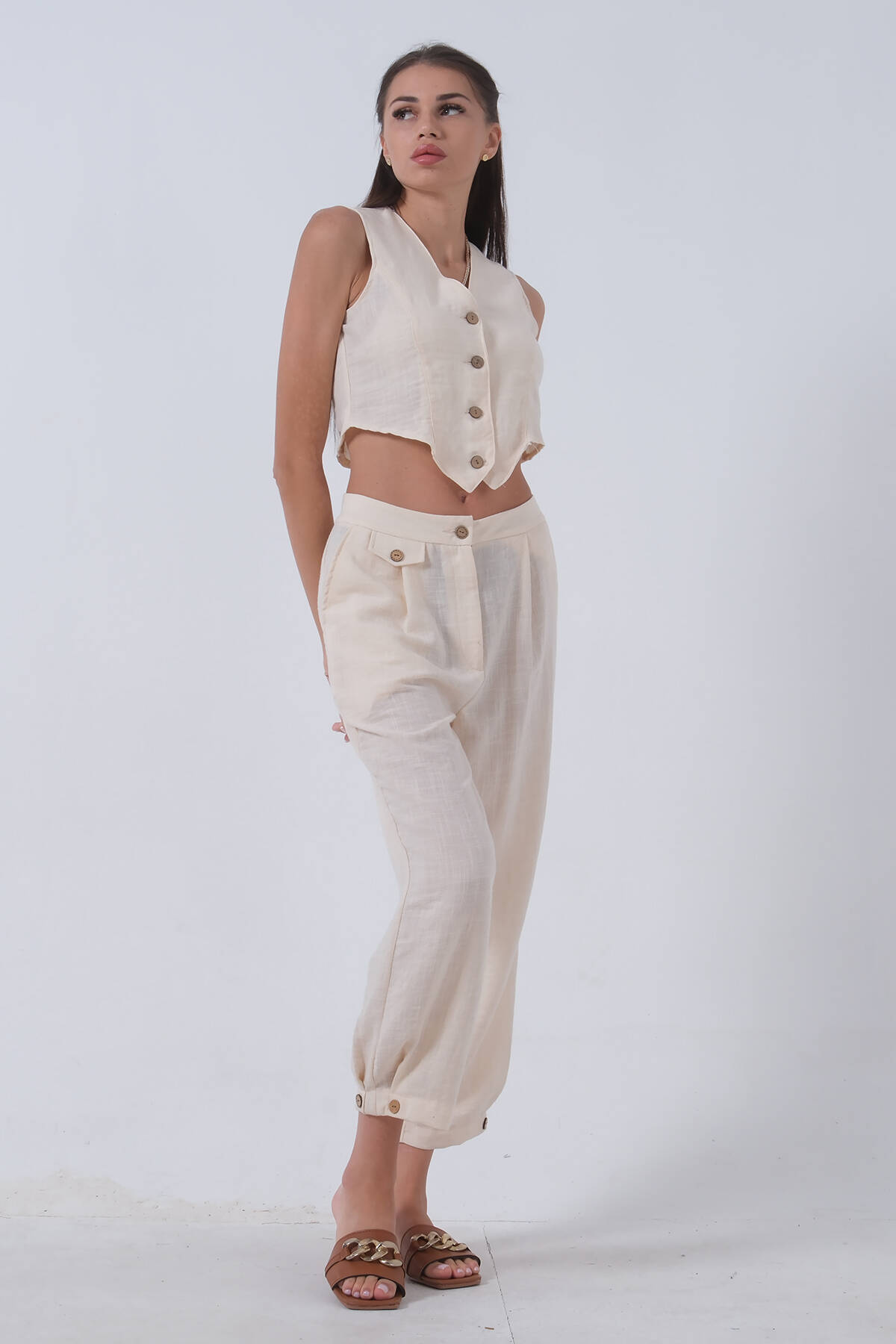 Bej Keten Yelekli Takım 0106321.55