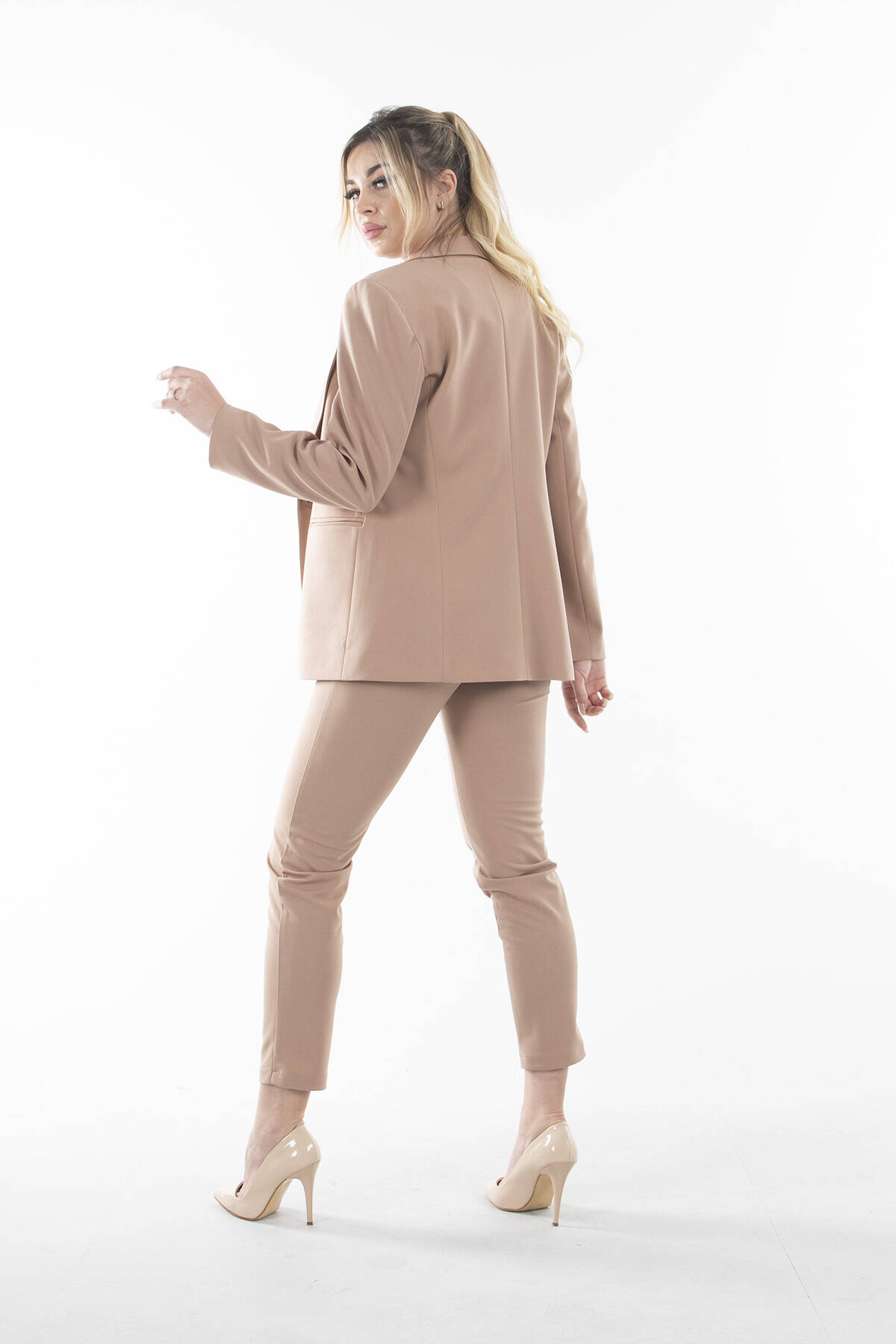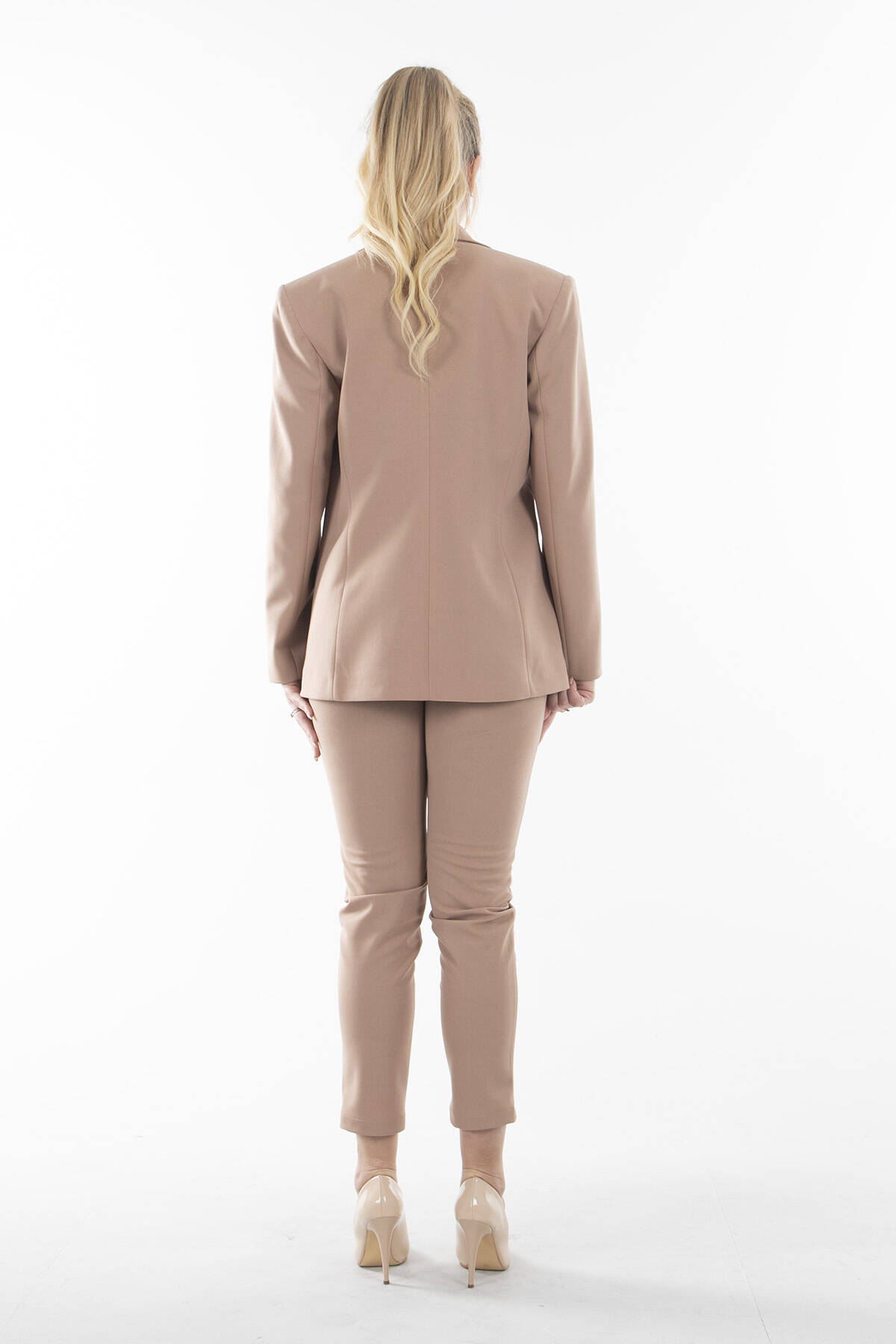Uzun Kol Klasik Yaka Omuzları Vatkalı Önden Tek Düğmeli Çift Cep Görünümlü Astarlı Ceket Yüksek Bel Çift Cepli Boru Paça Pantolonlu Takım