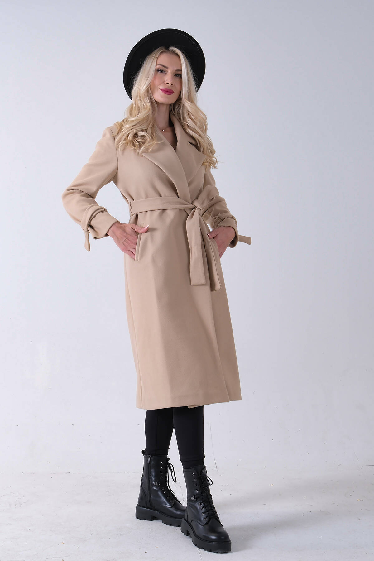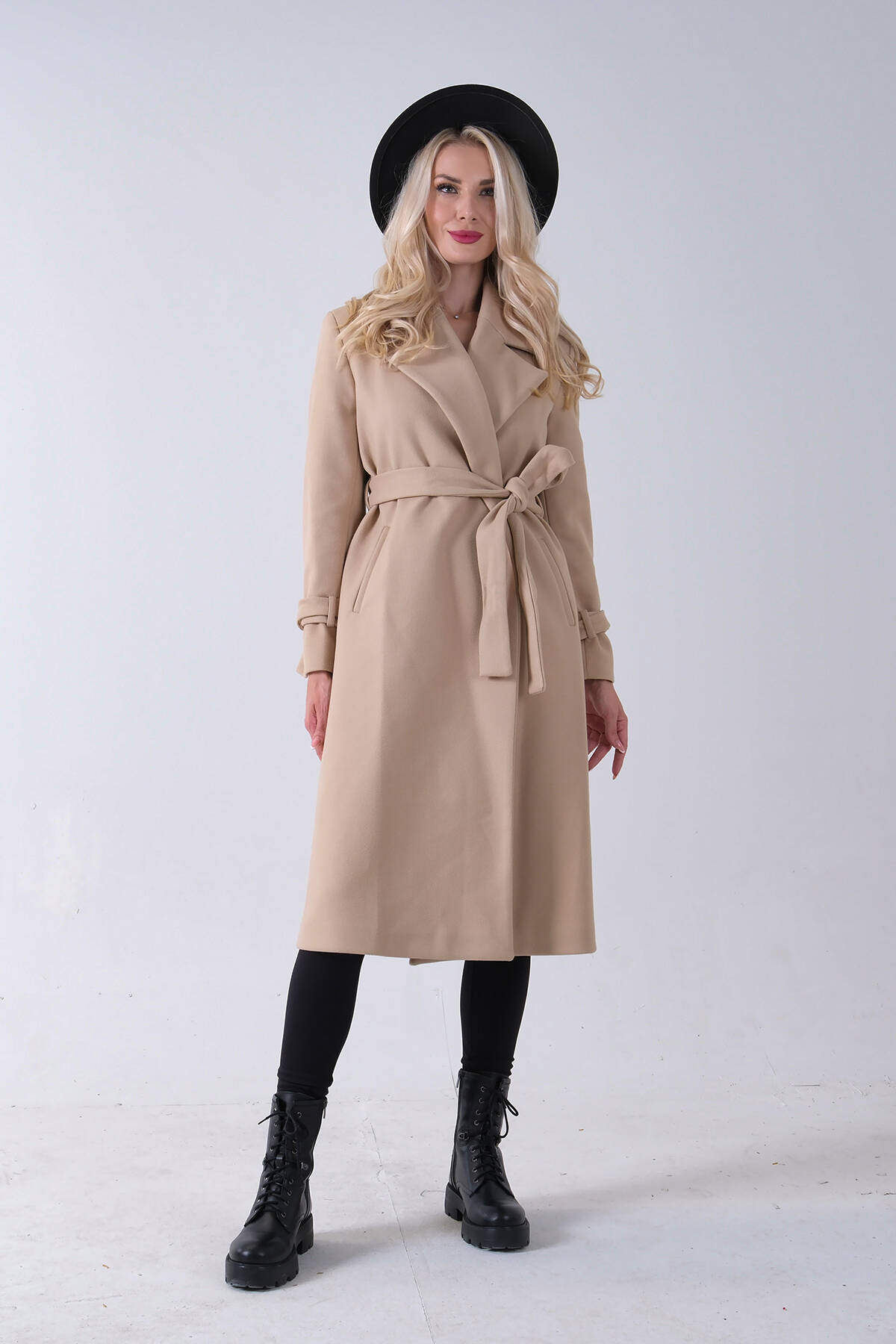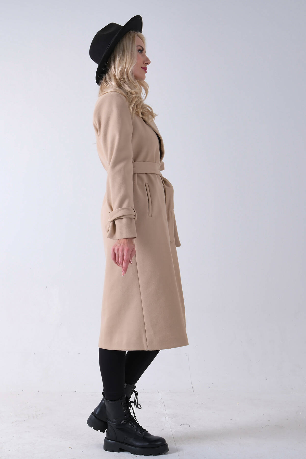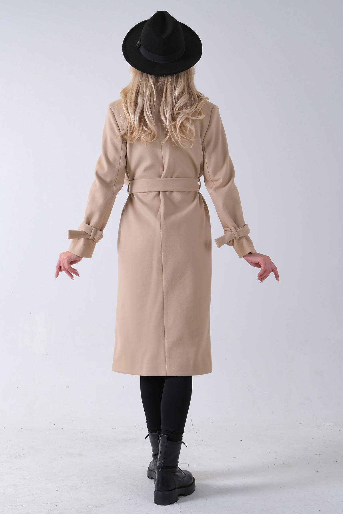 Bej Kol Bağlamalı Seyyar Kuşaklı Uzun Kaşe Kaban 41630051.55