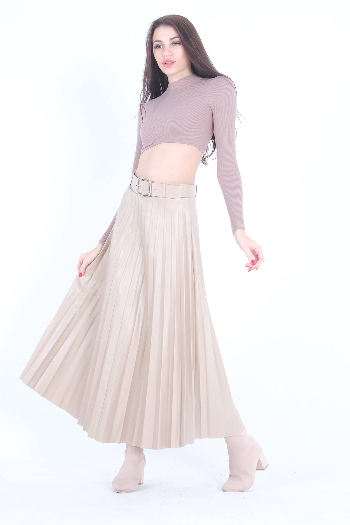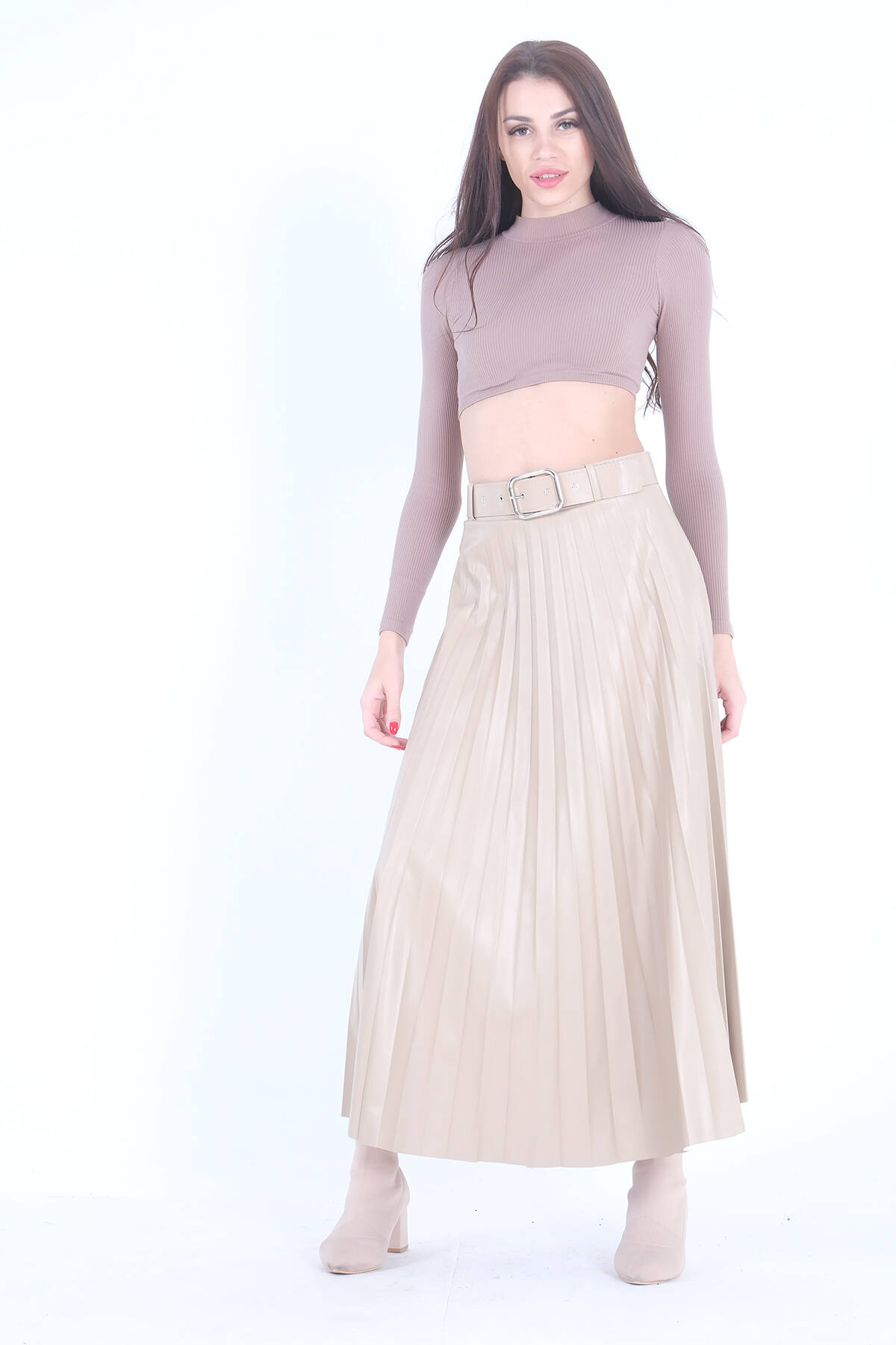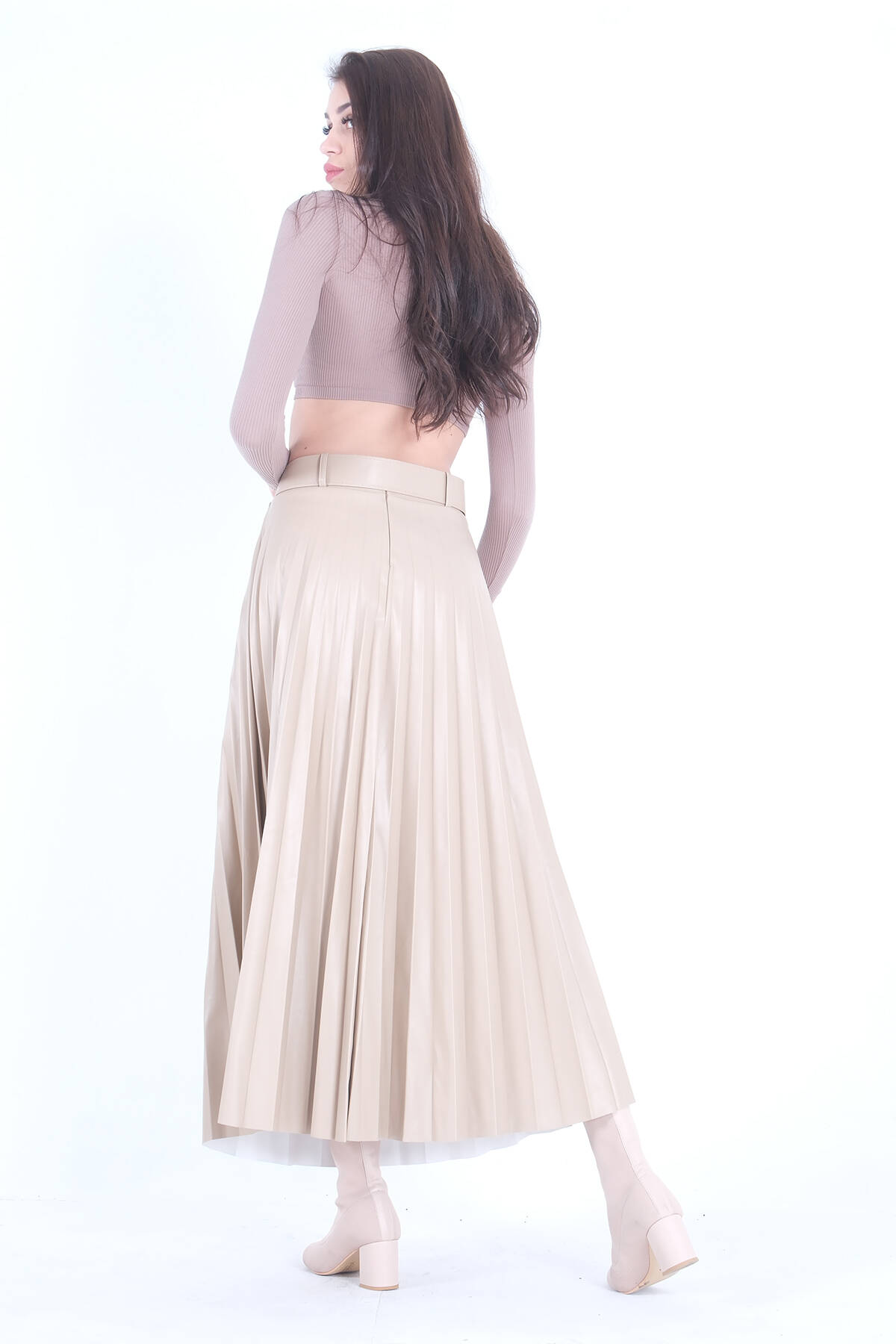 Bej Pliseli Deri Etek 4591002.55