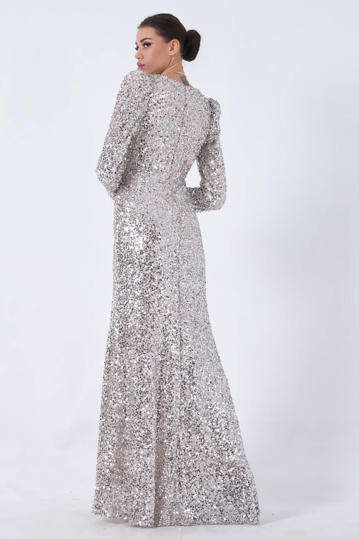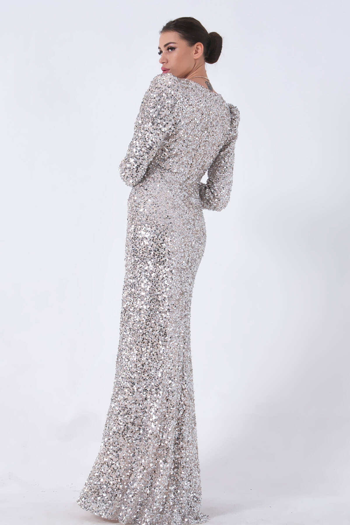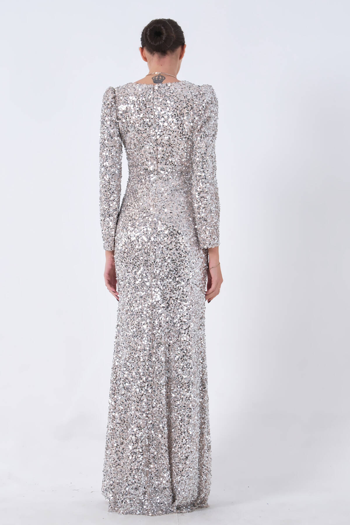 Gri Önü Taş Detaylı Yırtmaçlı Pul Payet Straplez Abiye 0801163.06