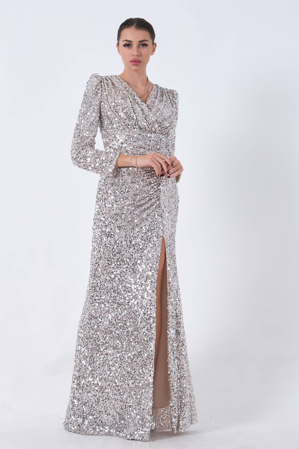 Bej Pul Payetli Drapeli Önü Yırtmaçlı Abiye 9705393.55