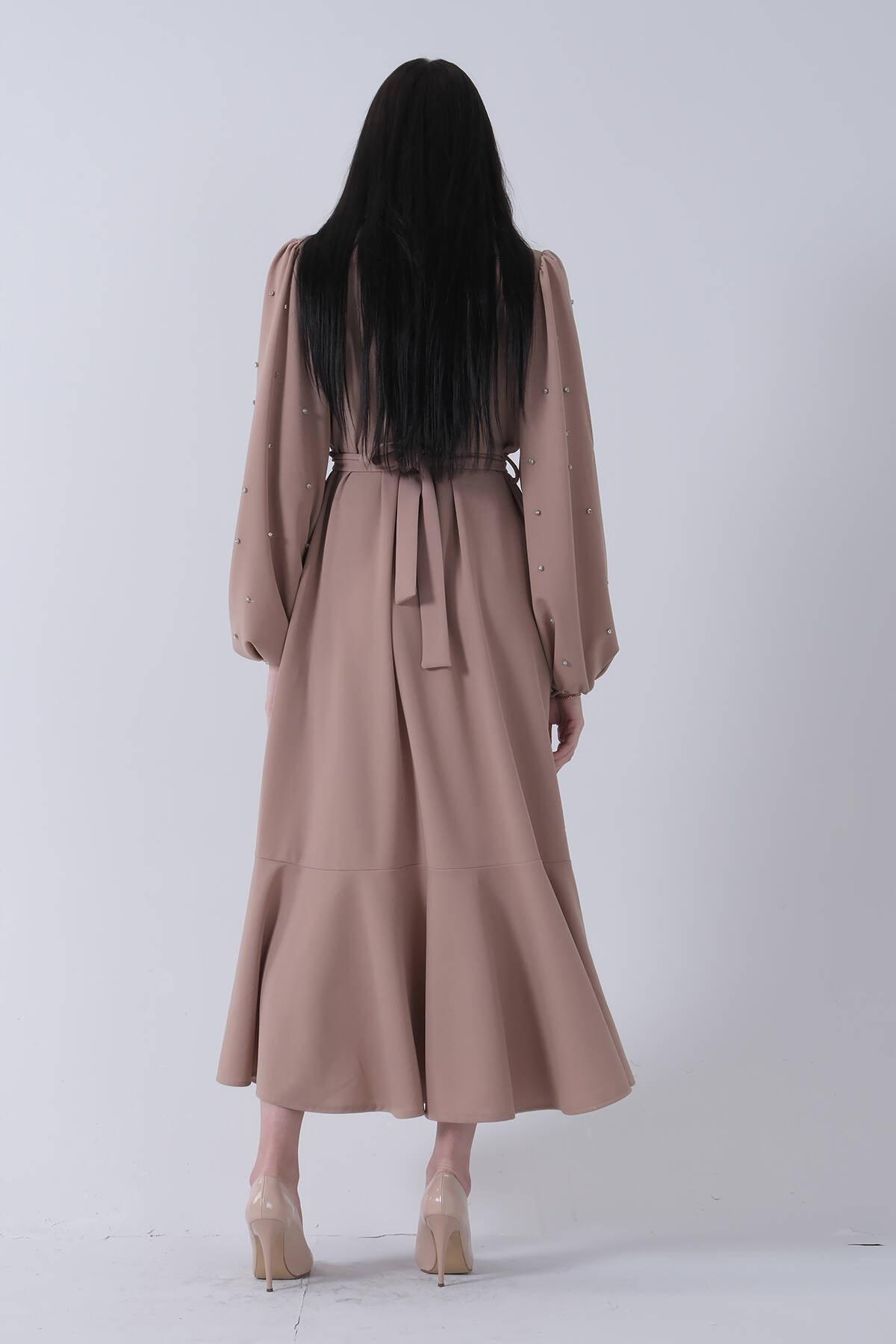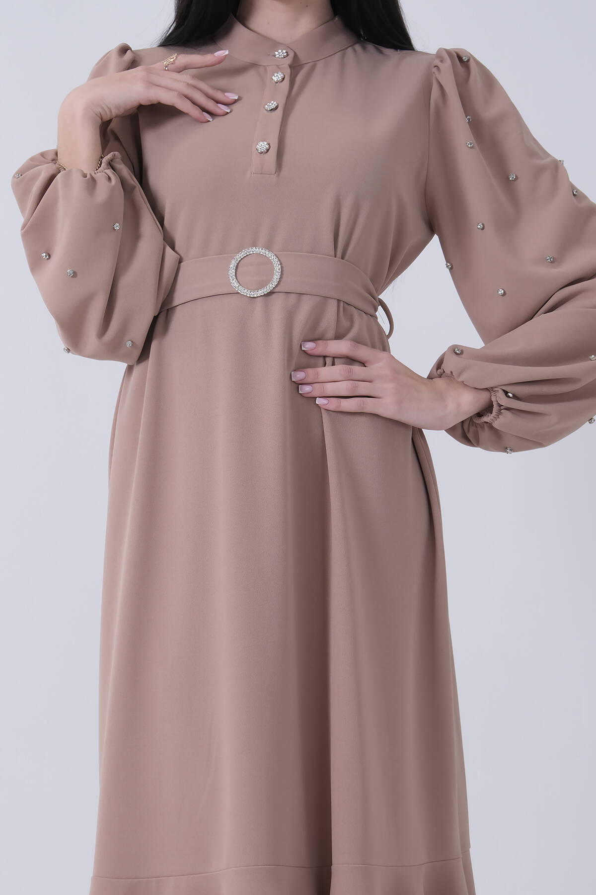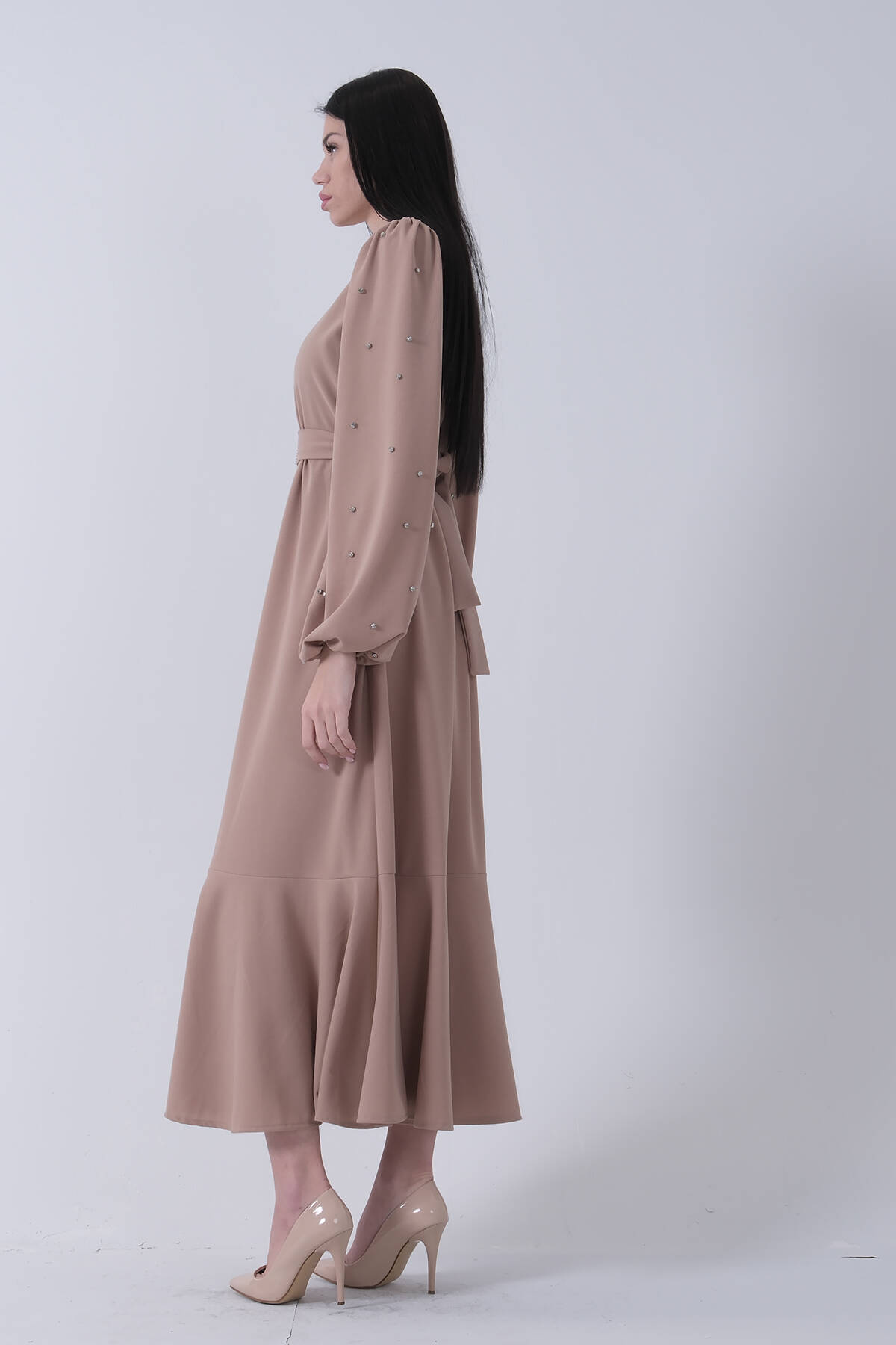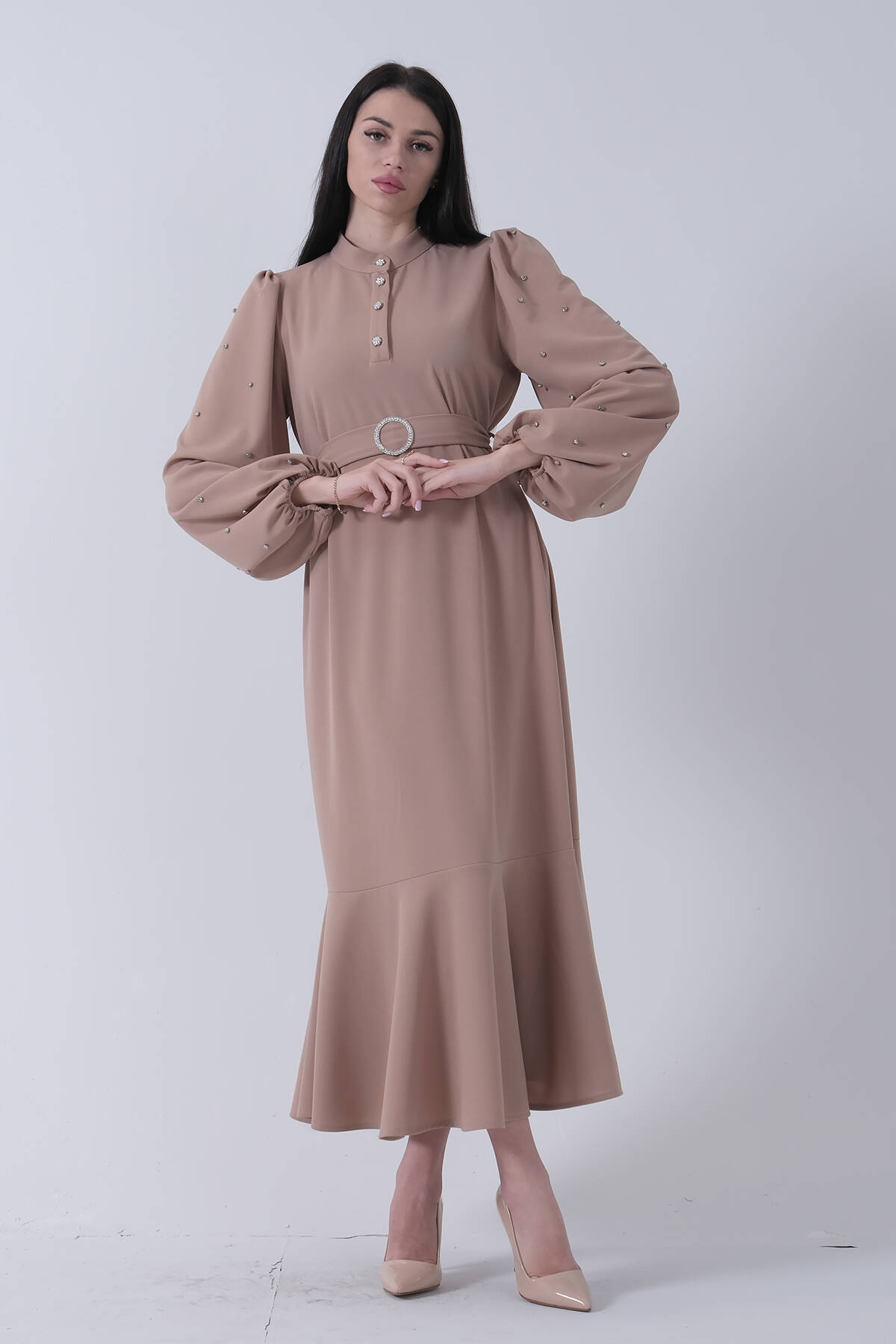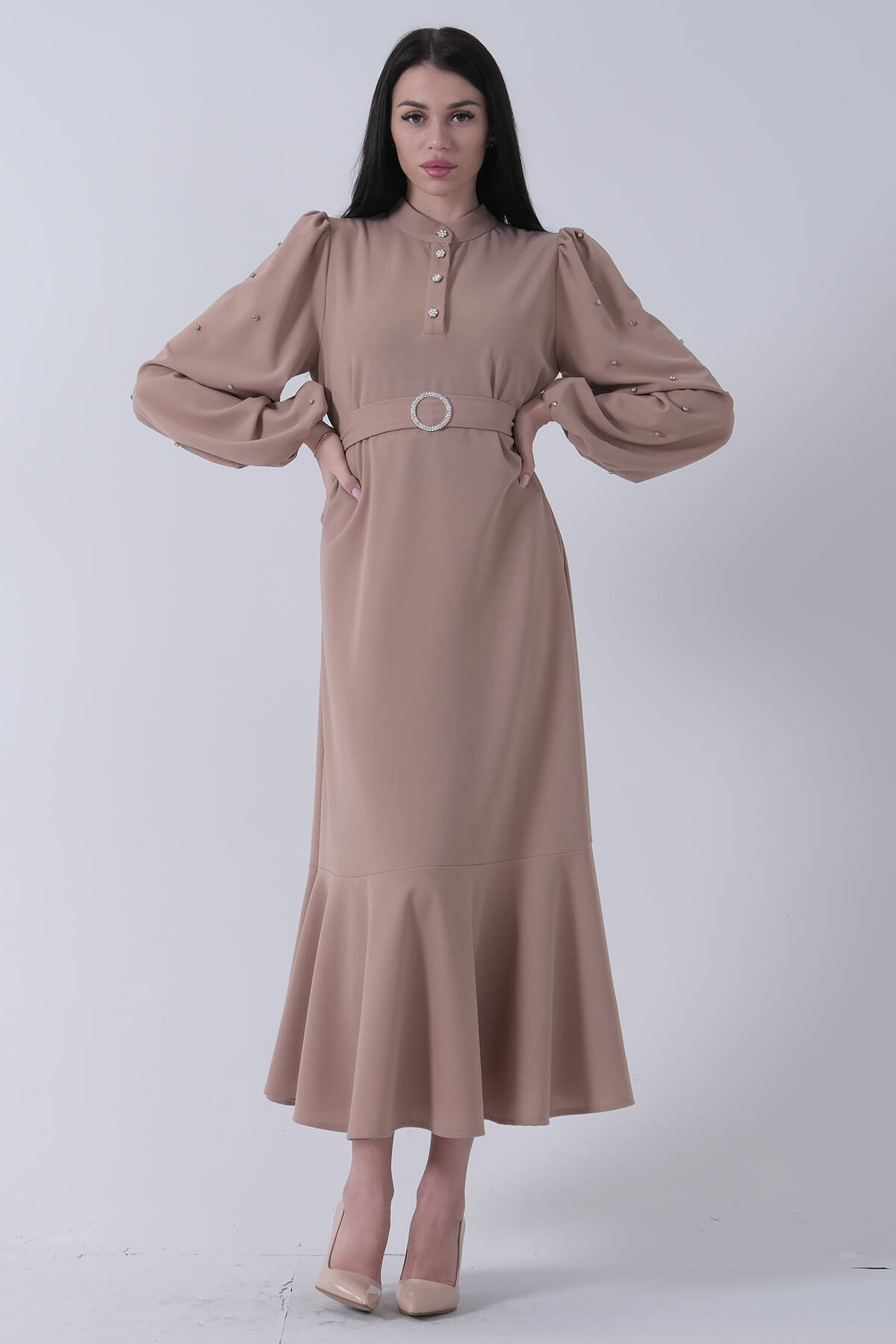 Bej Taş Detaylarla Süslenmiş Şık Elbise 4673002.55