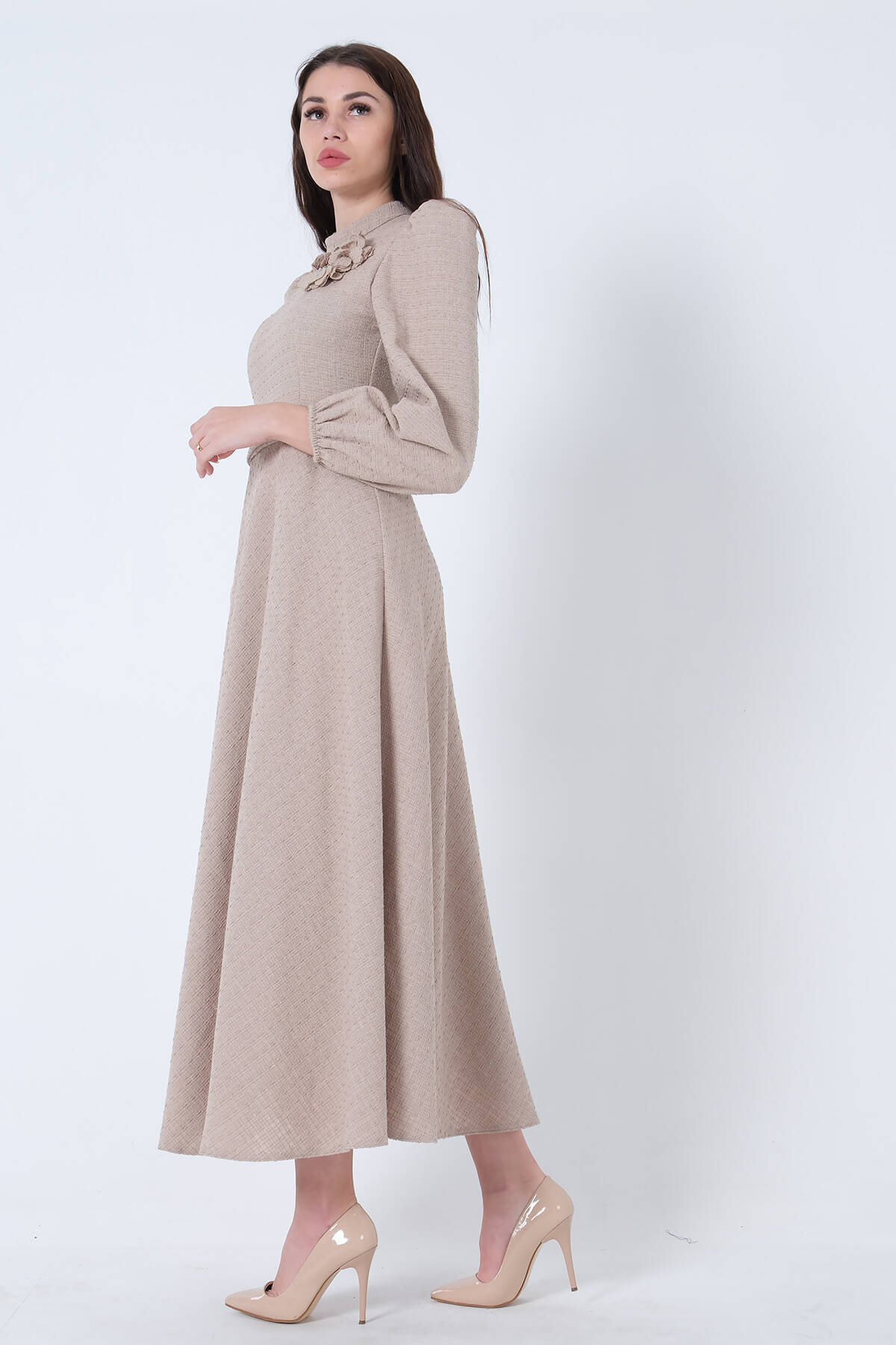 Bej Bisiklet Yaka Kendinden Şal Detaylı Broşlu Bel Bağlamalı Elbise 4571580.55