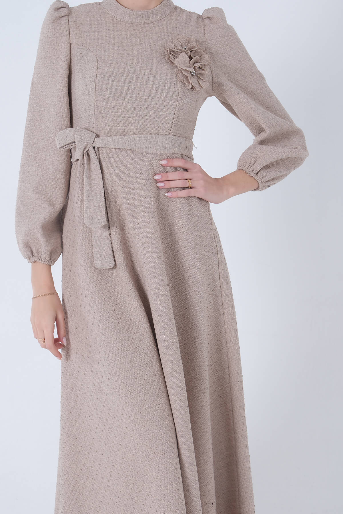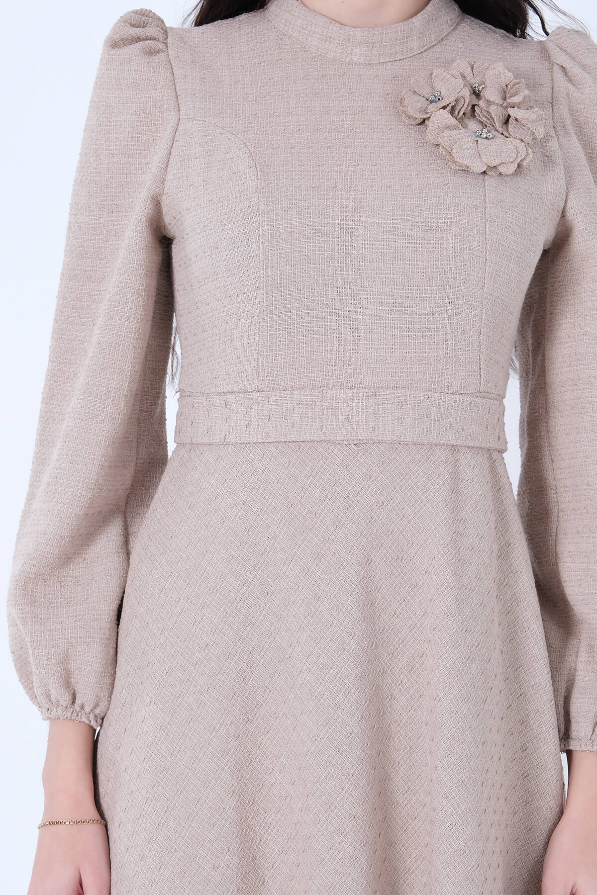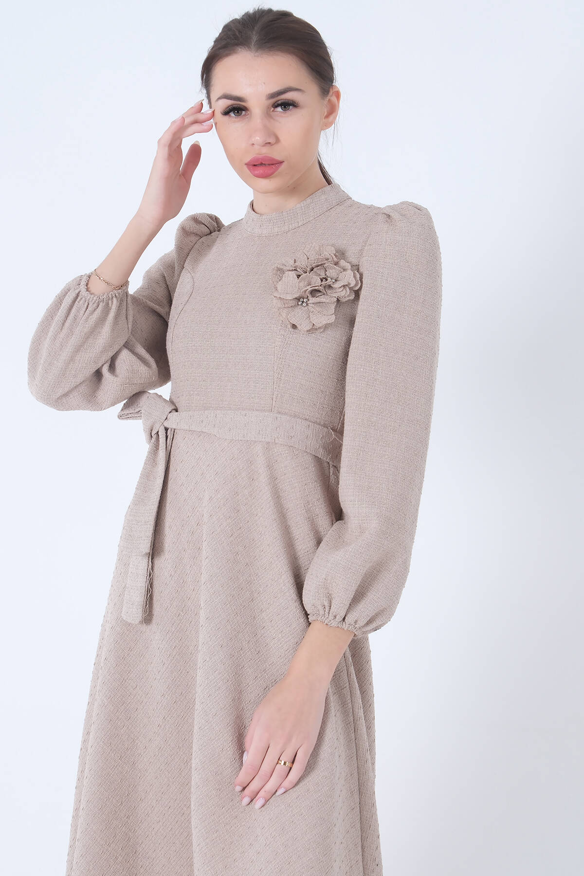 Bej Tüvid Kumaş Çiçek Detaylı Kolları Lastikli Seyyar Kuşaklı Elbise 4593267.55