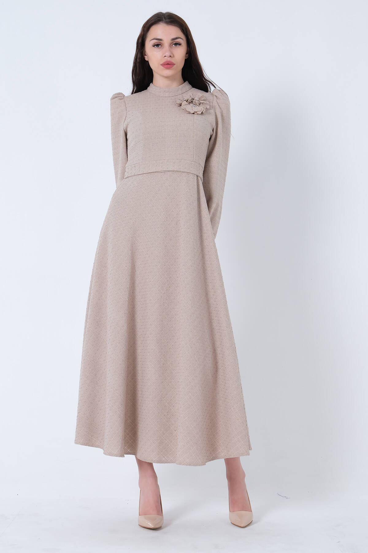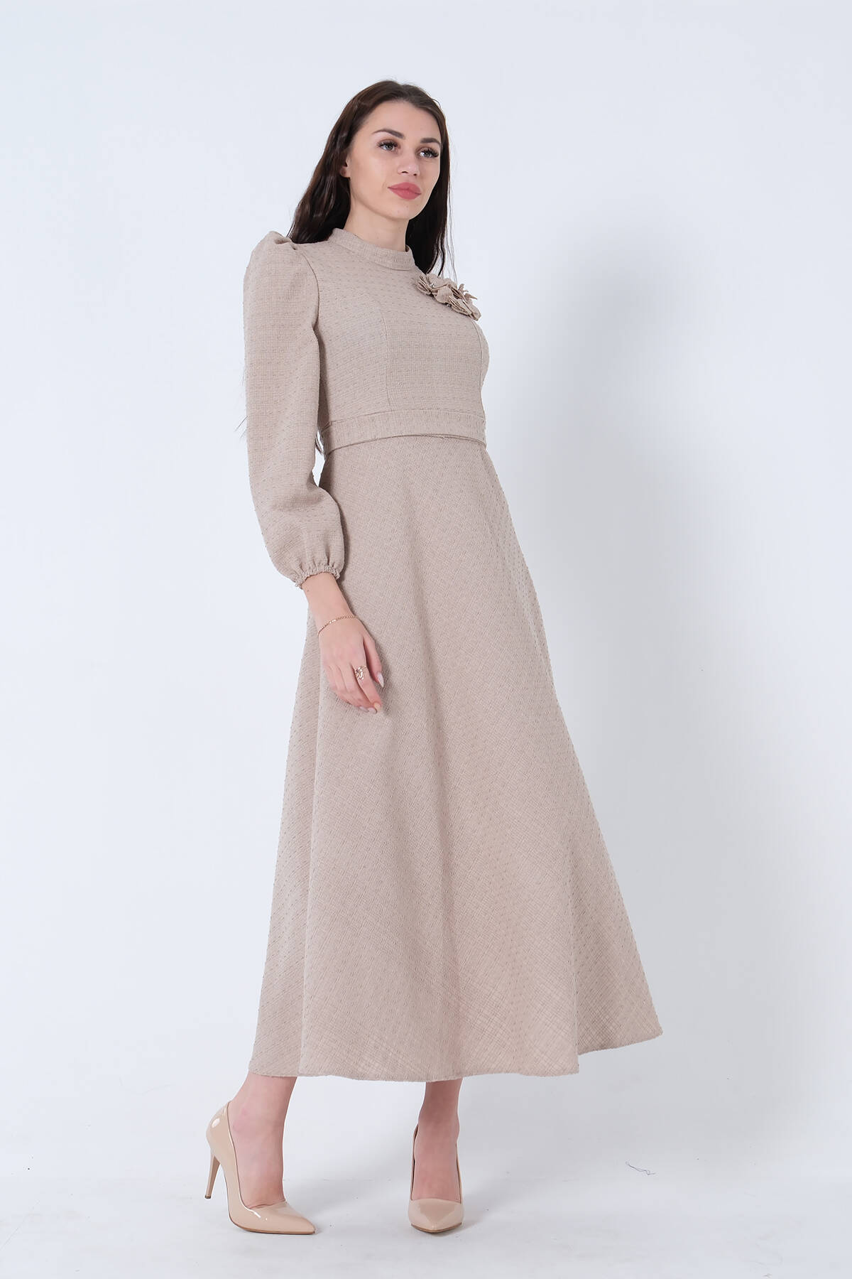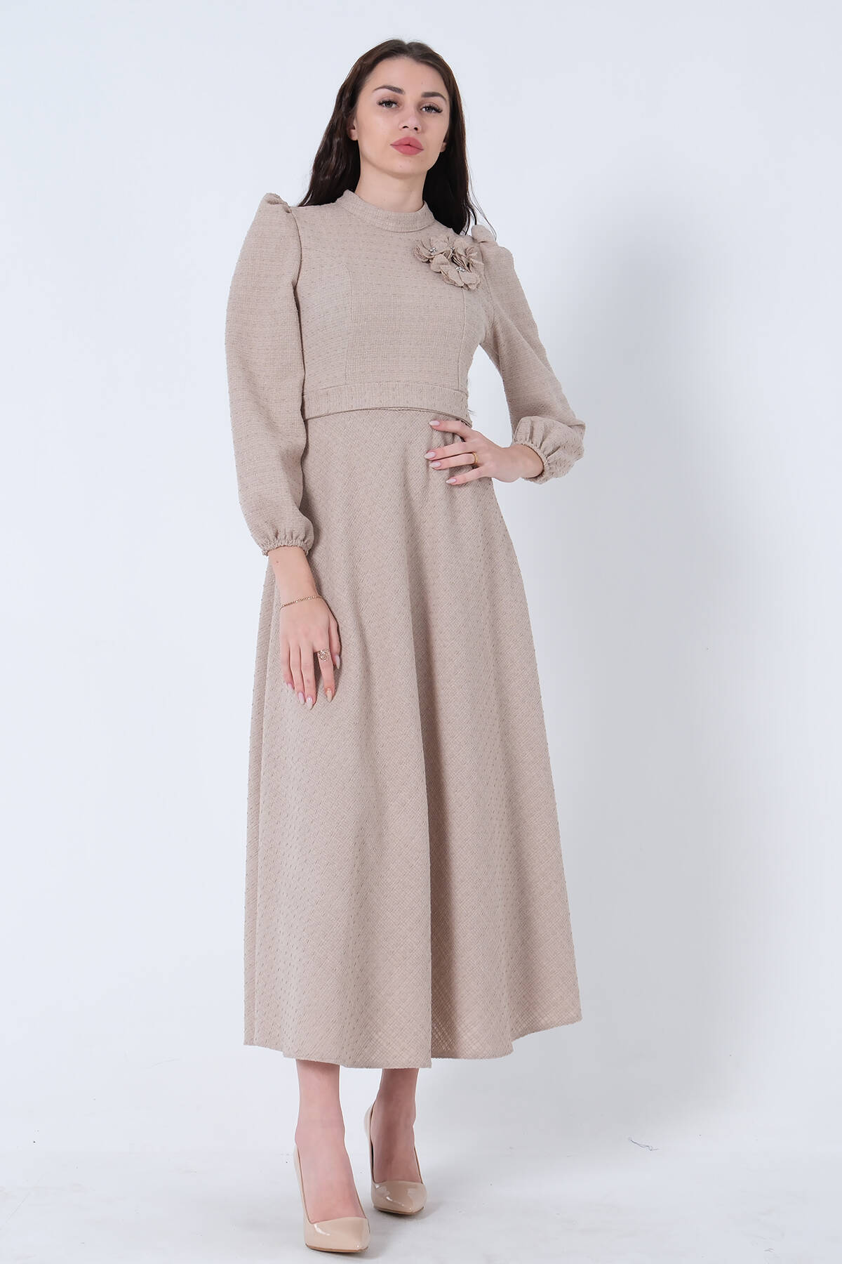 Bej Tüvid Kumaş Çiçek Detaylı Kolları Lastikli Seyyar Kuşaklı Elbise 4593267.55
