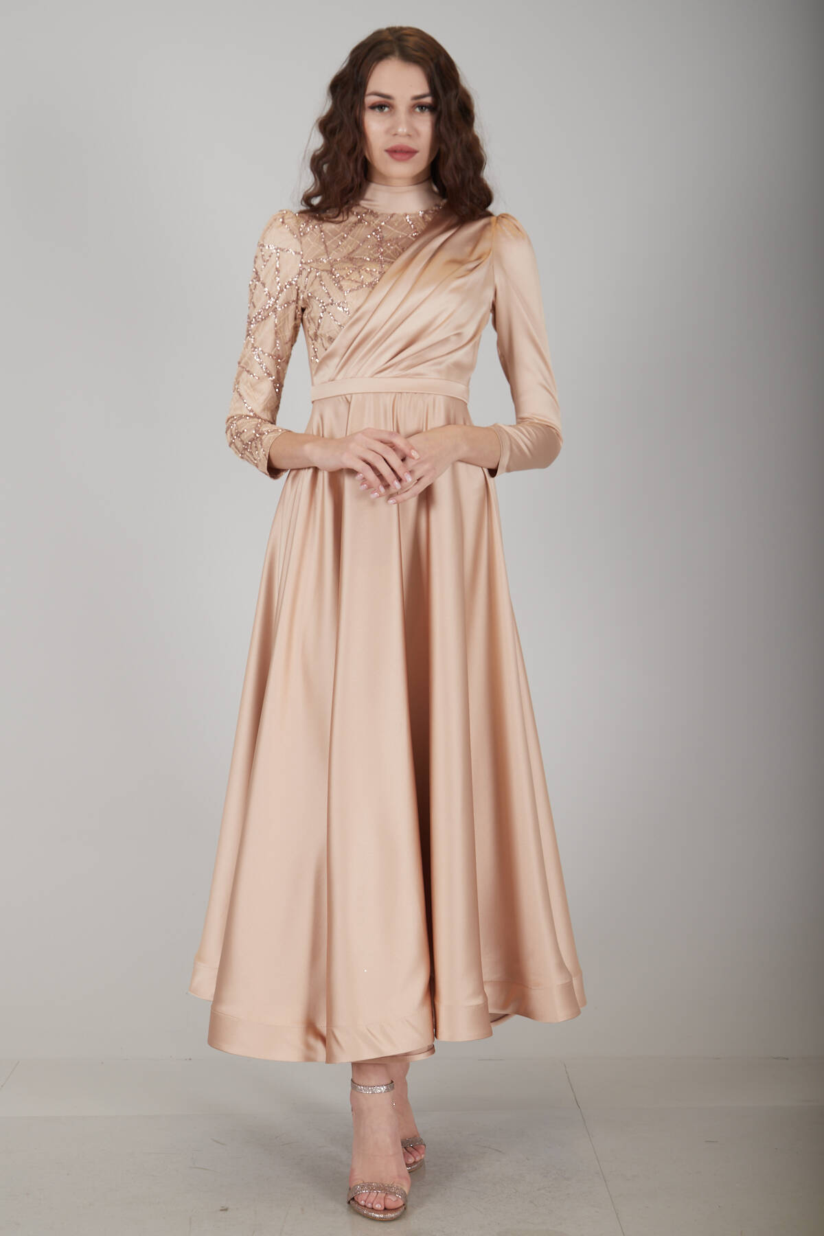 Uzun Kol Dik Yaka Göğüsü Drapeli Balenli Üzeri Sim Detaylı Astarlı Tesettür Saten Abiye Elbise