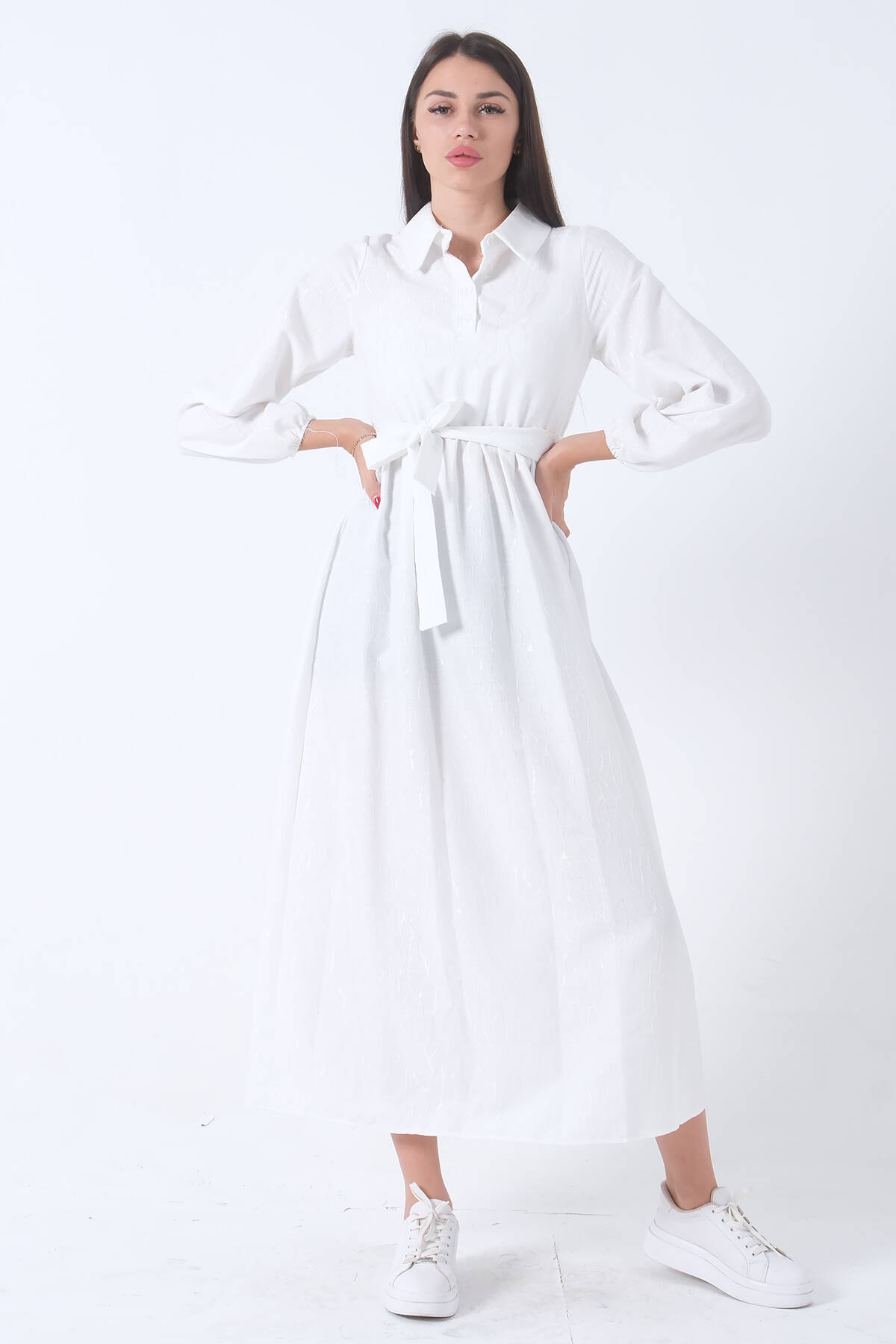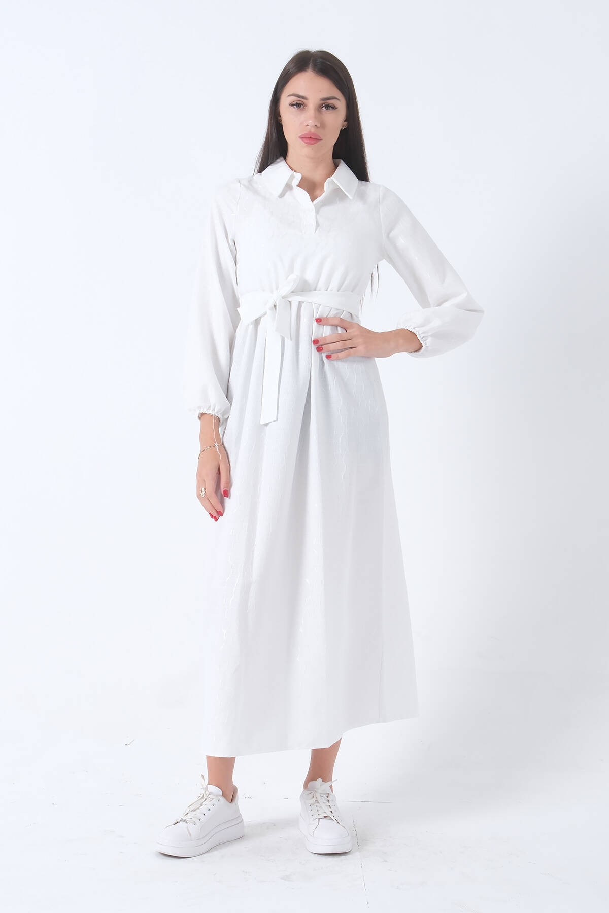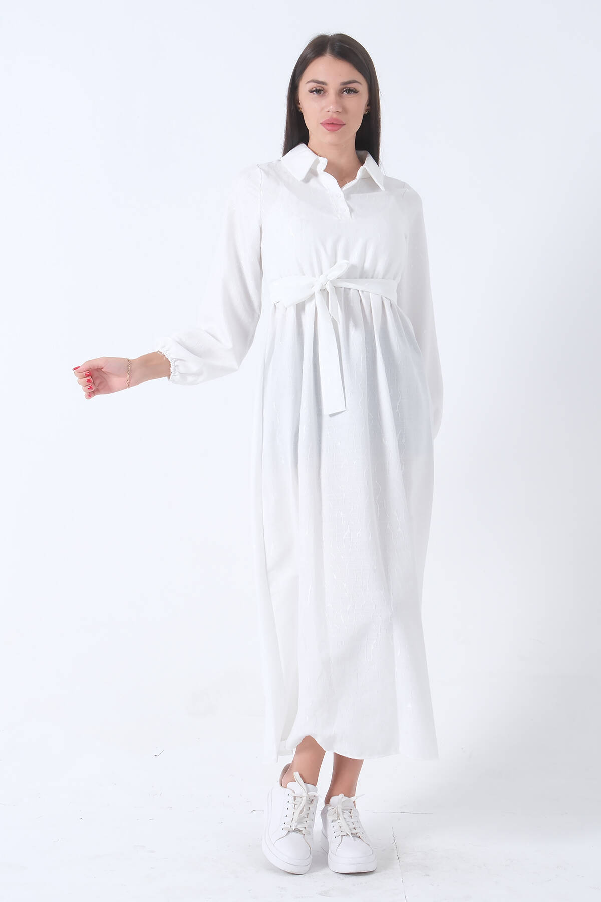 Beyaz Beli Lastikli Gömlek Yaka Kuşaklı Tesettür Elbise 4593296.15