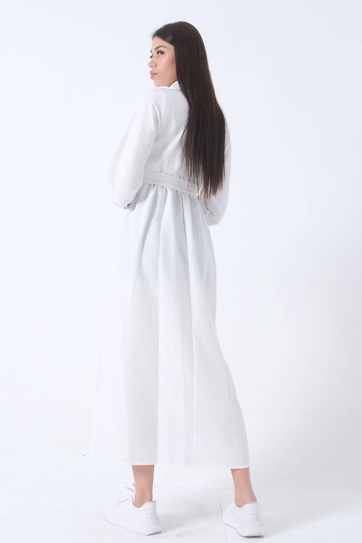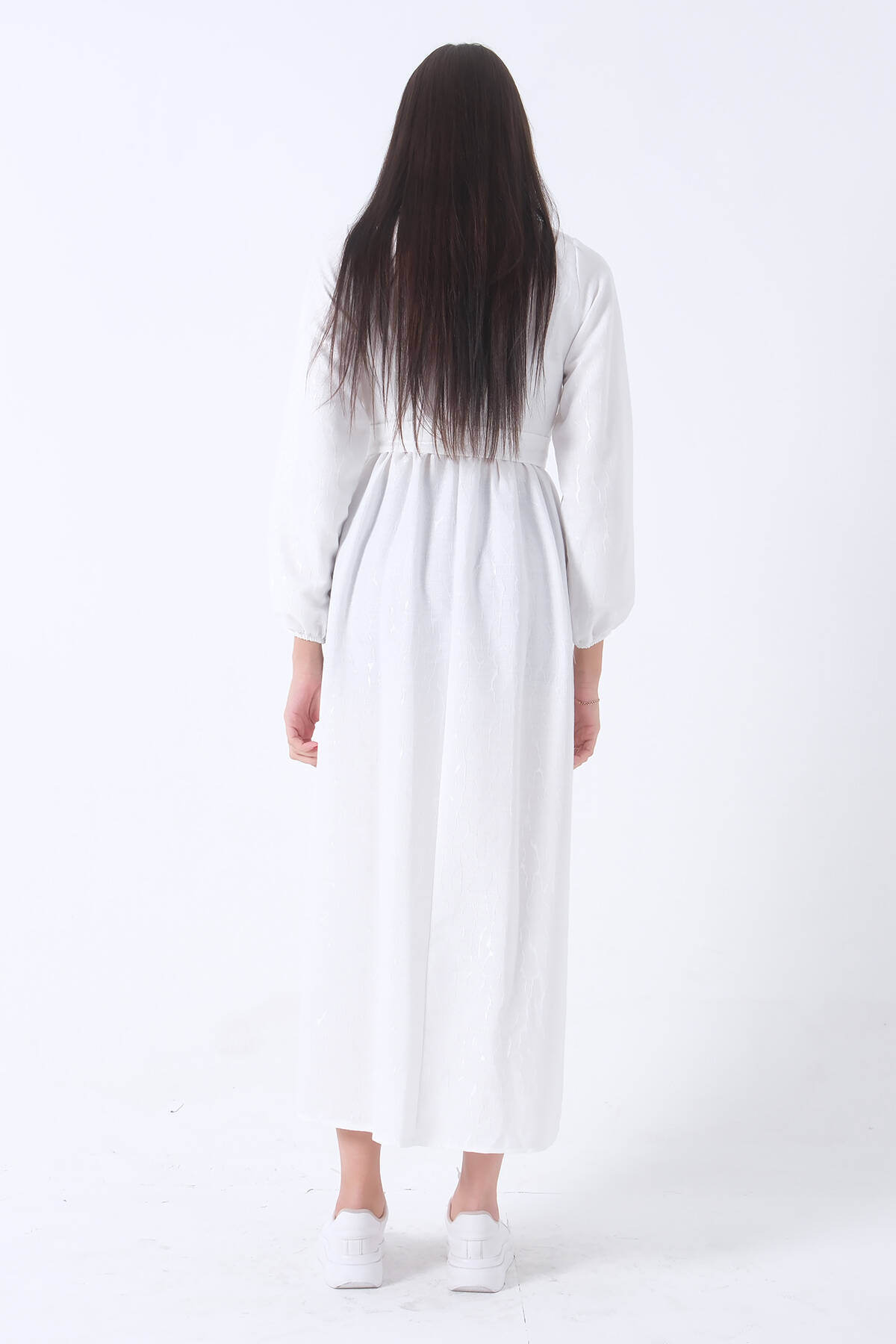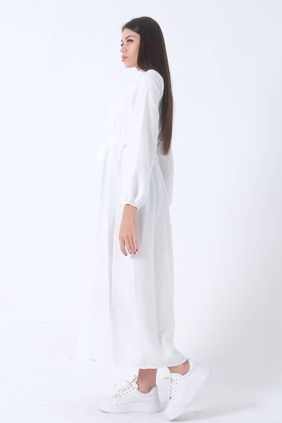 Beyaz Beli Lastikli Gömlek Yaka Kuşaklı Tesettür Elbise 4593296.15