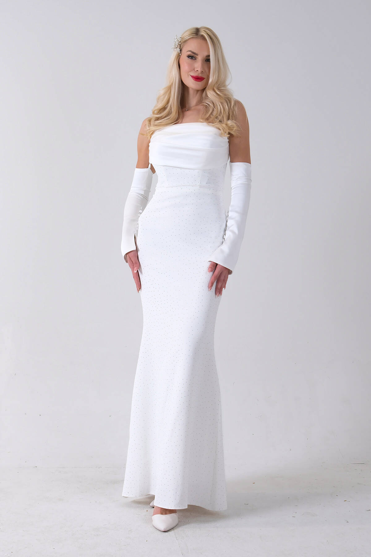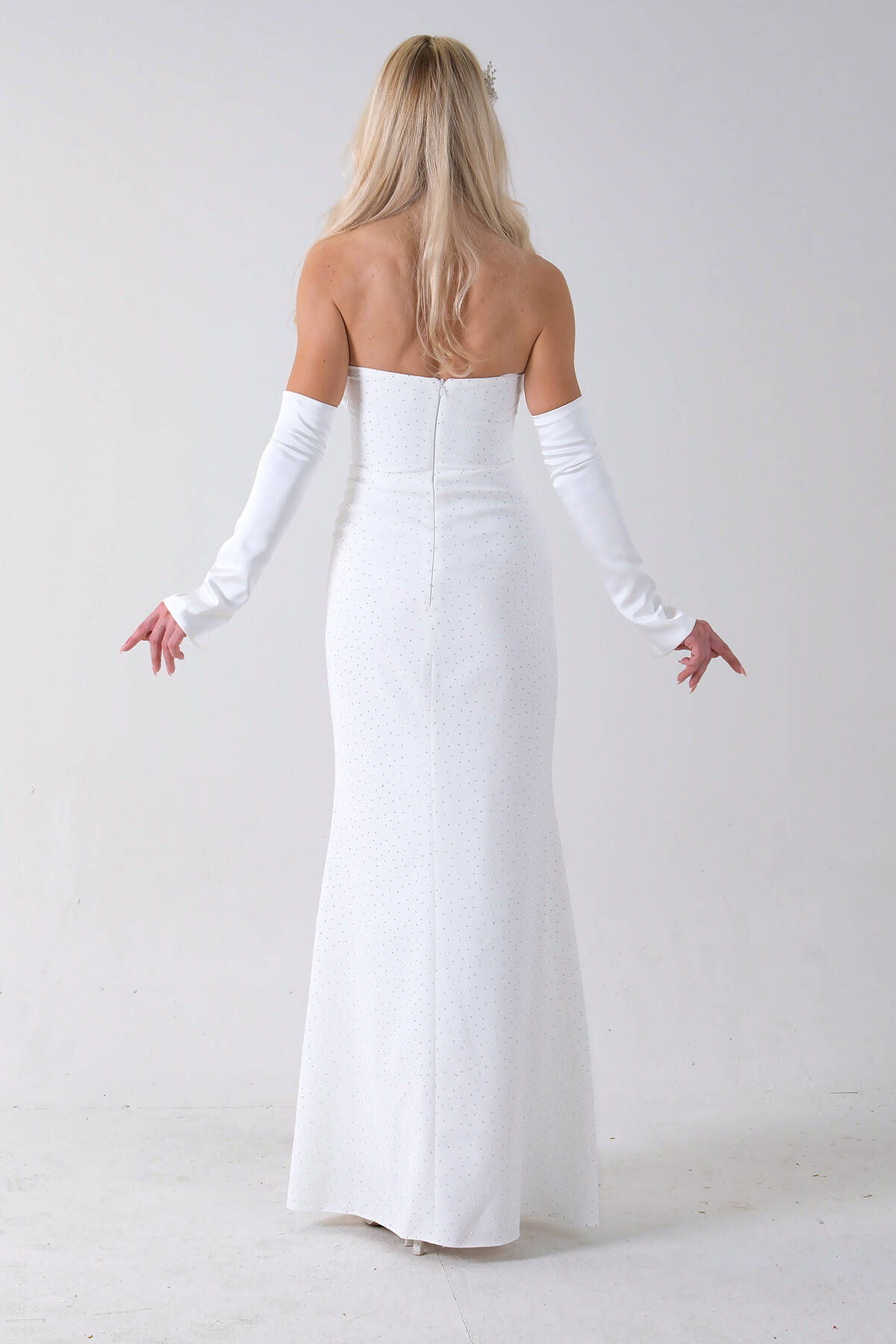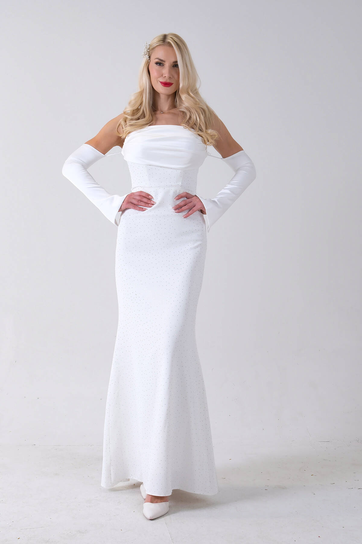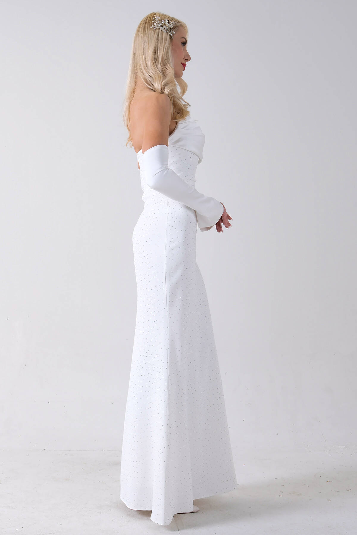 Beyaz Drapeli Üzeri Işıltı Nokta Detaylı Kollu Abiye 0802502.15