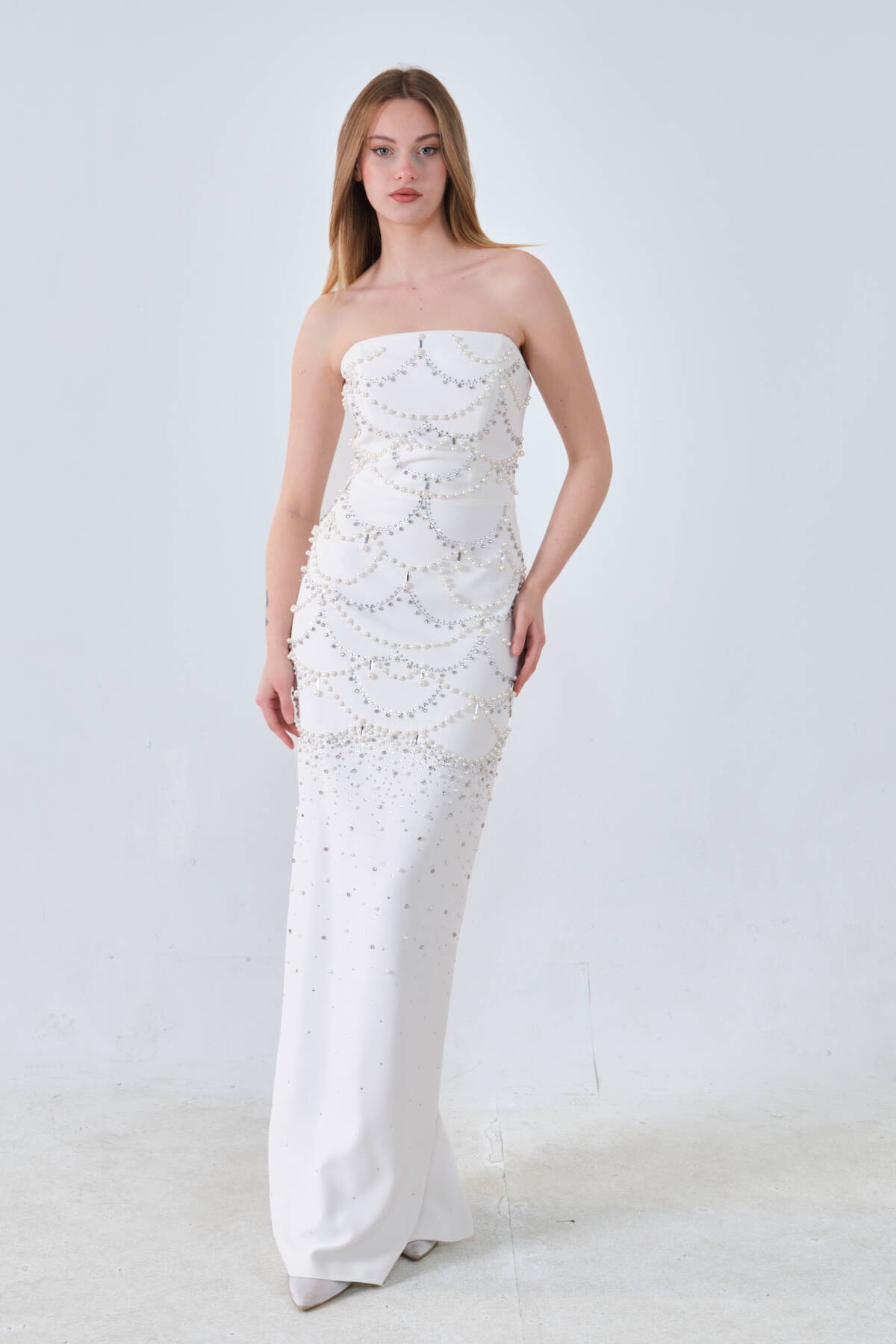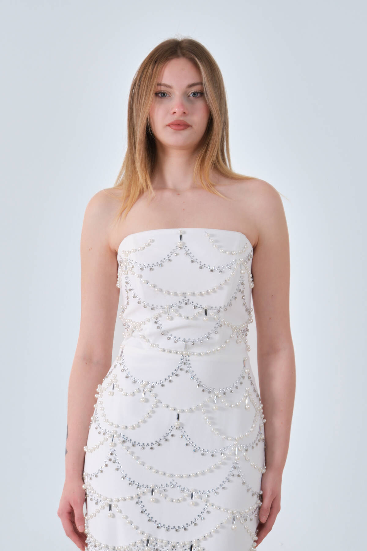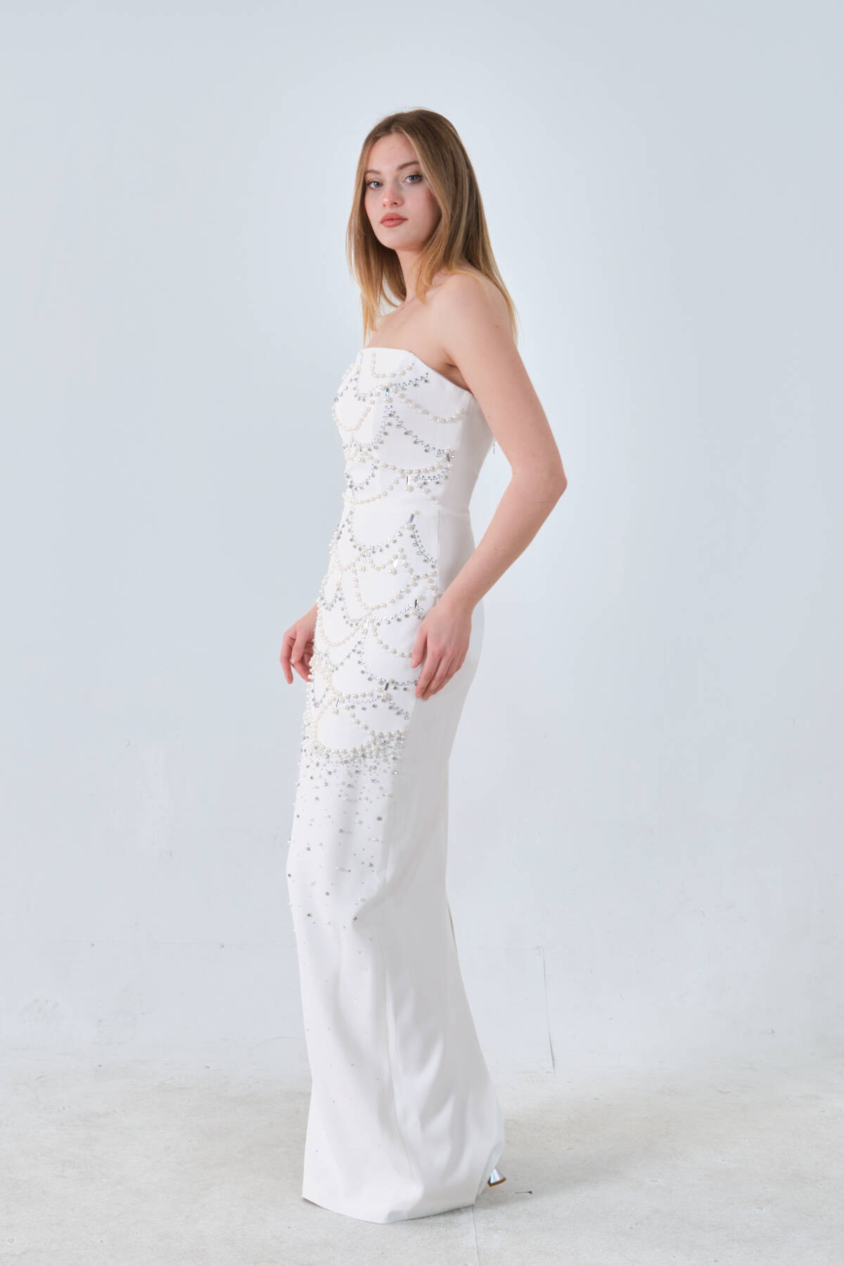 Beyaz İnci ve Kristal Taş İşlemeli Straplez Abiye 0801139.15