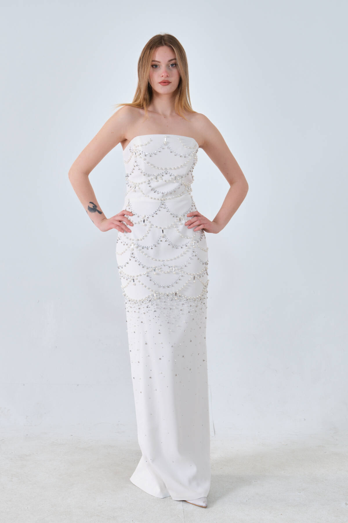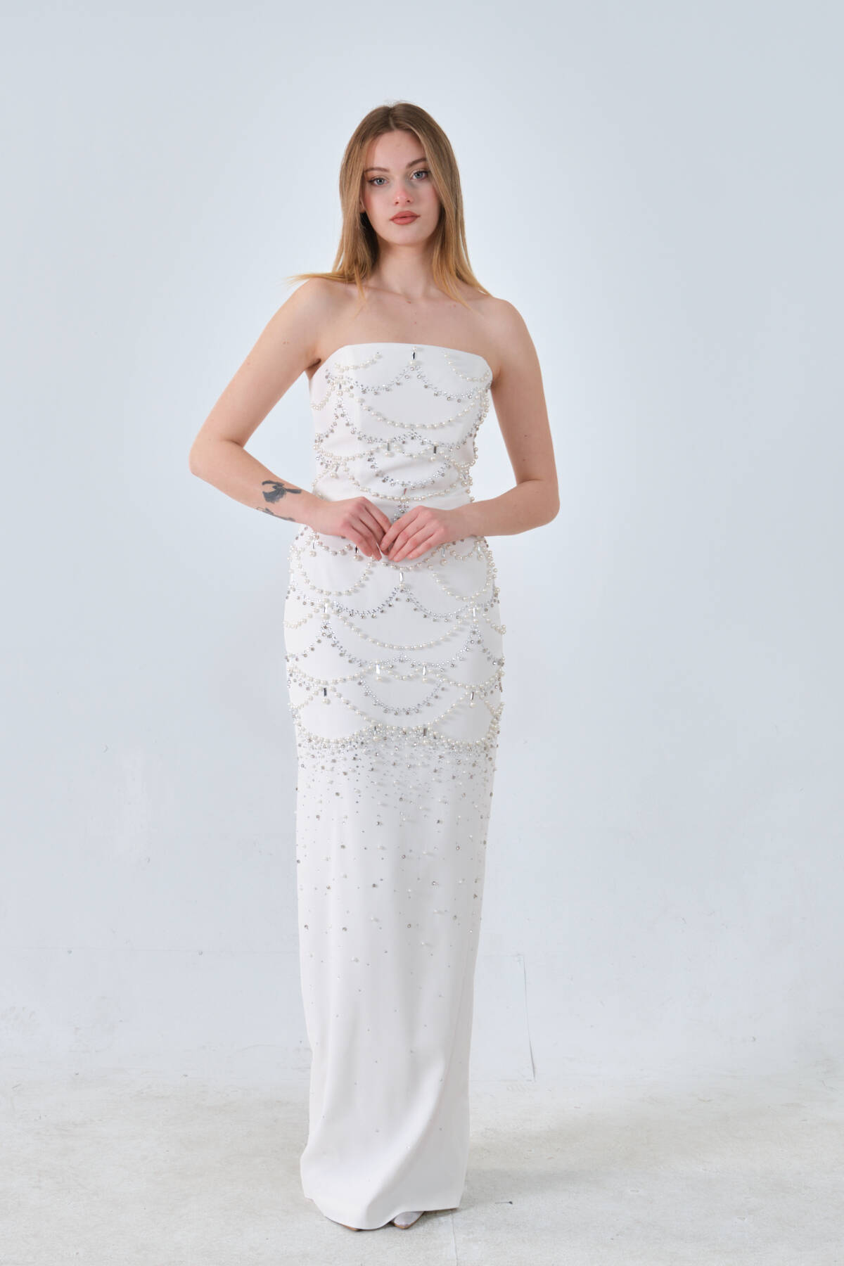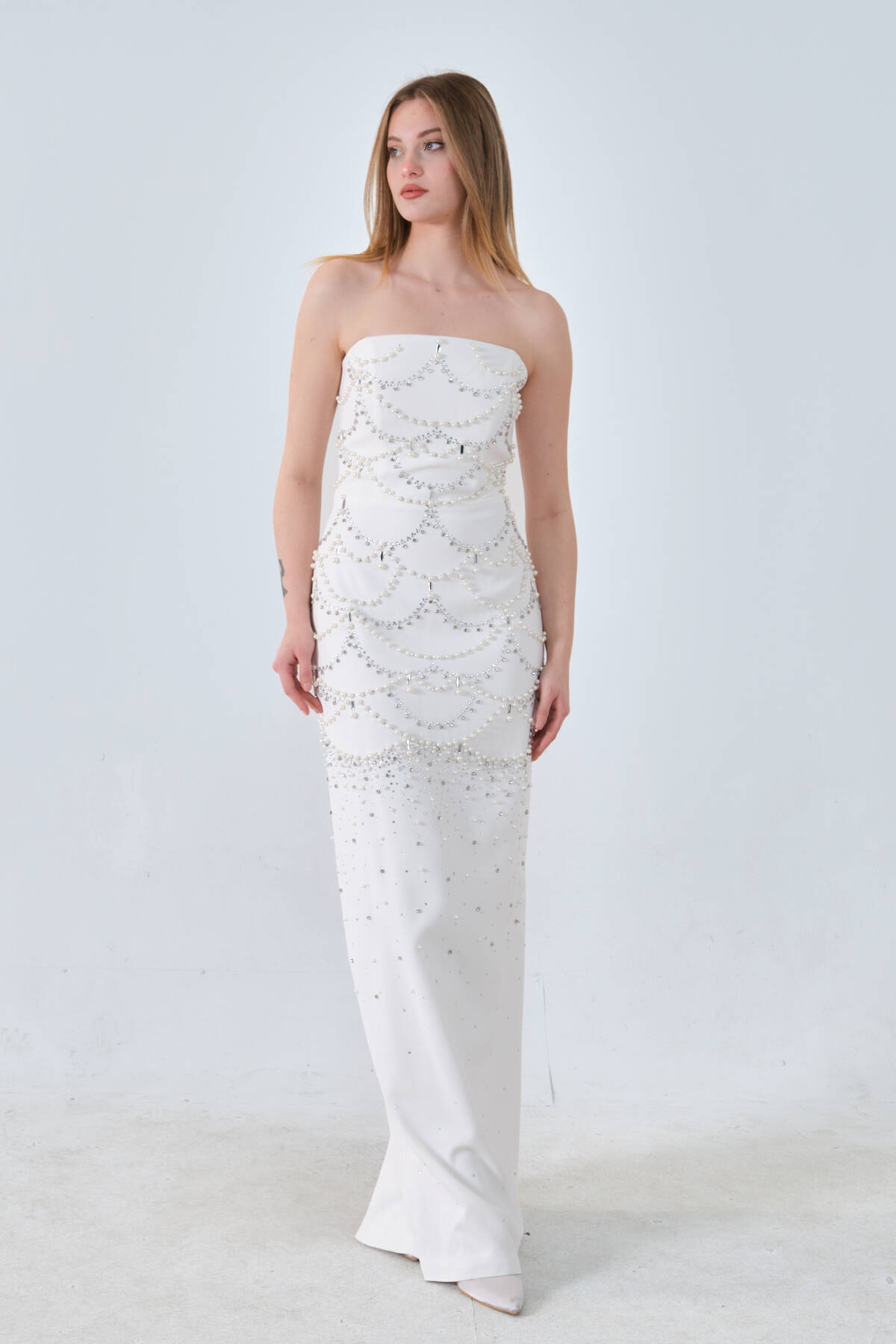 Beyaz İnci ve Kristal Taş İşlemeli Straplez Abiye 0801139.15