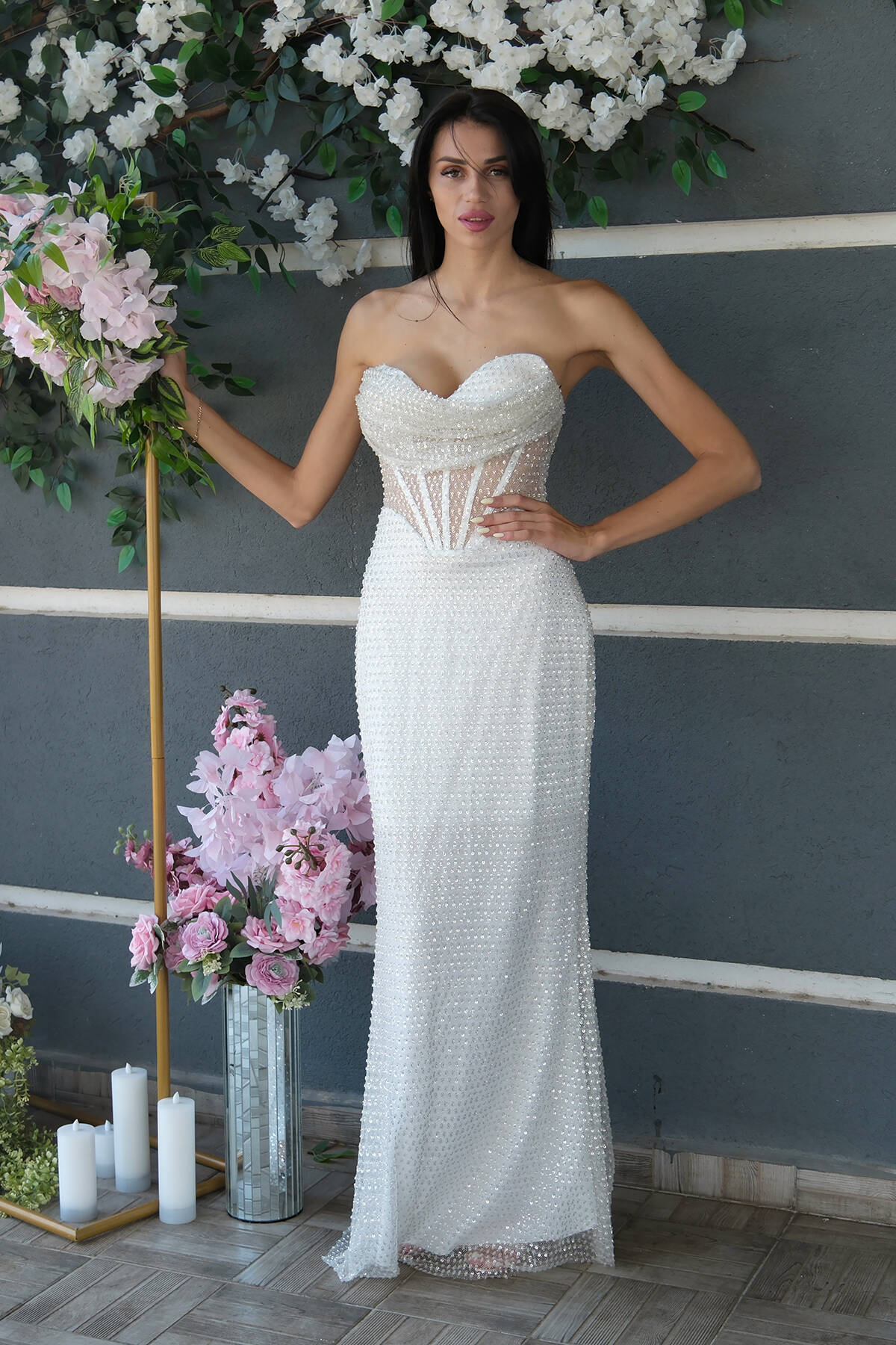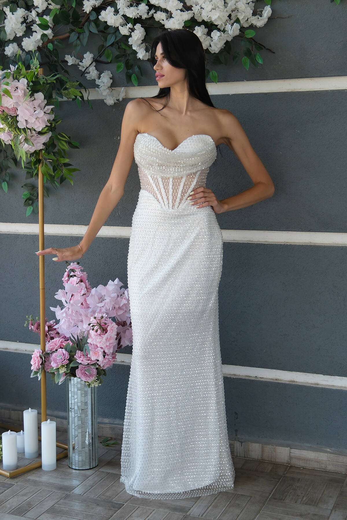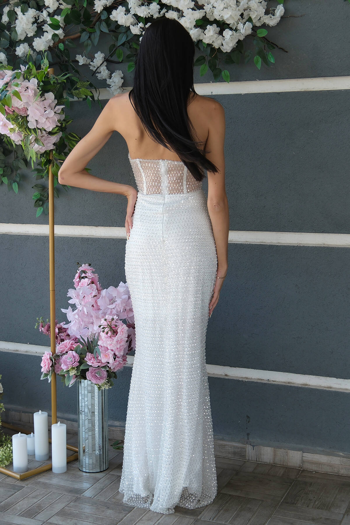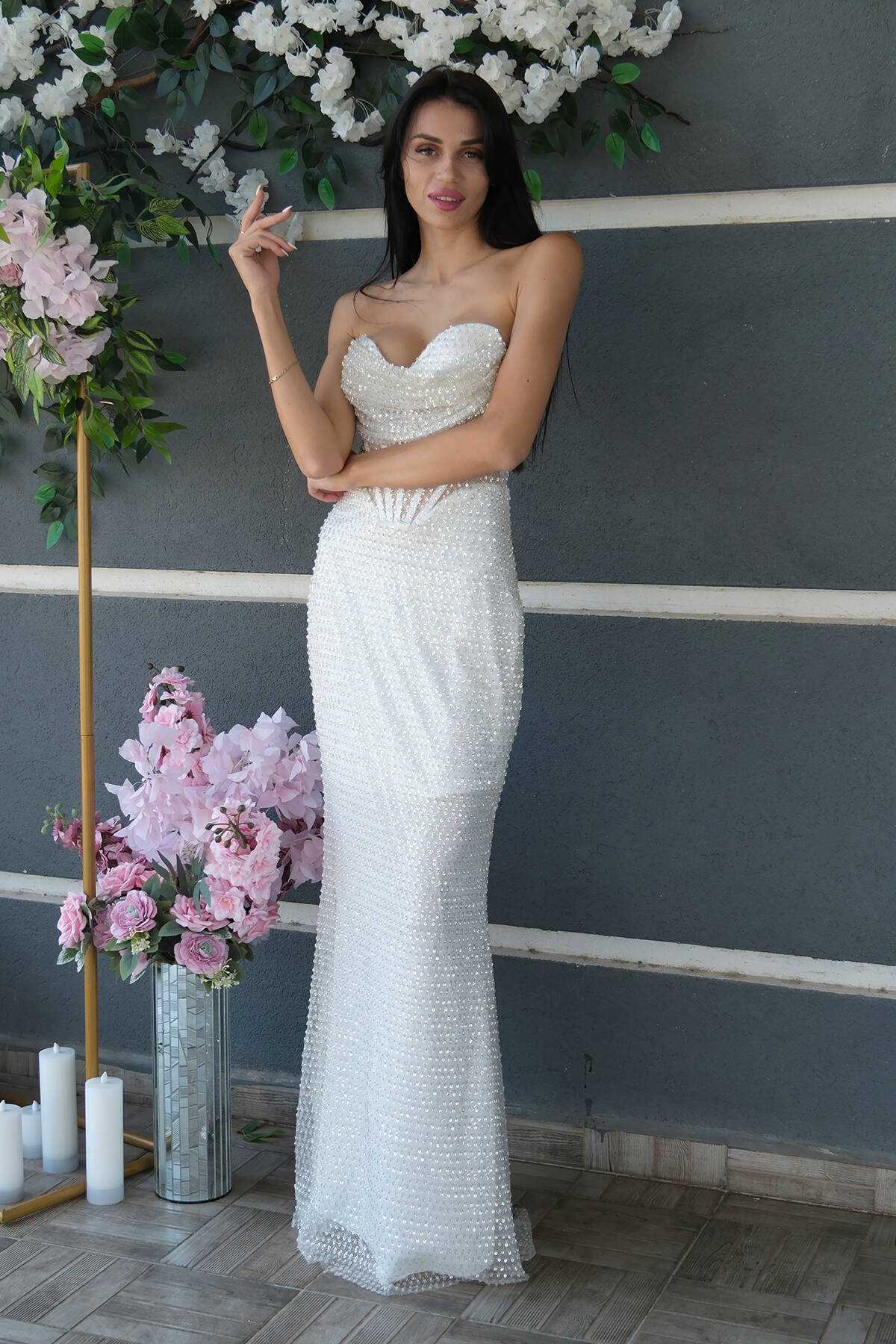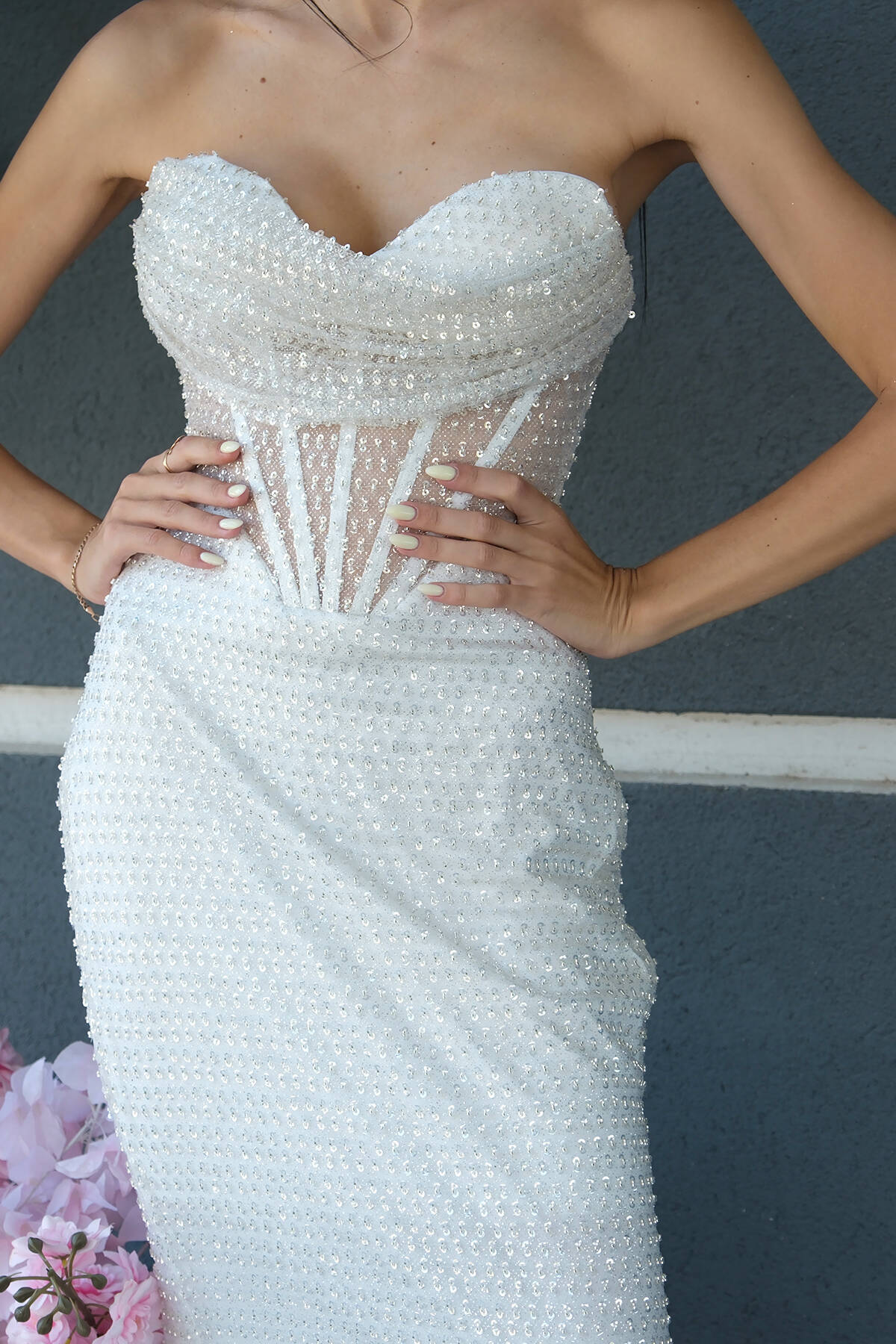 Beyaz Pul Taş İşlemeli Straplez Balık Abiye 9705304.15