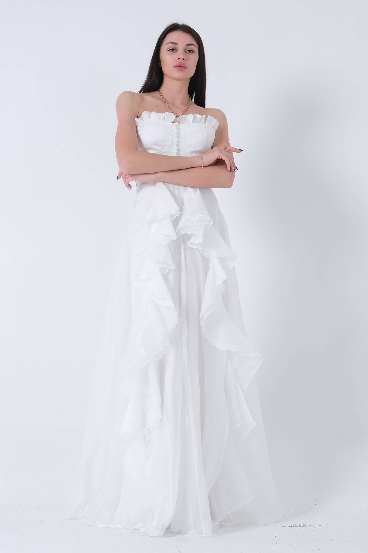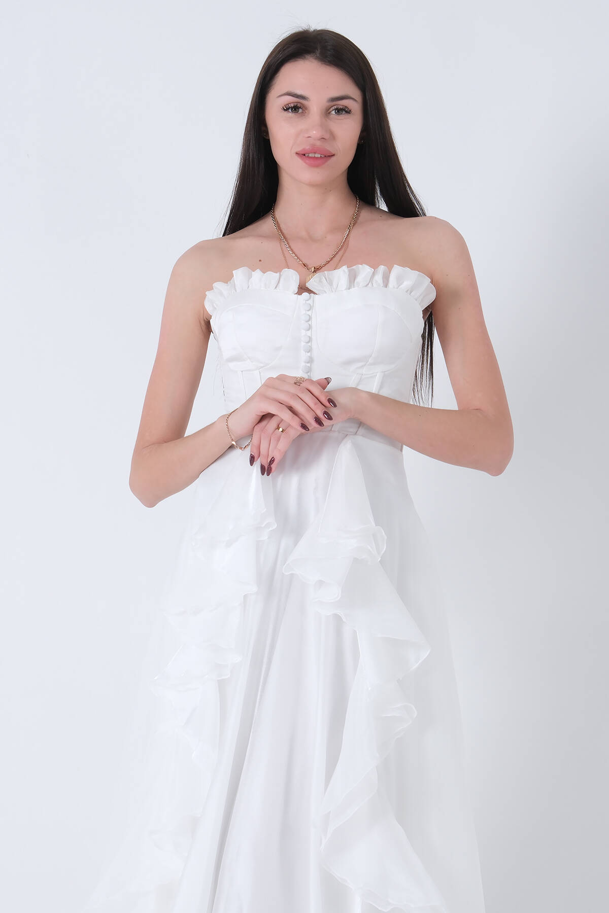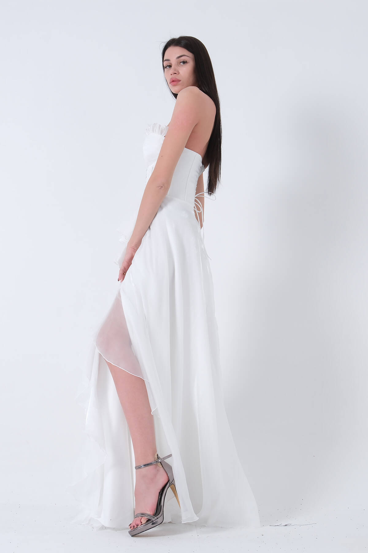 Beyaz Straplez Yaka Yırtmaçlı Eteği Fırfırlı Abiye 9705234.15