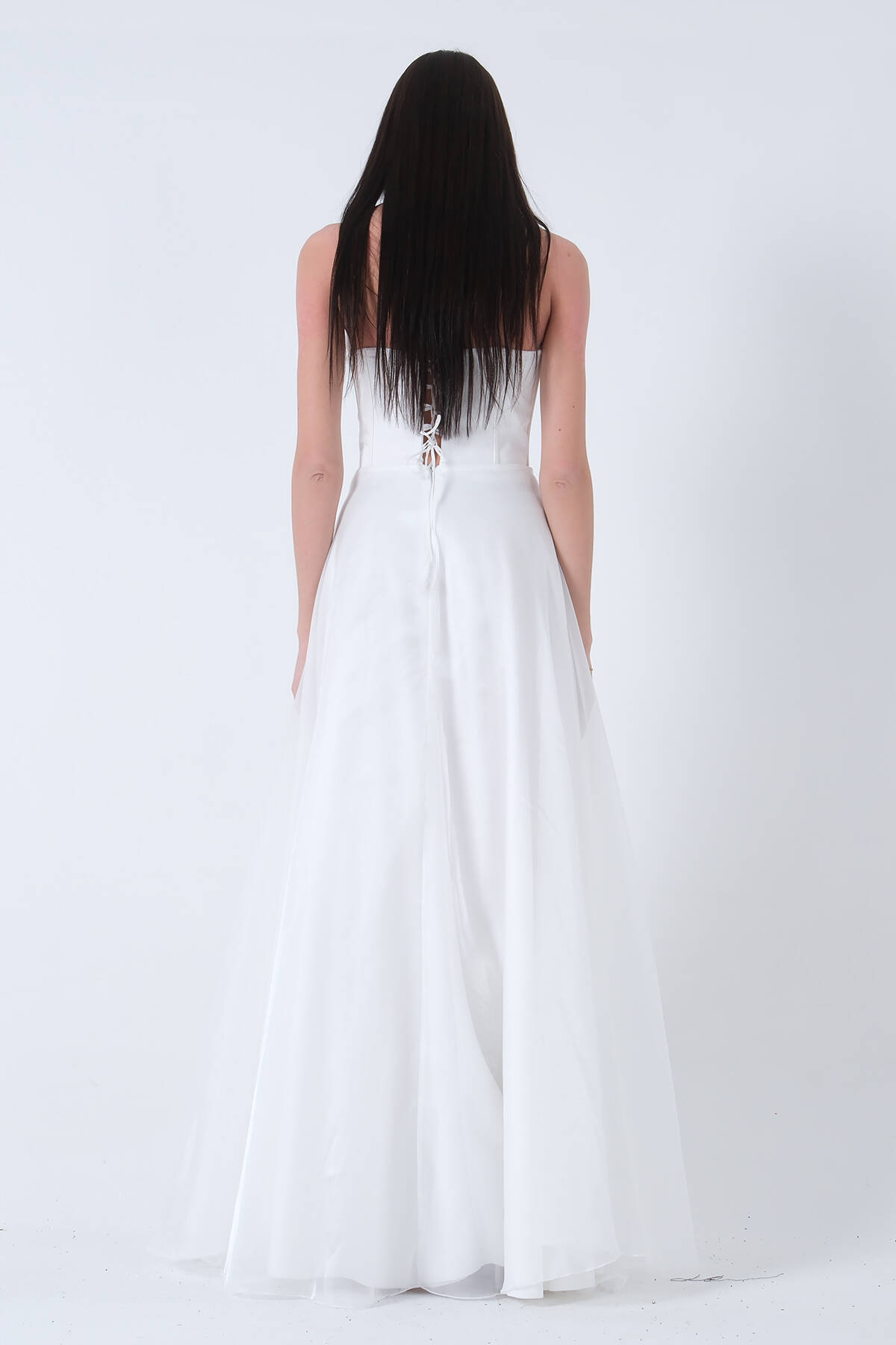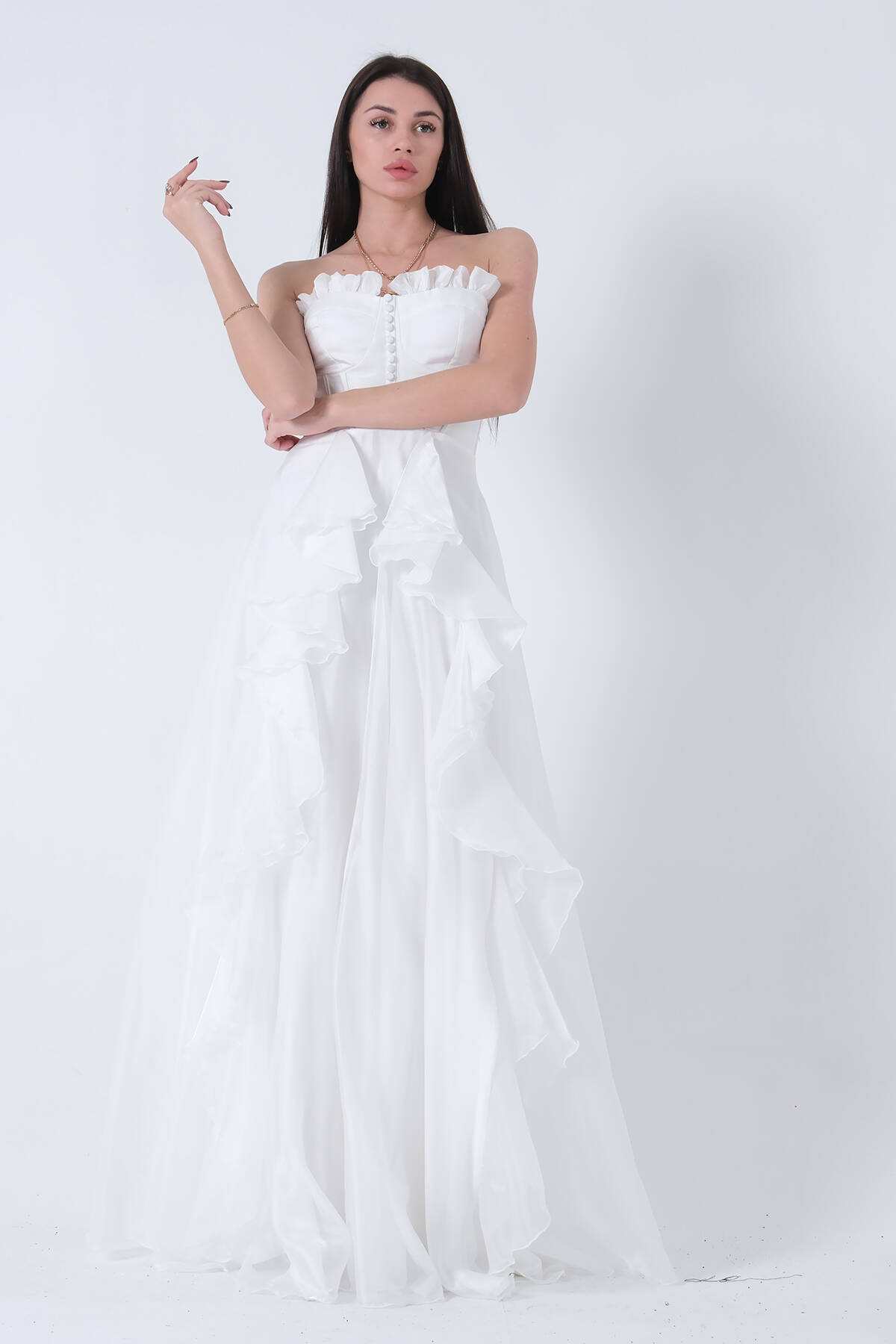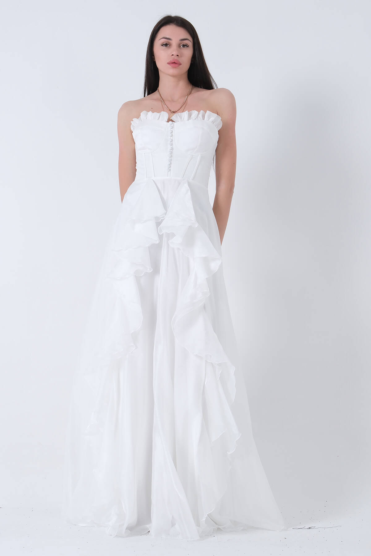 Beyaz Straplez Yaka Yırtmaçlı Eteği Fırfırlı Abiye 9705234.15