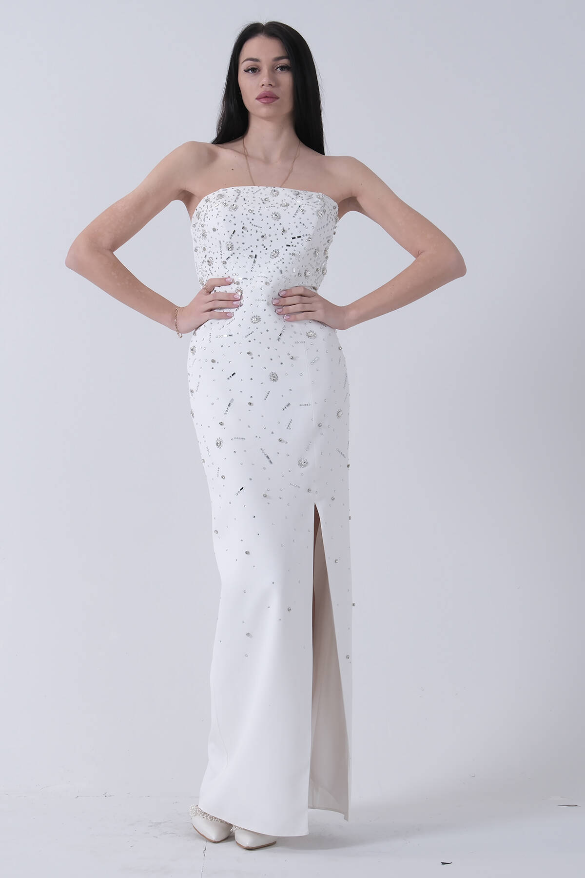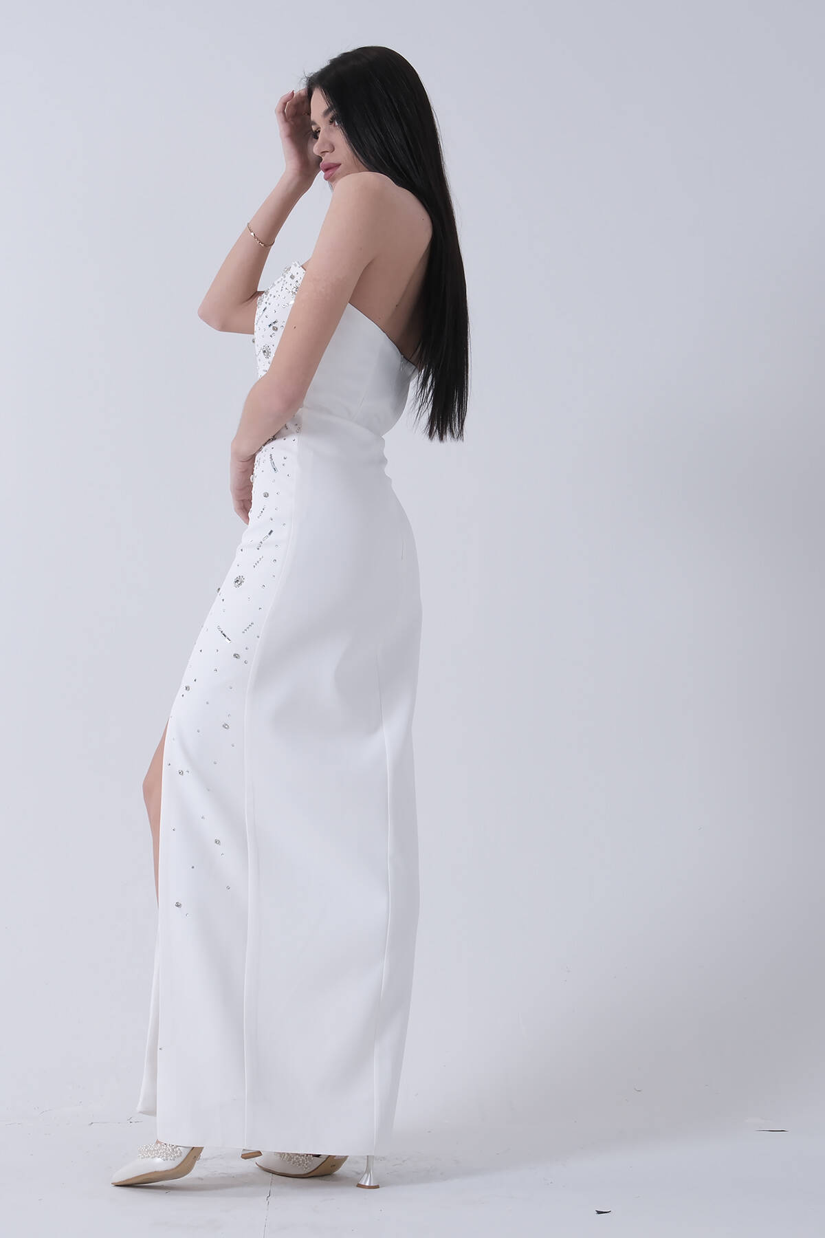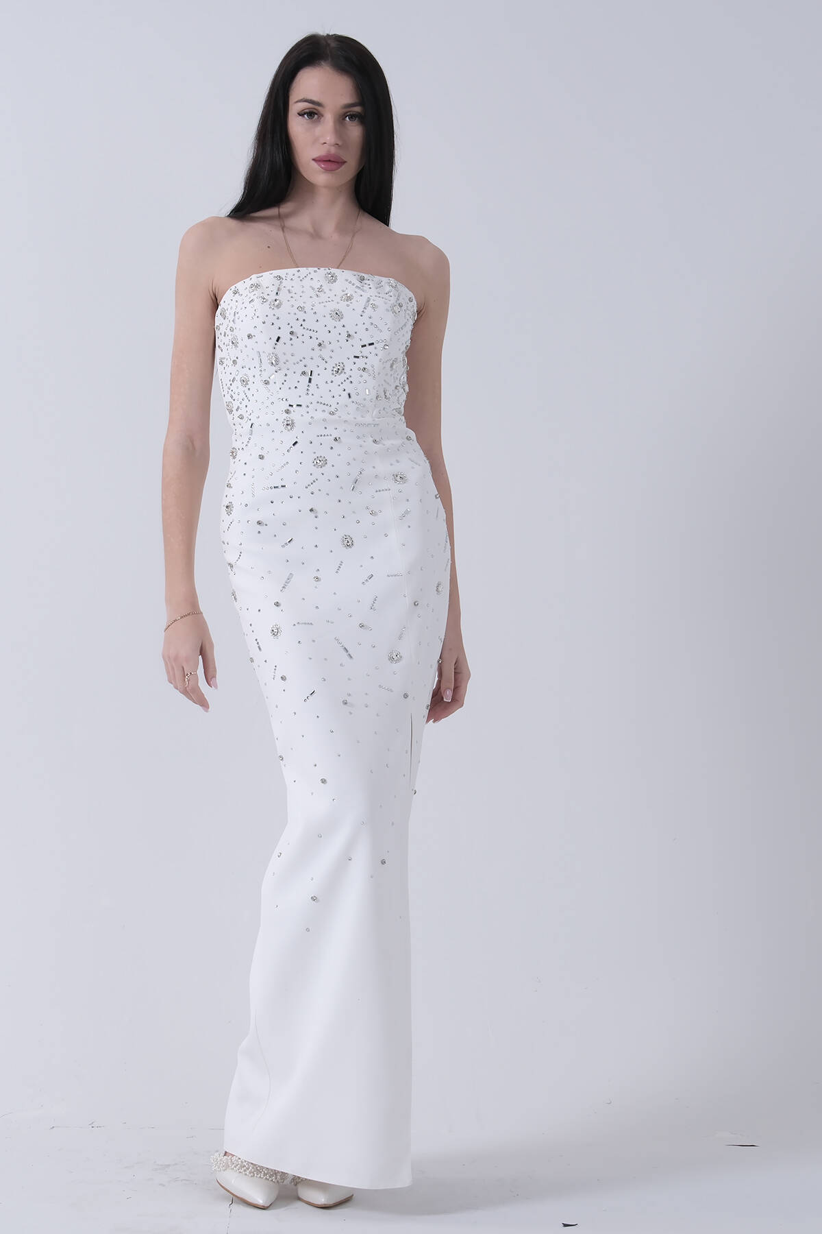 Beyaz Taş İşlemeli Straplez Yırtmaçlı Abiye 0801045.15