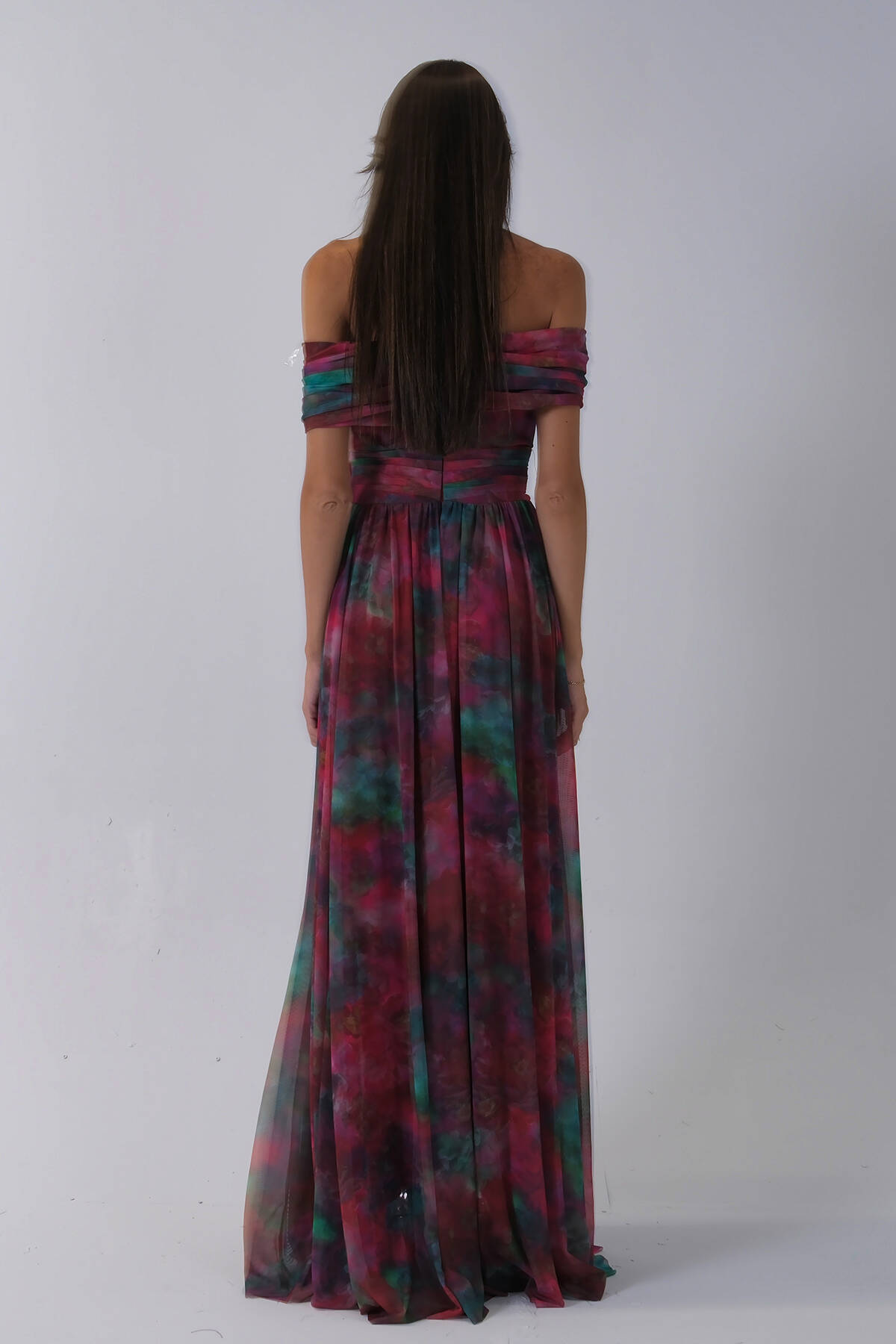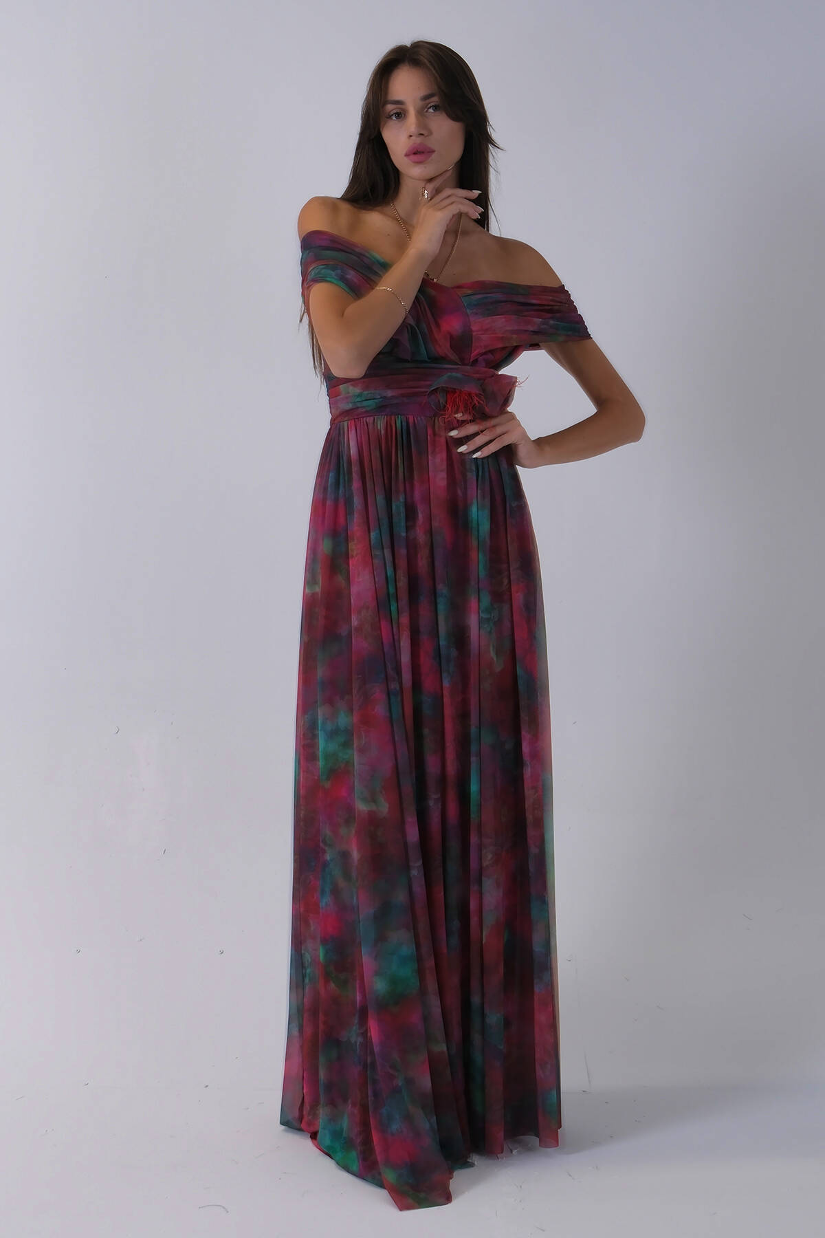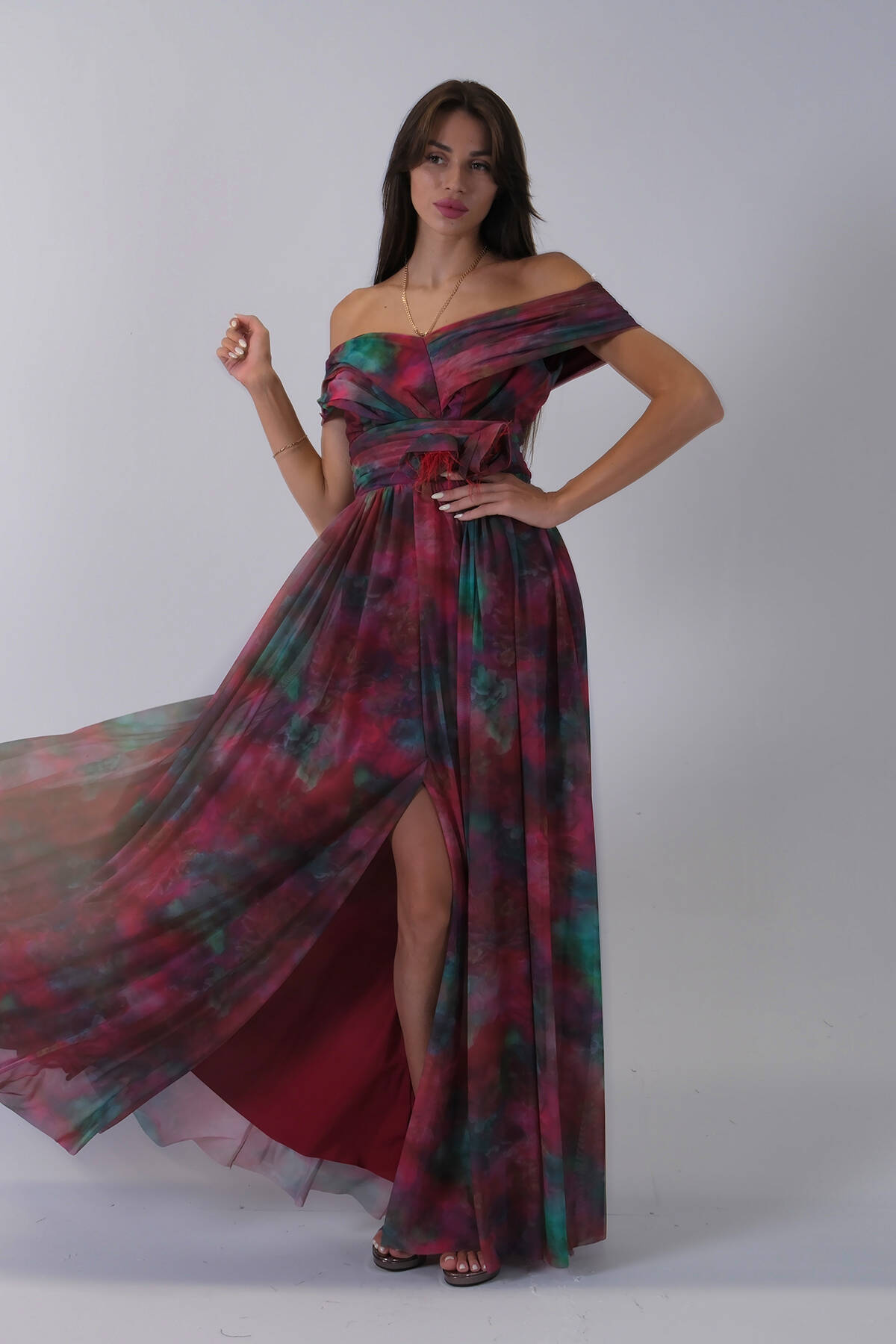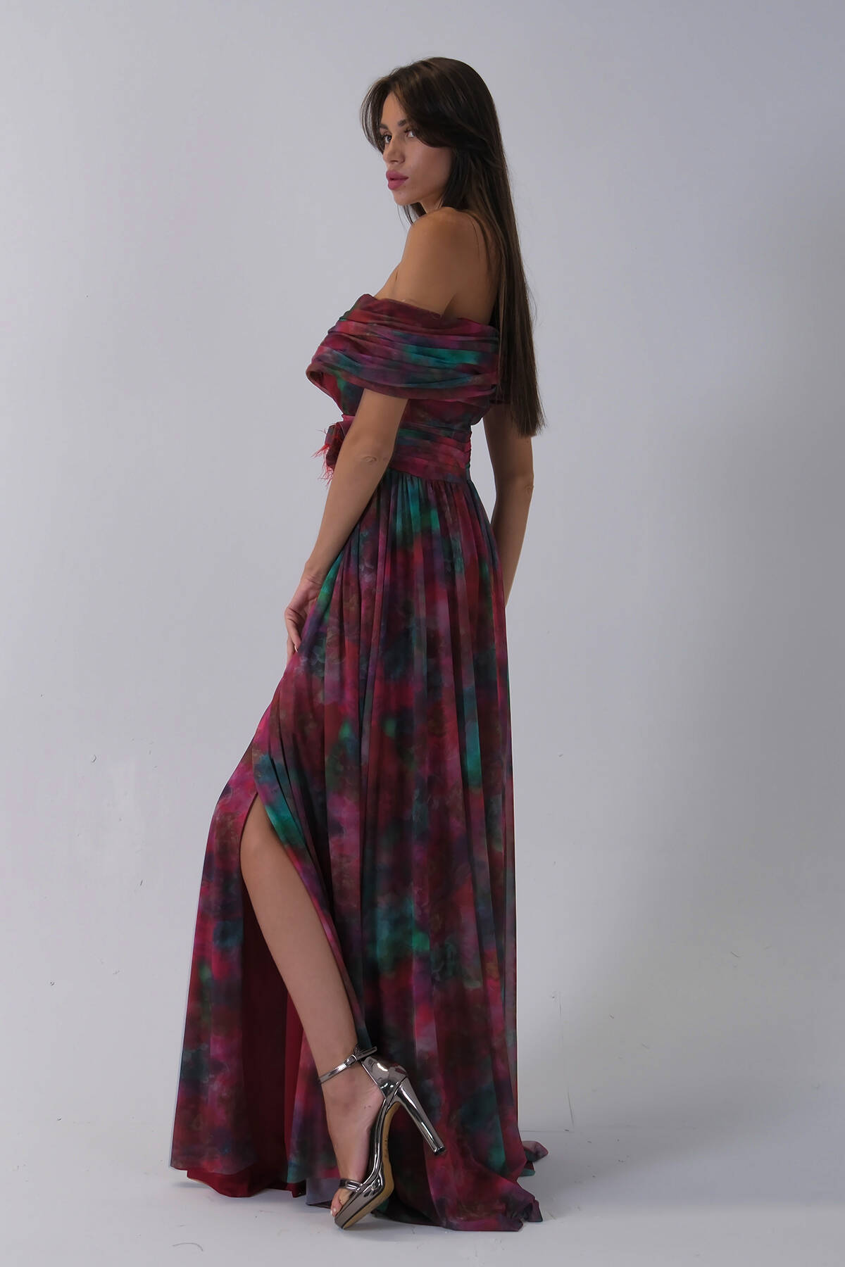 Bordo Beli Çiçek Detaylı Desenli Şifon Abiye 0801102.04