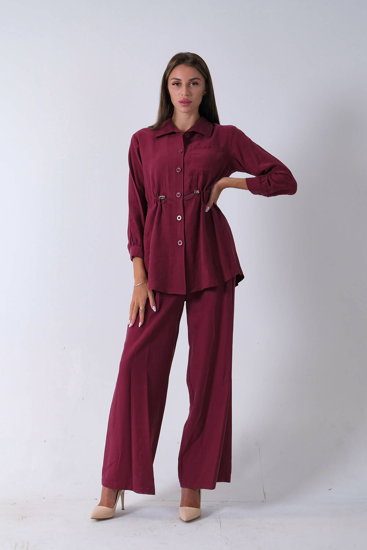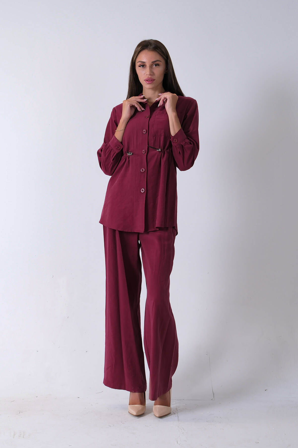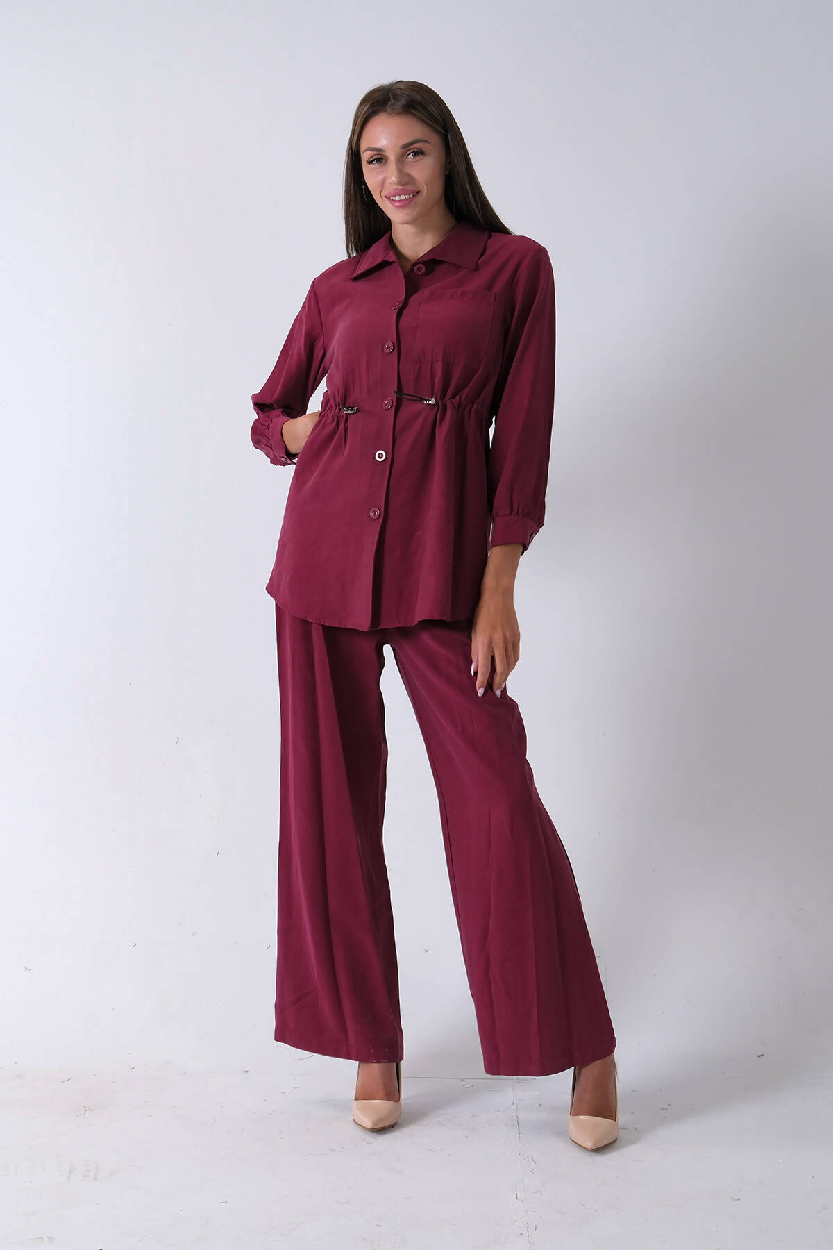 Bordo Beli Kemerli Gömlek Yaka Tunik Pantolonlu Takım 4592258.04
