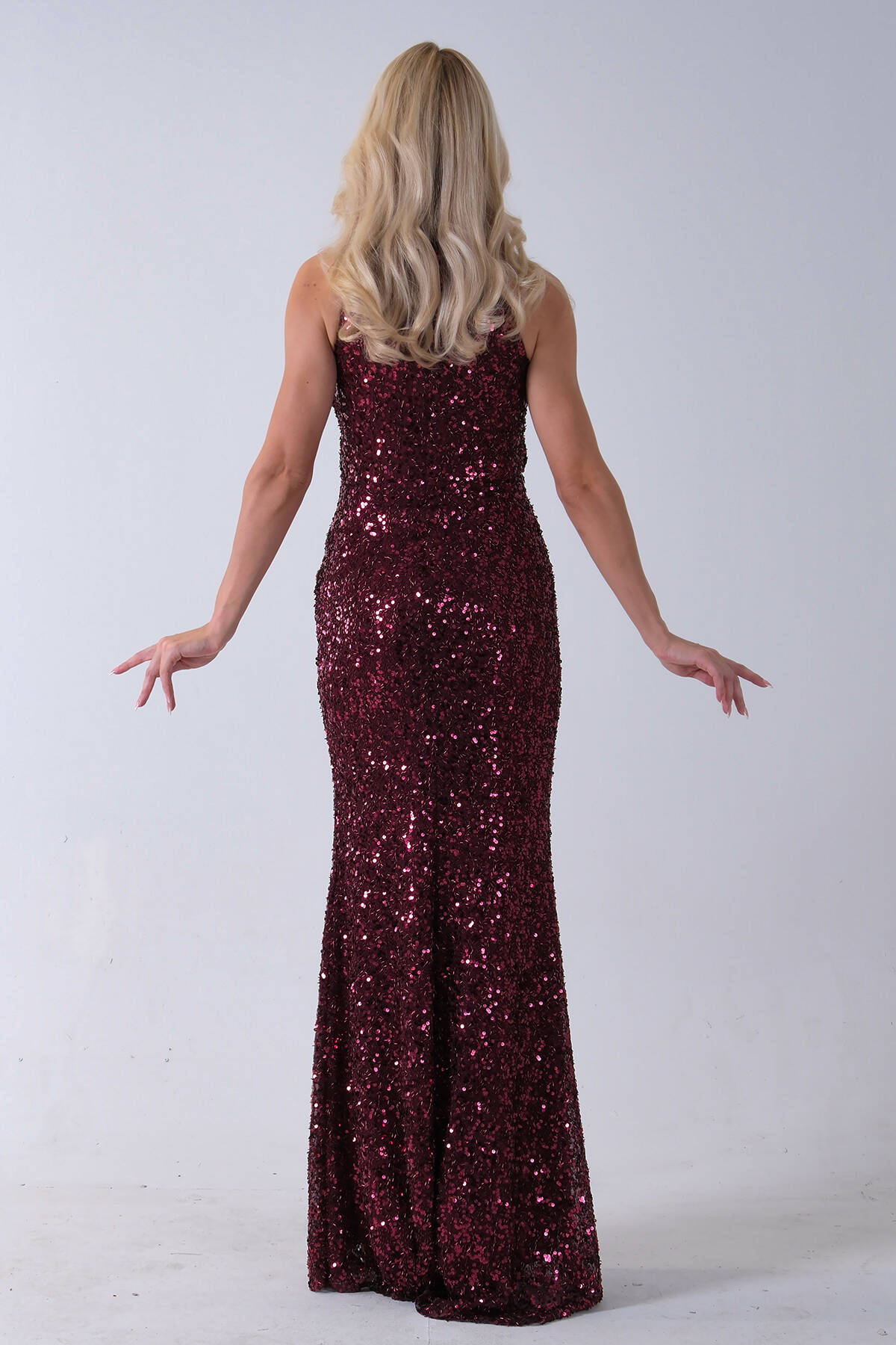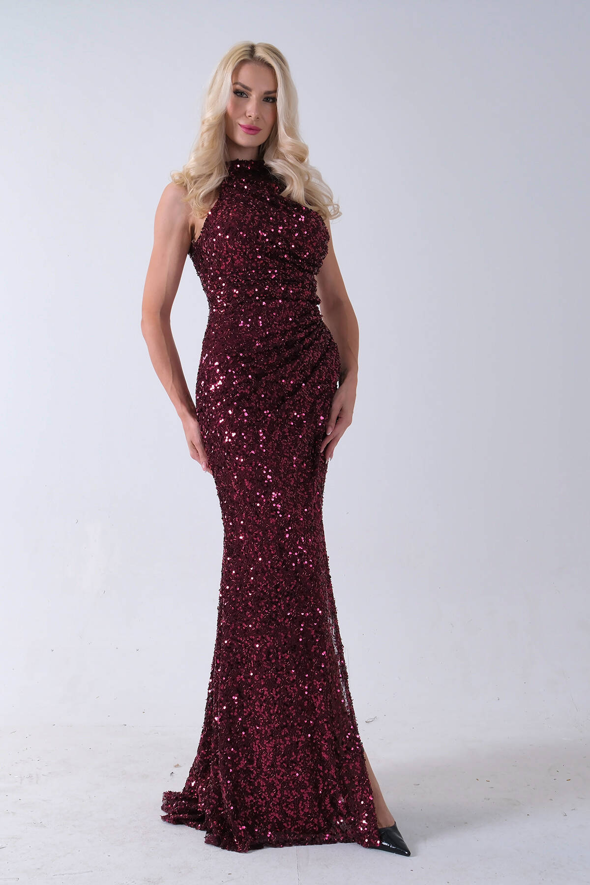 Bordo Bisiklet Yaka Kolsuz Yırtmaç Detaylı Pul Payet Abiye 9705482.04