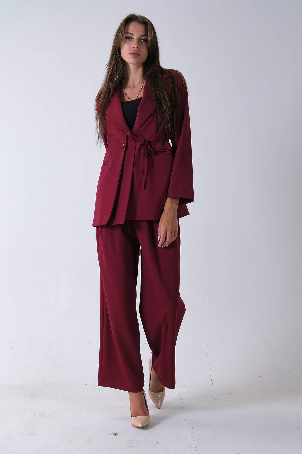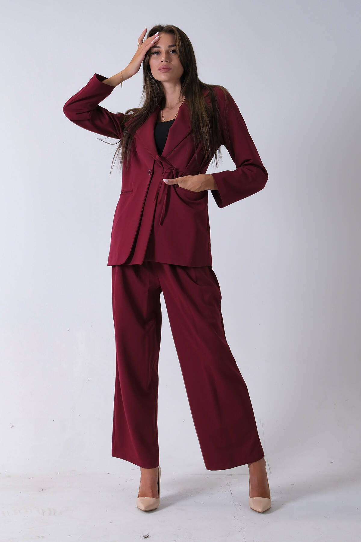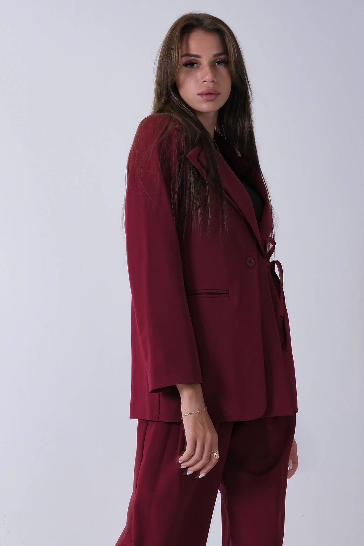 Bordo Çift Cep Yandan Bağlamalı Ceket Pantolonlu Takım 4592259.04