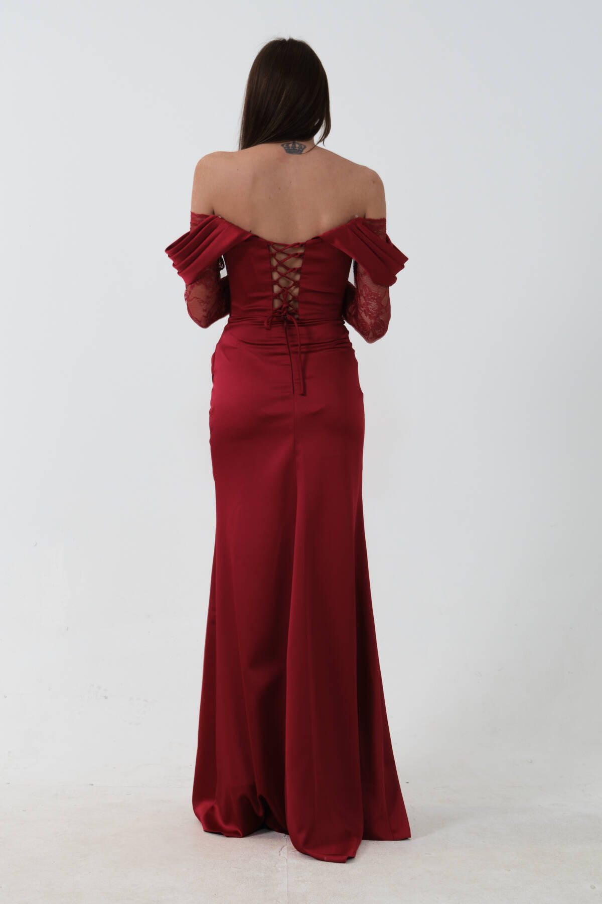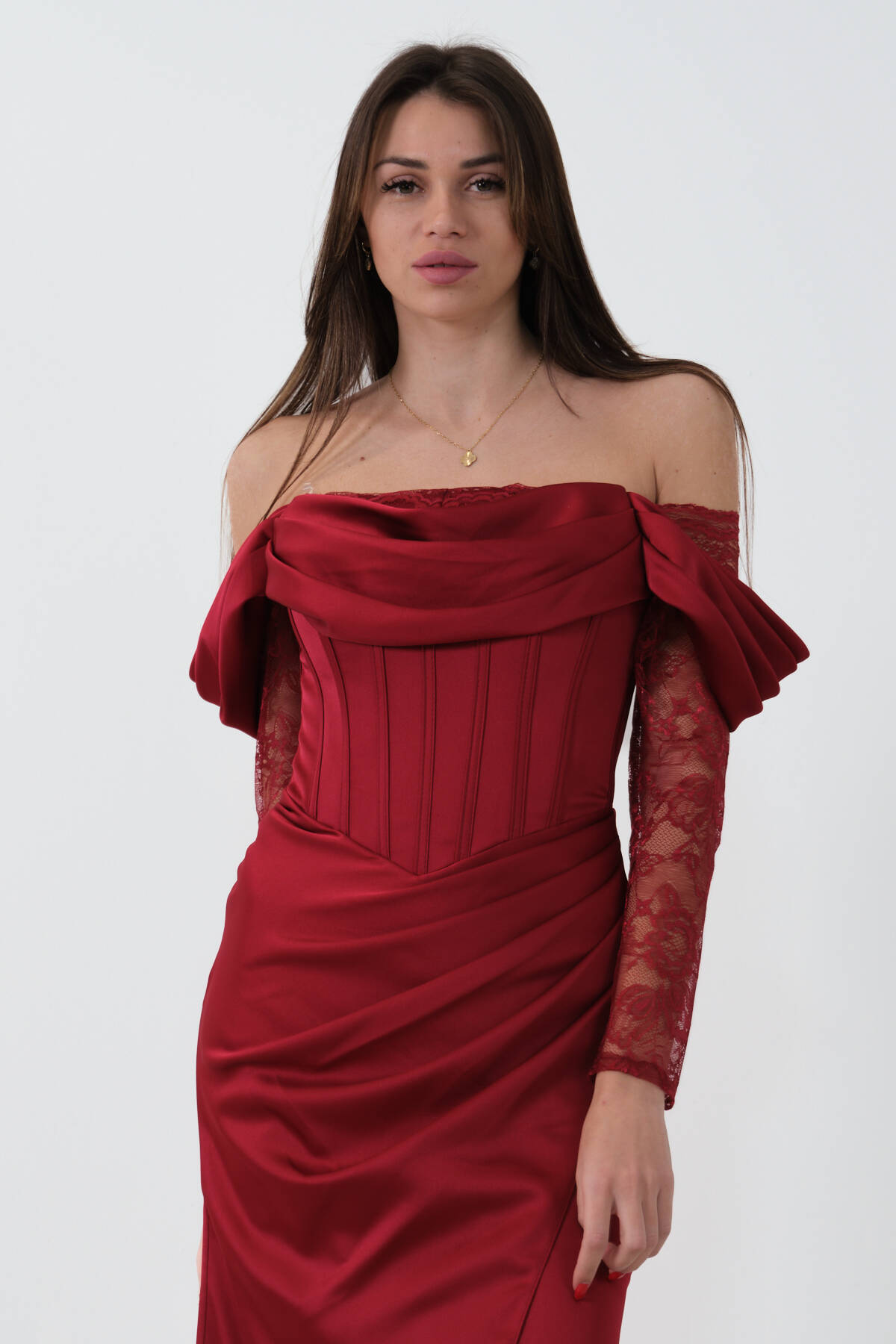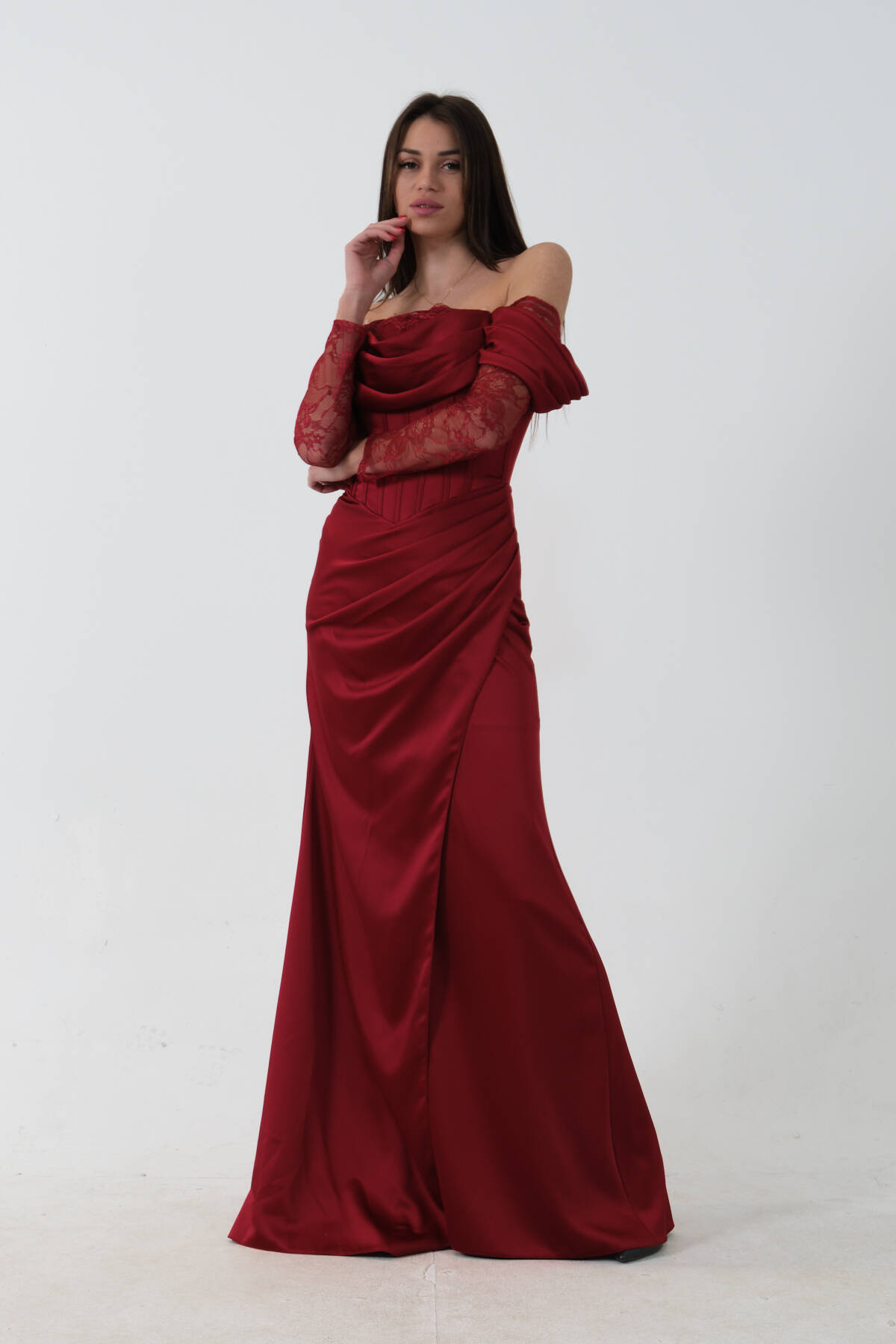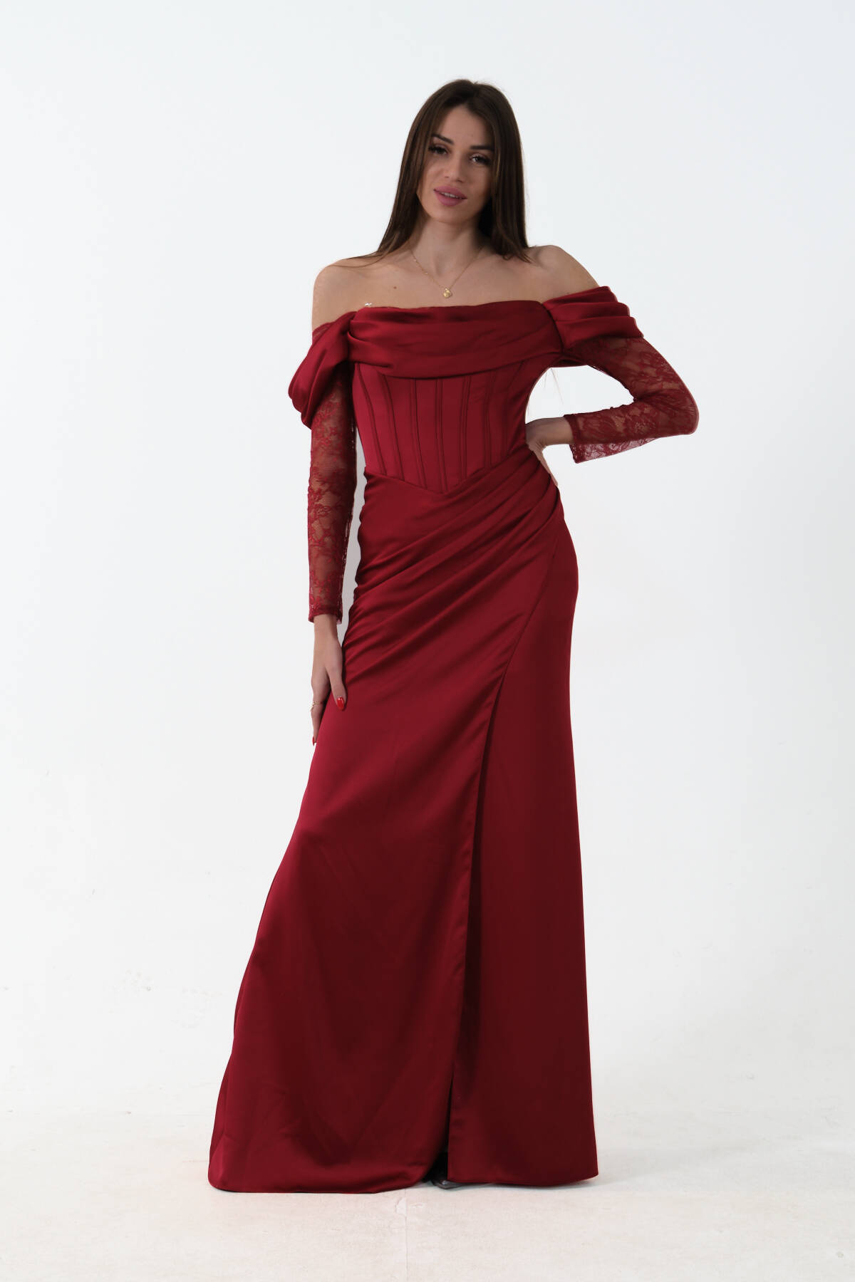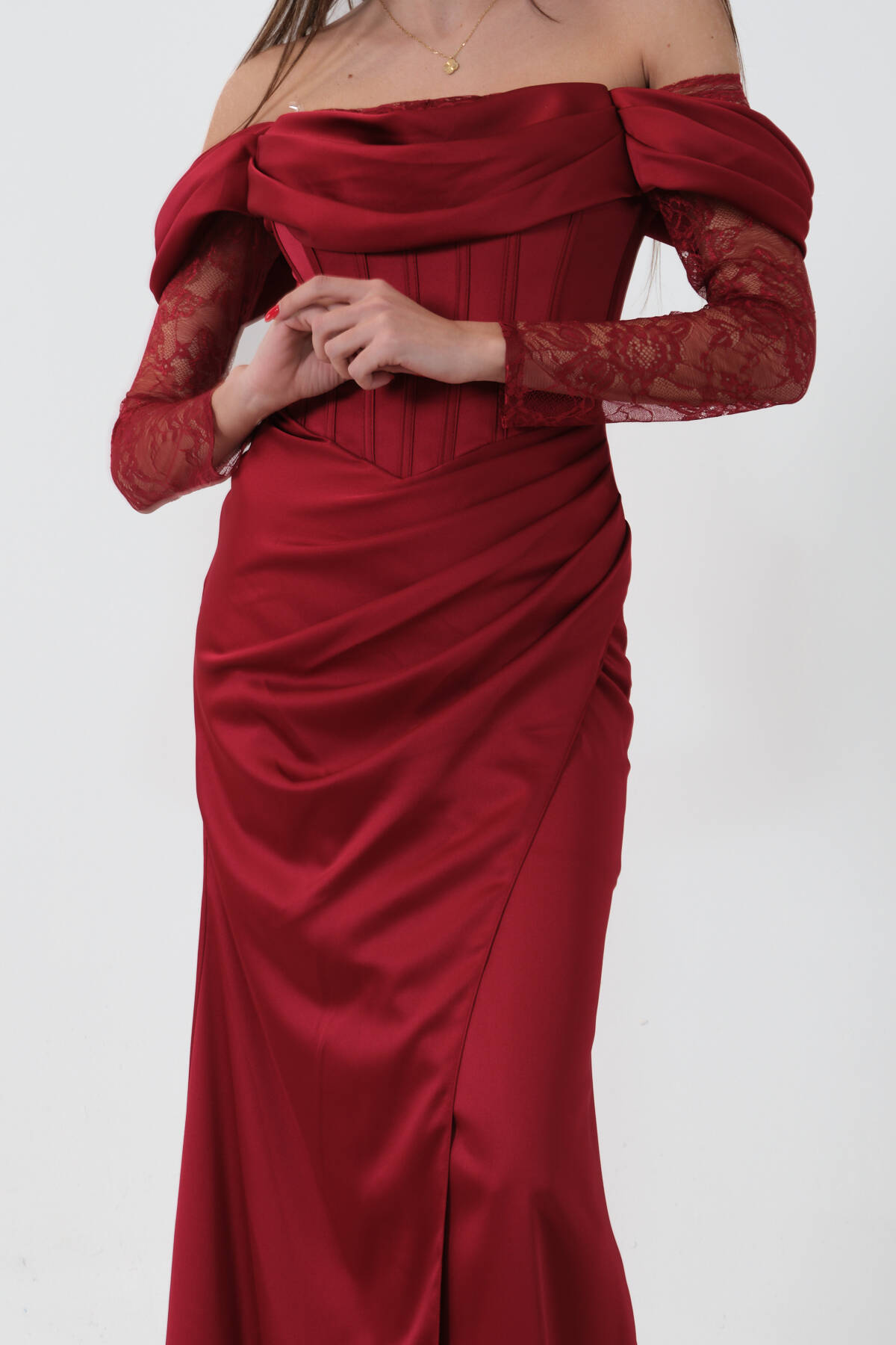 Bordo Düşük Omuz Dantel Kolu Korsajlı Abiye 9705830.04