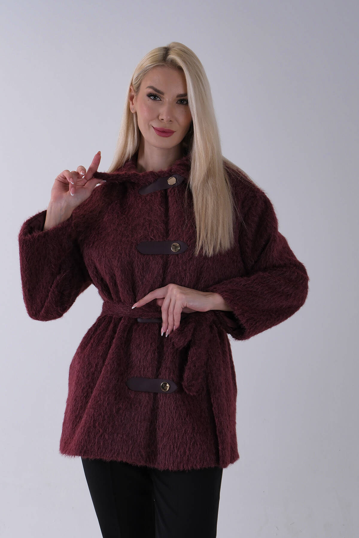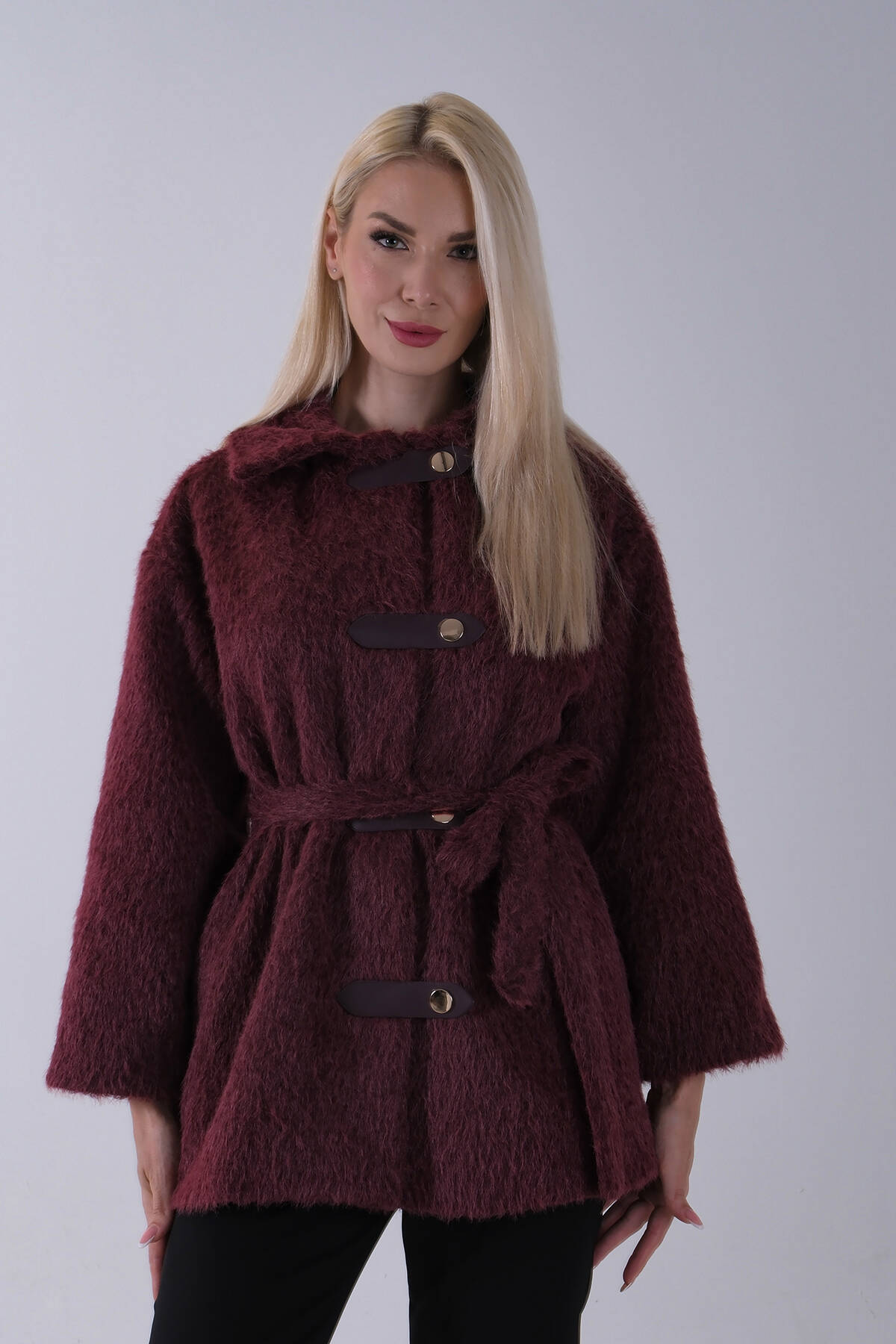 Bordo Gömlek Yakalı 4 Düğme Deri Bukle Detaylı Kaşe Yün Ceket 5307122.04