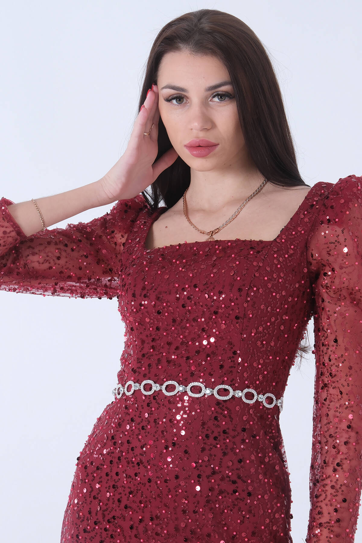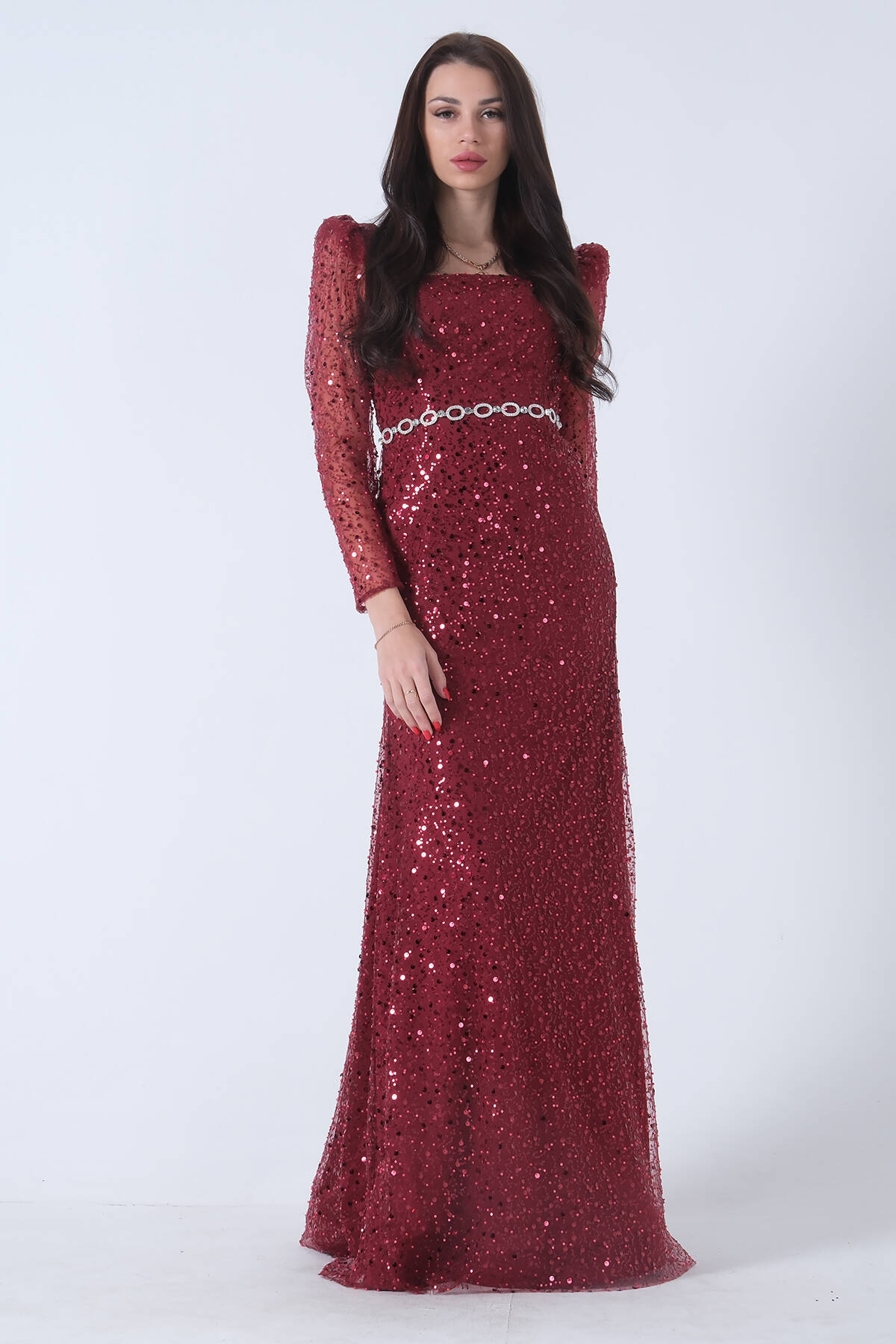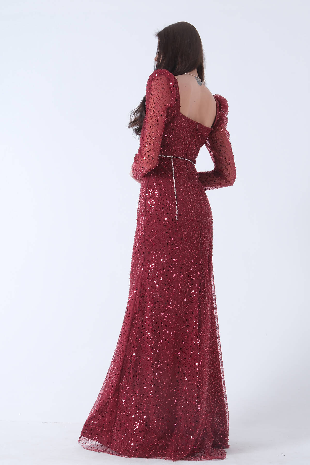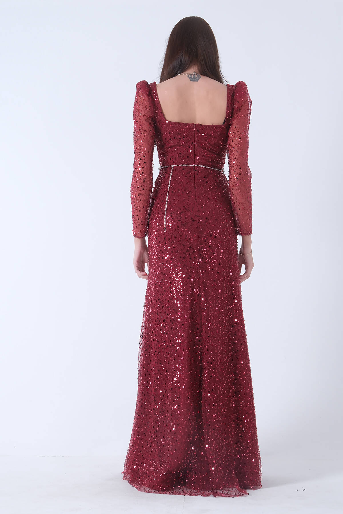 Bordo Kare Yaka Kolları Transparan Abiye Elbise 9705196.04