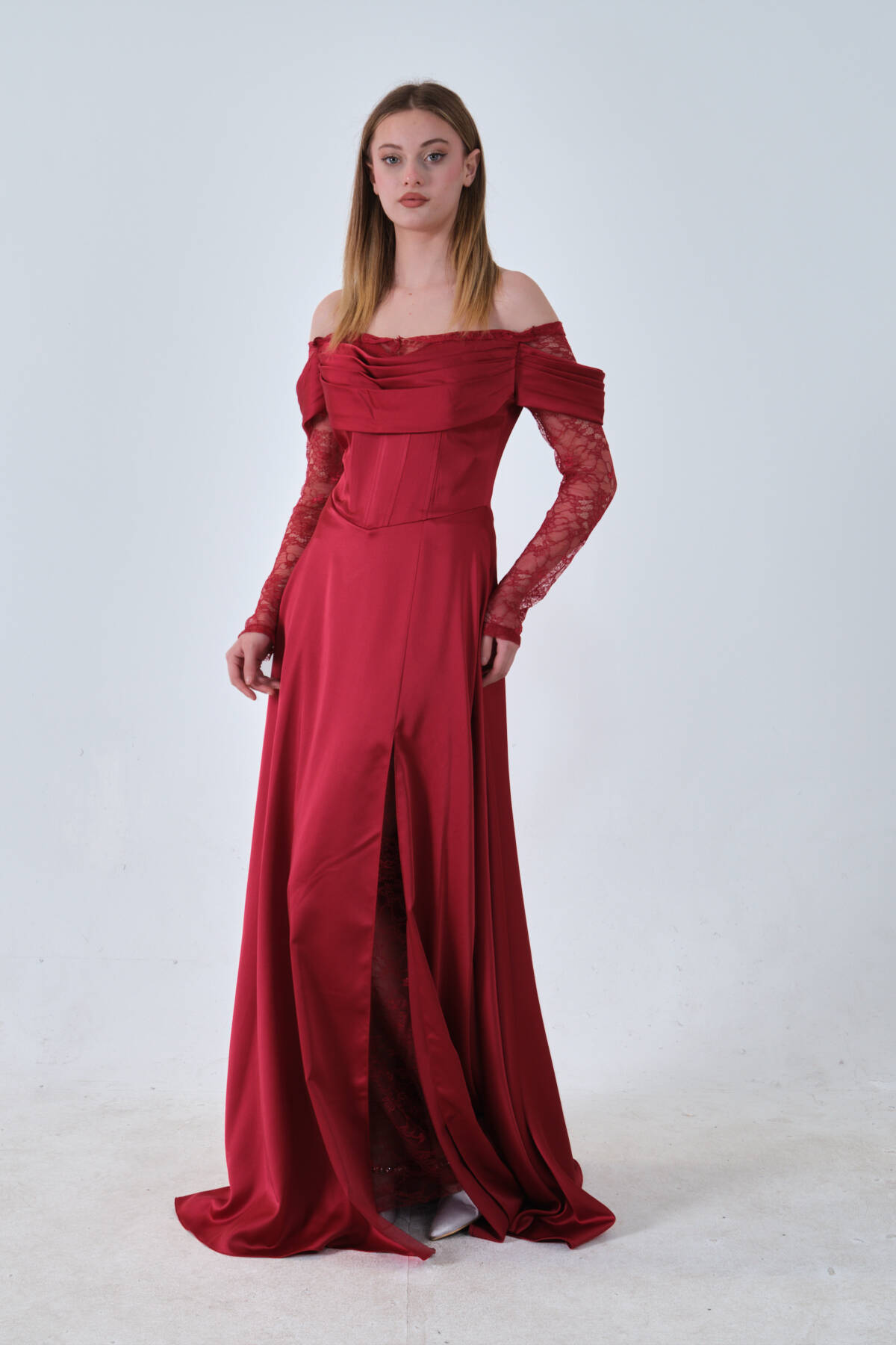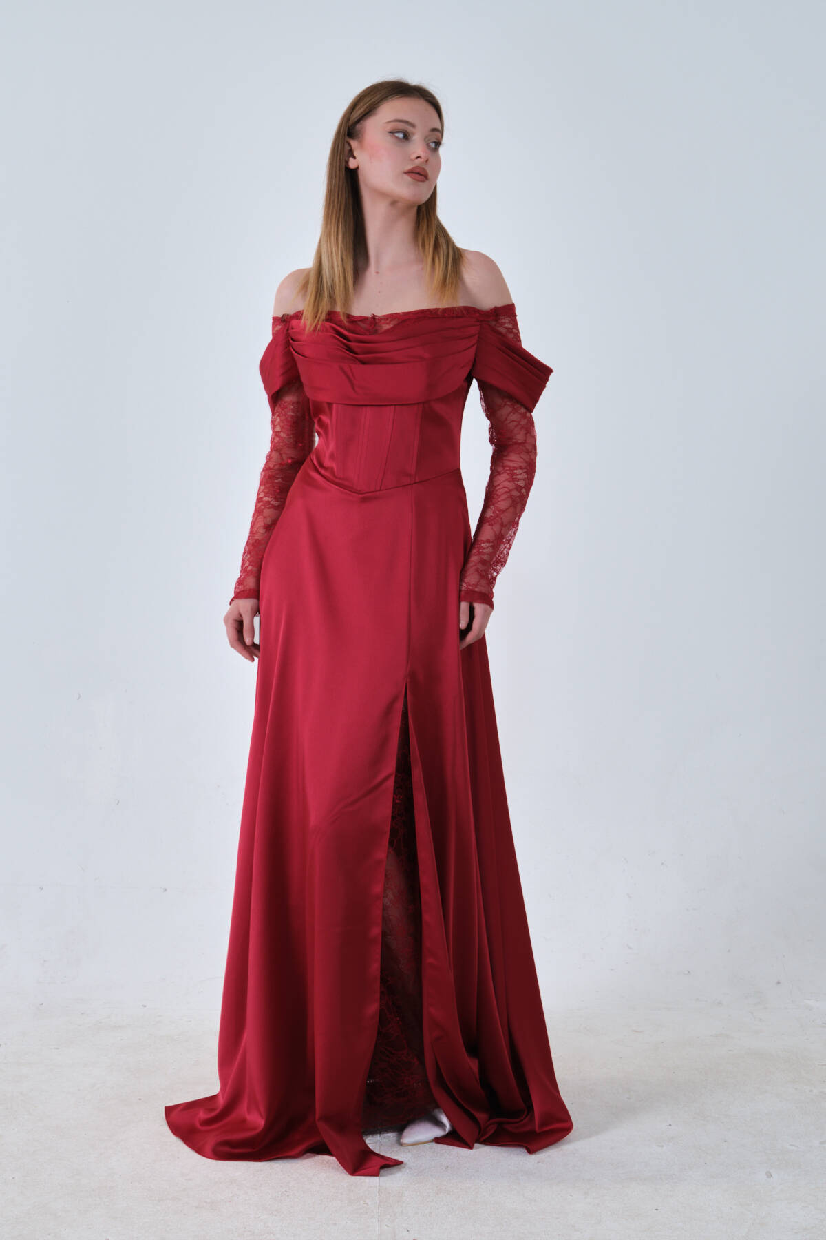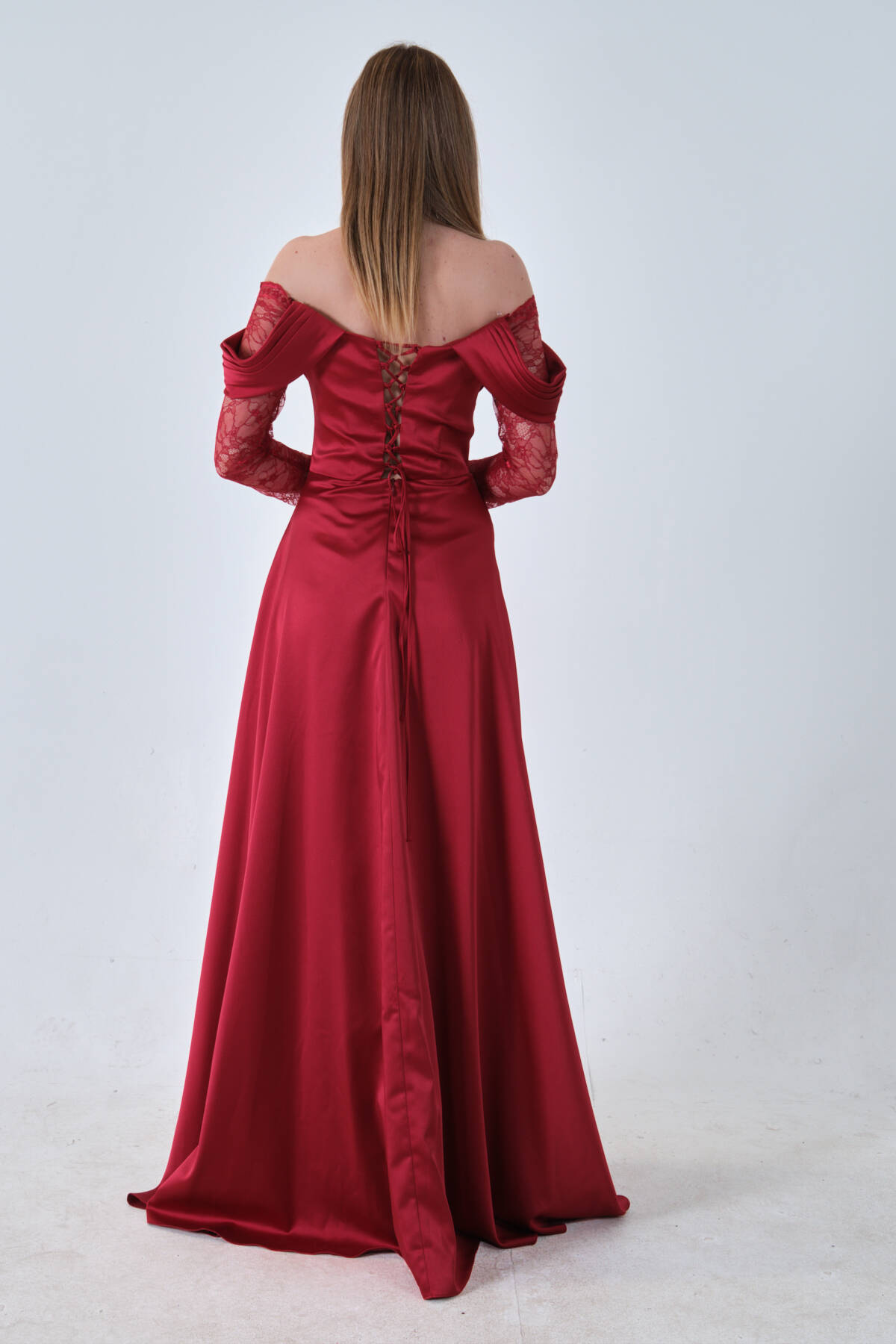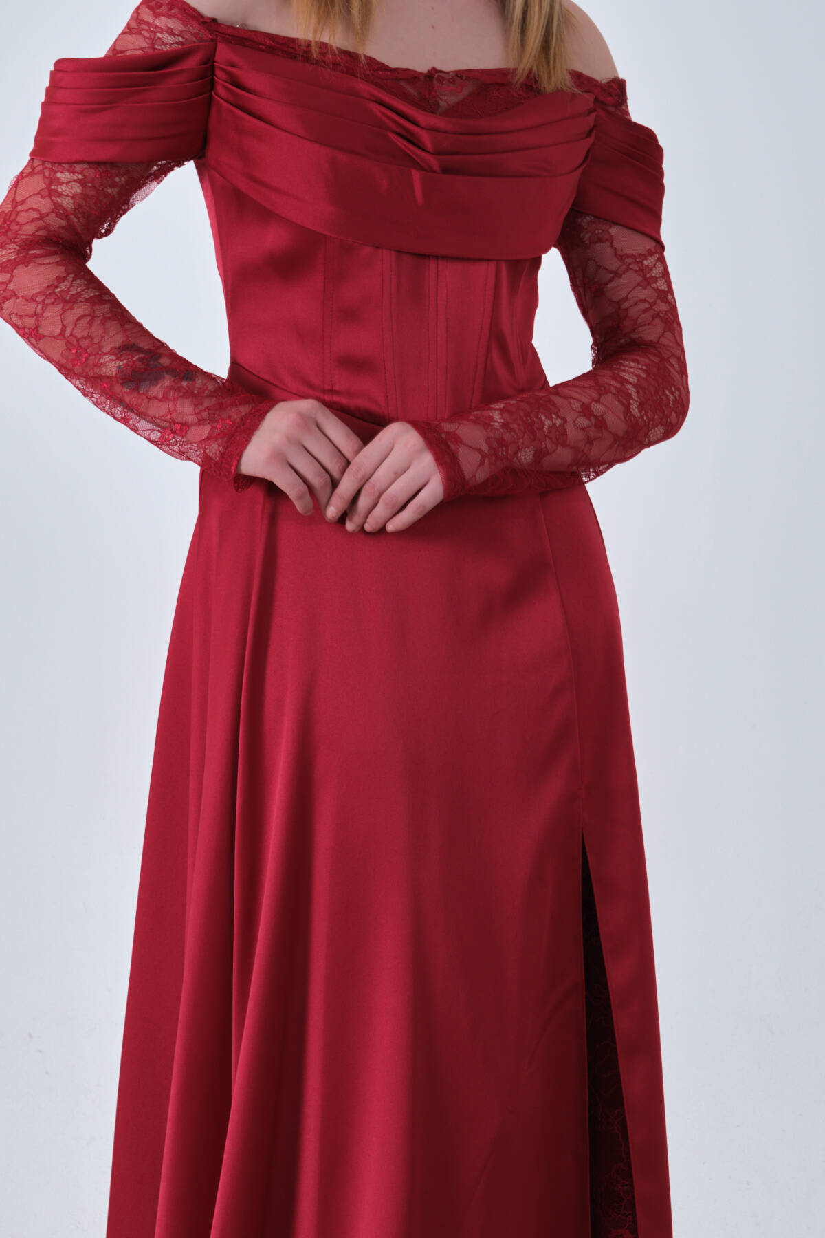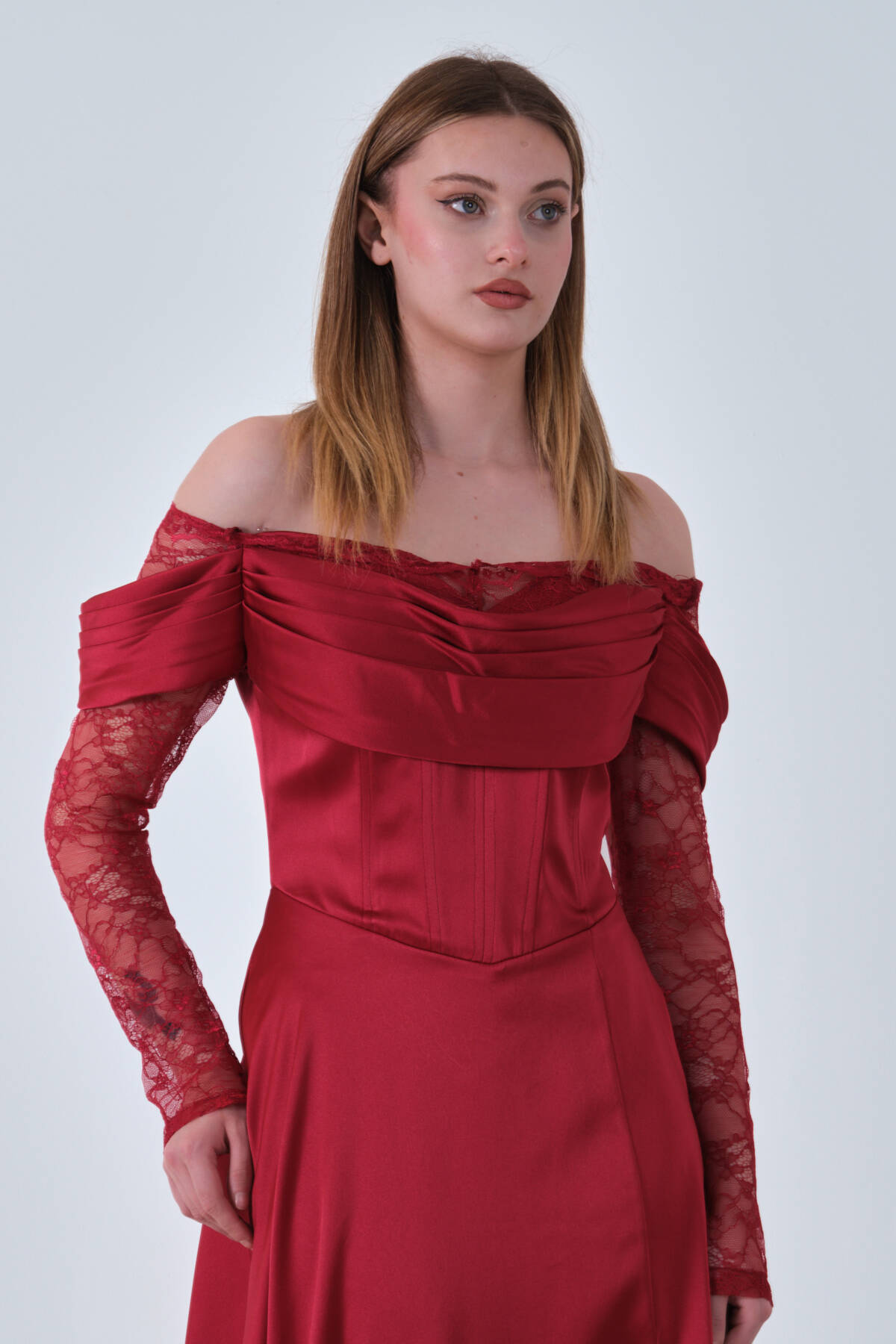 Bordo Kolları Dantel Detaylı Drapeli Abiye 9705561.04