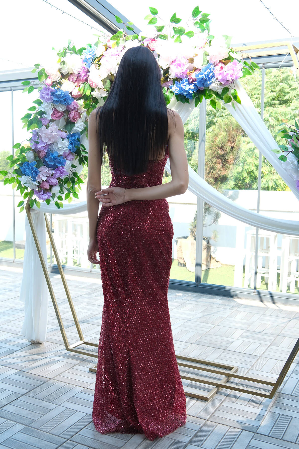 Bordo Pul Taş İşlemeli Straplez Balık Abiye 9705304.04