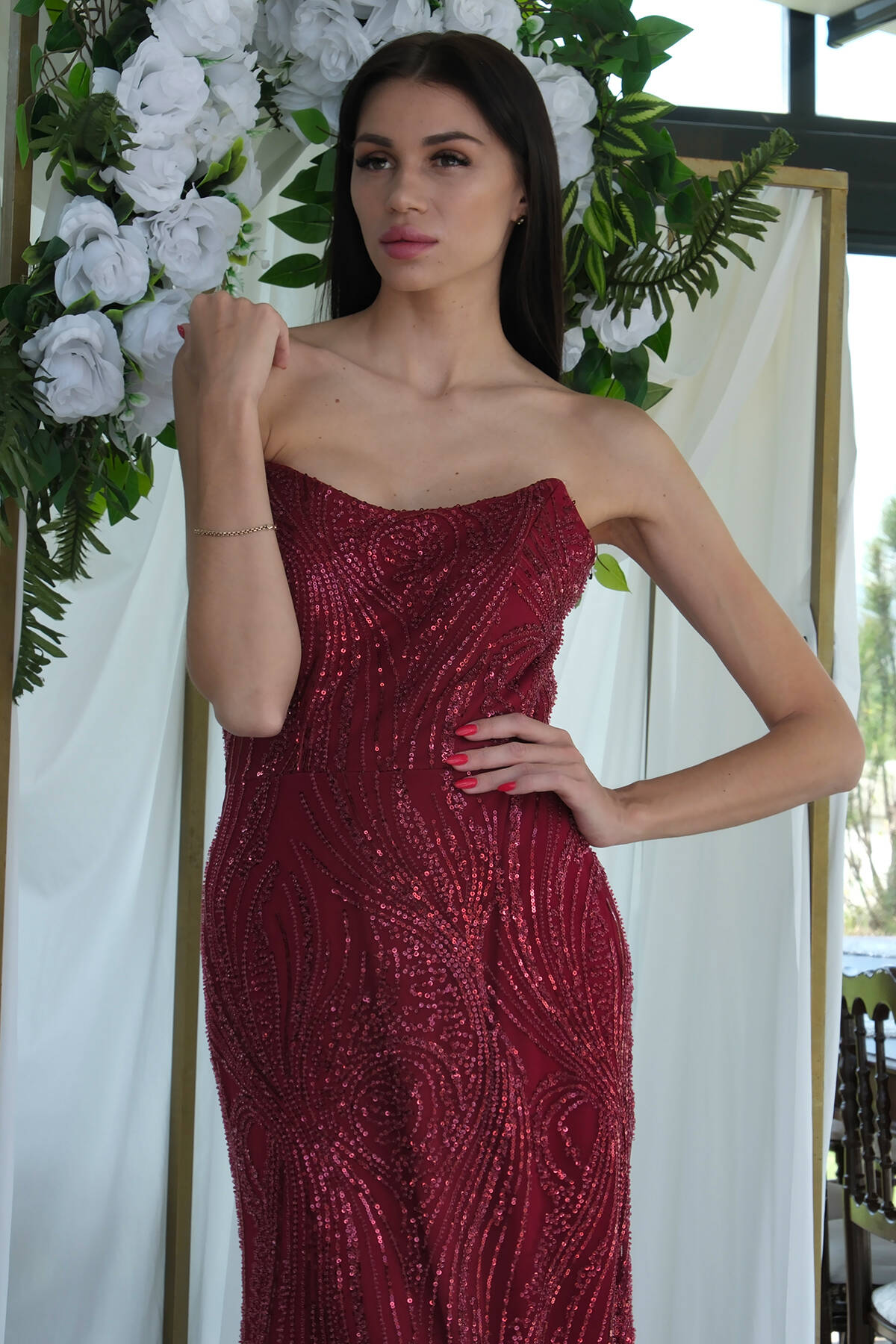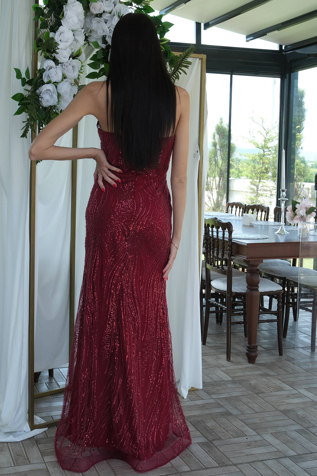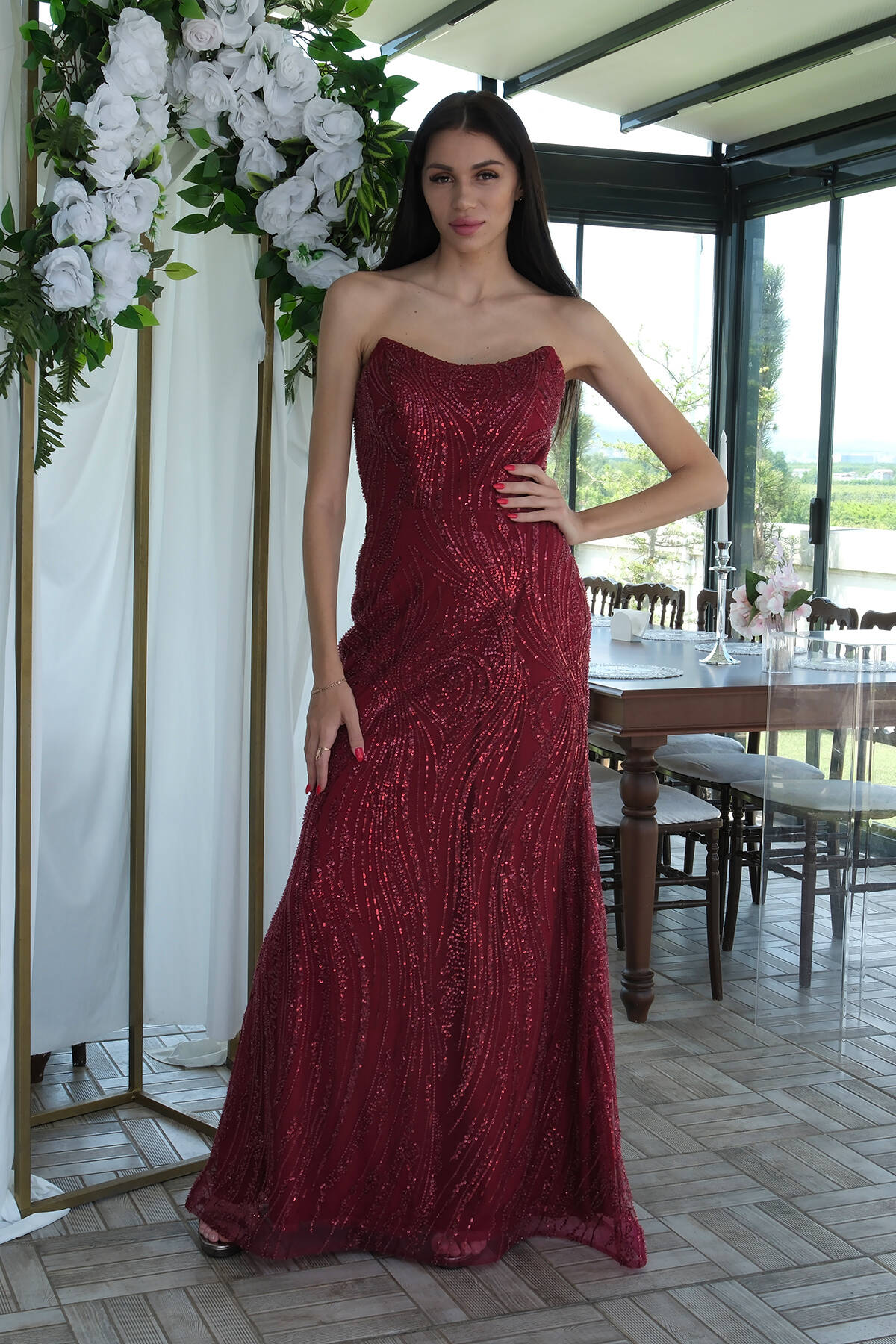 Bordo Taş İşlemeli Uzun Balık Abiye 0801056.04