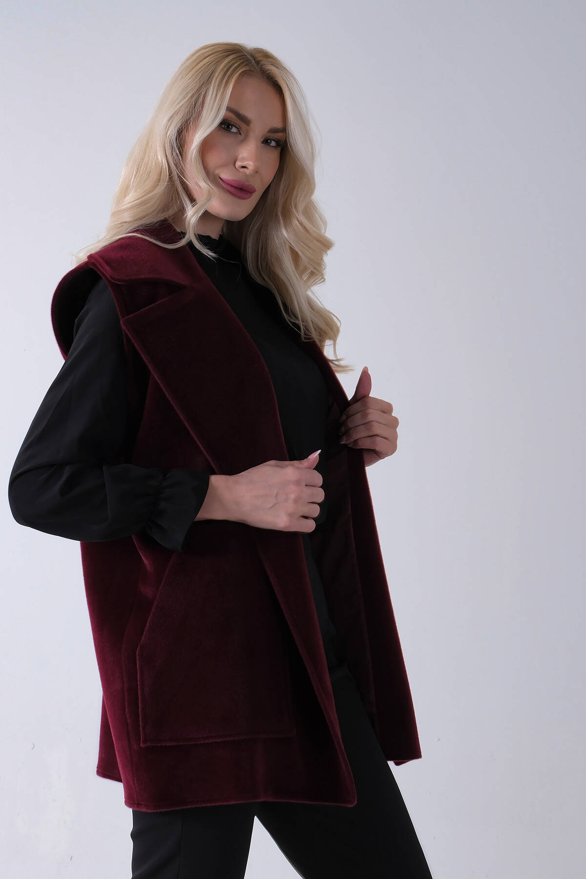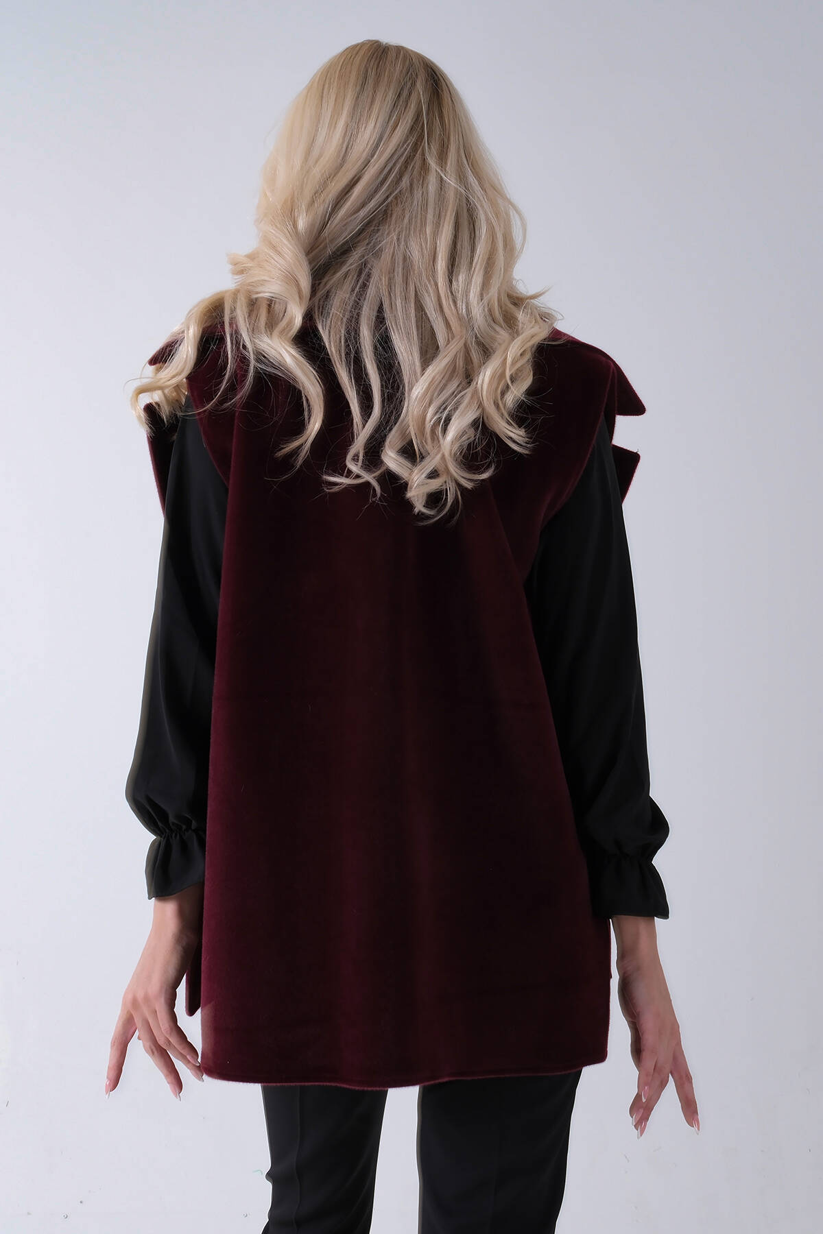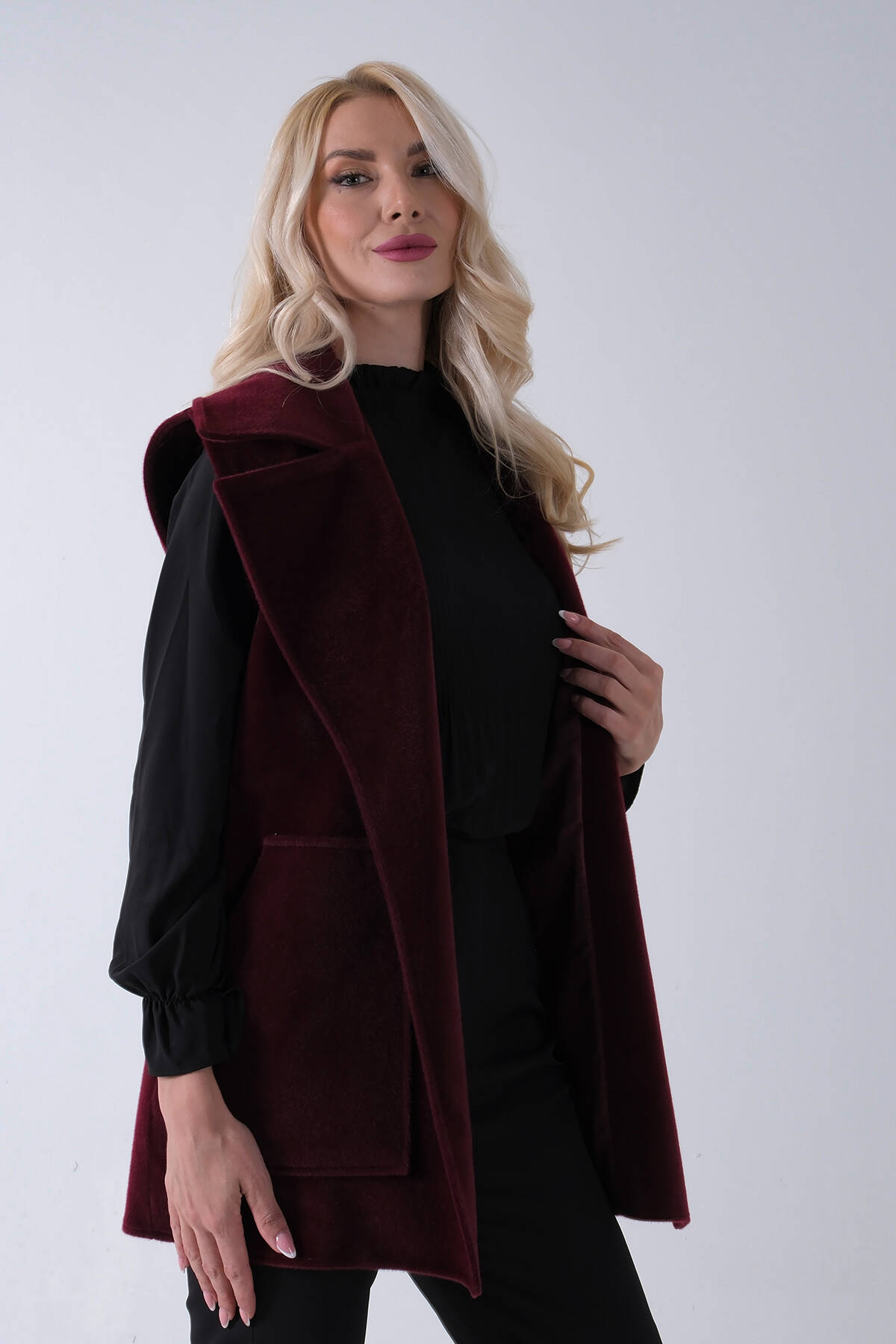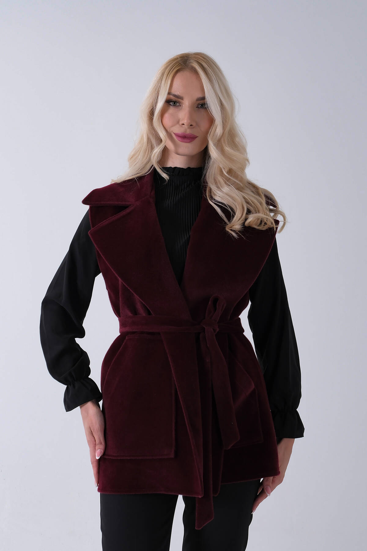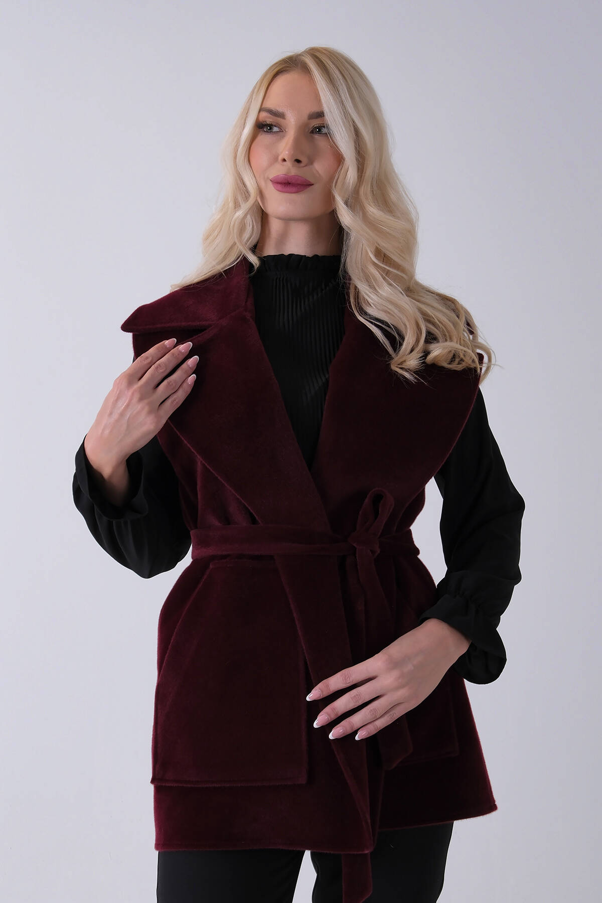 Bordo Yakalı Cepli 2 Düğmeli Kemer Bağlamalı Kaşe Yelek 5307107.04