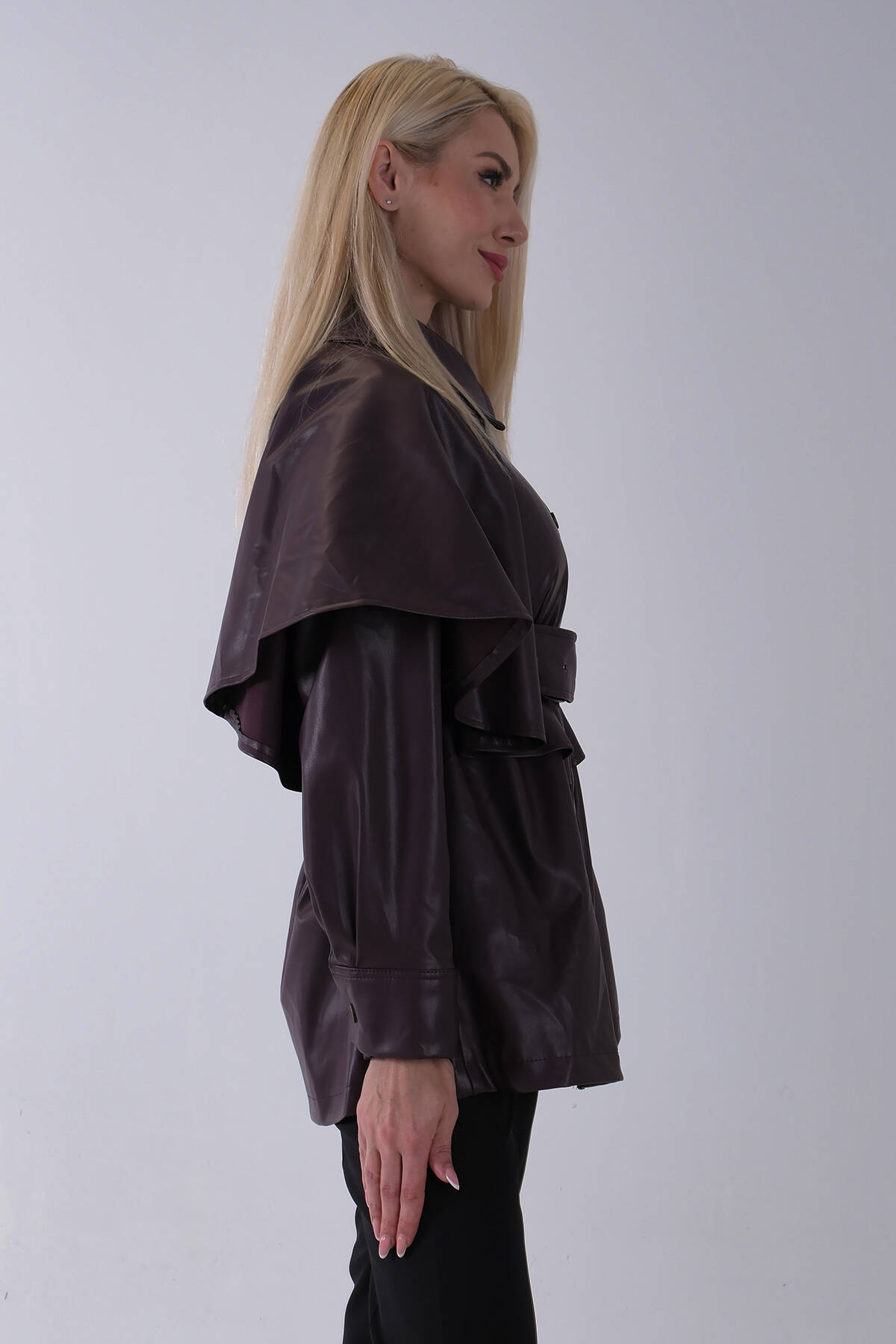 Bordo Yakalı Kendinden Pelerinli Kemerli Deri Ceket 5309366.04