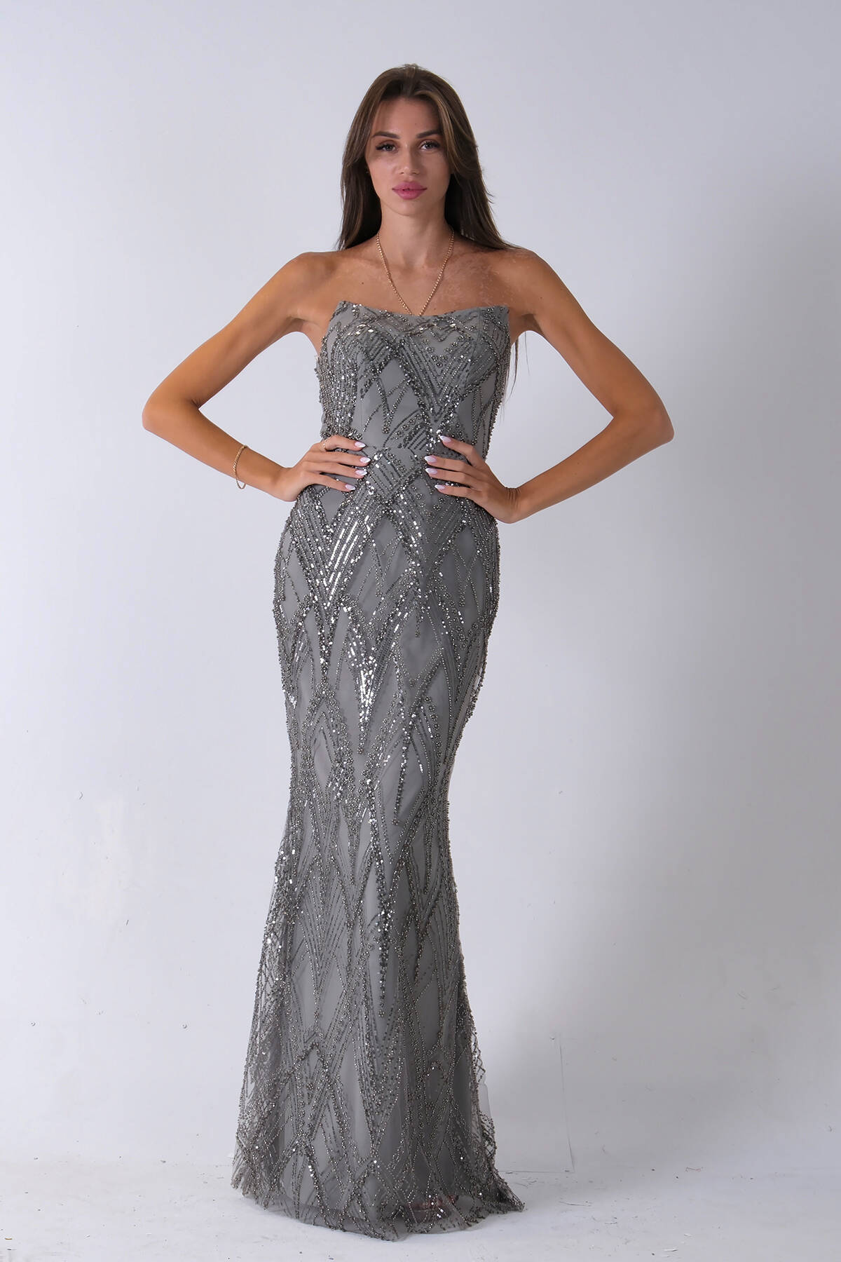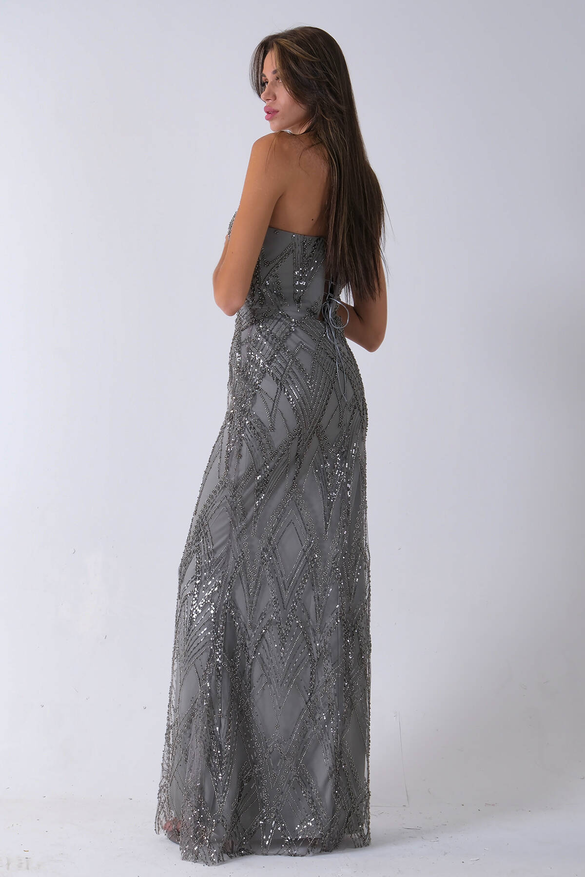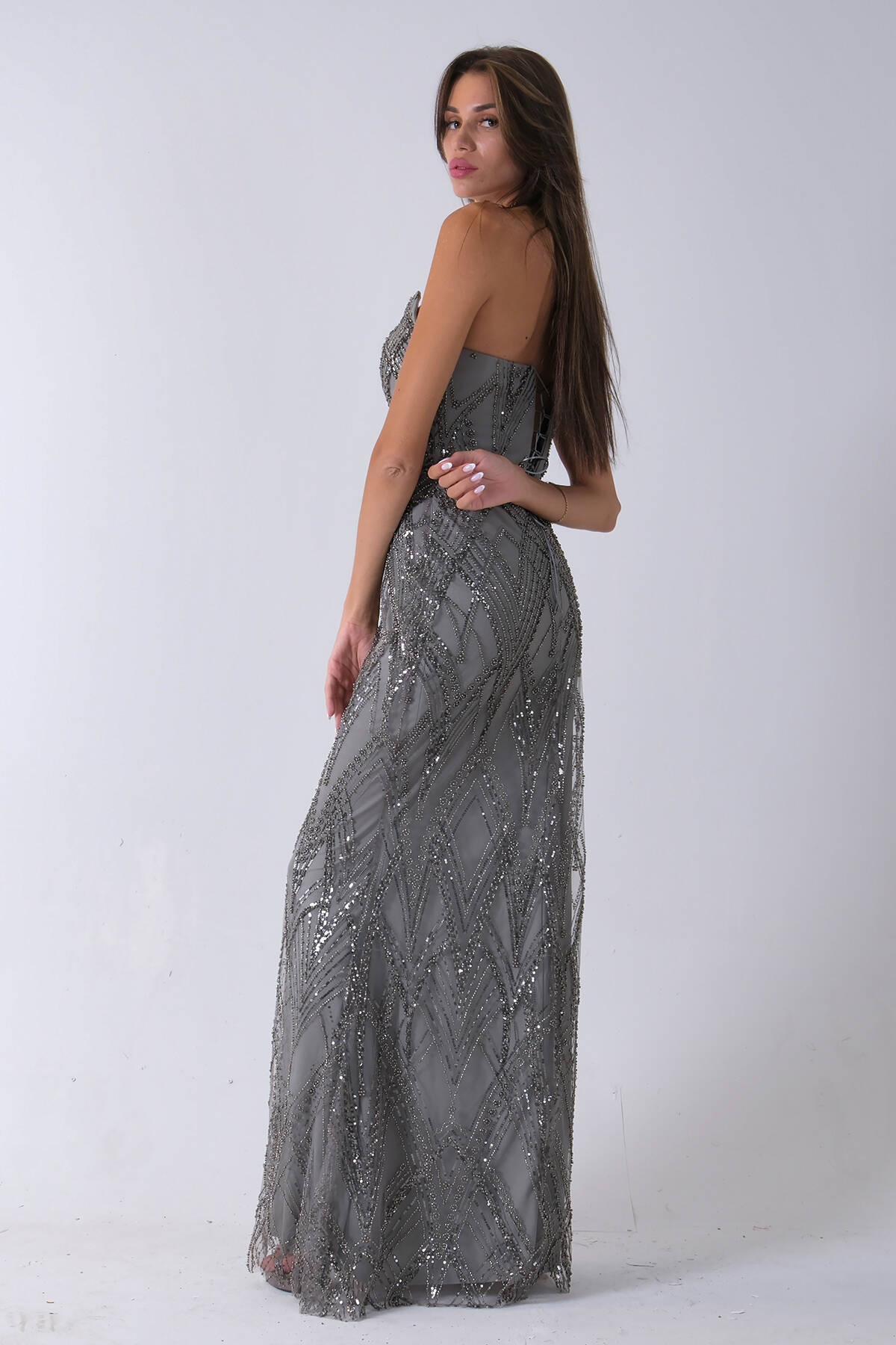 Gri Önü Taş Detaylı Yırtmaçlı Pul Payet Straplez Abiye 0801163.06