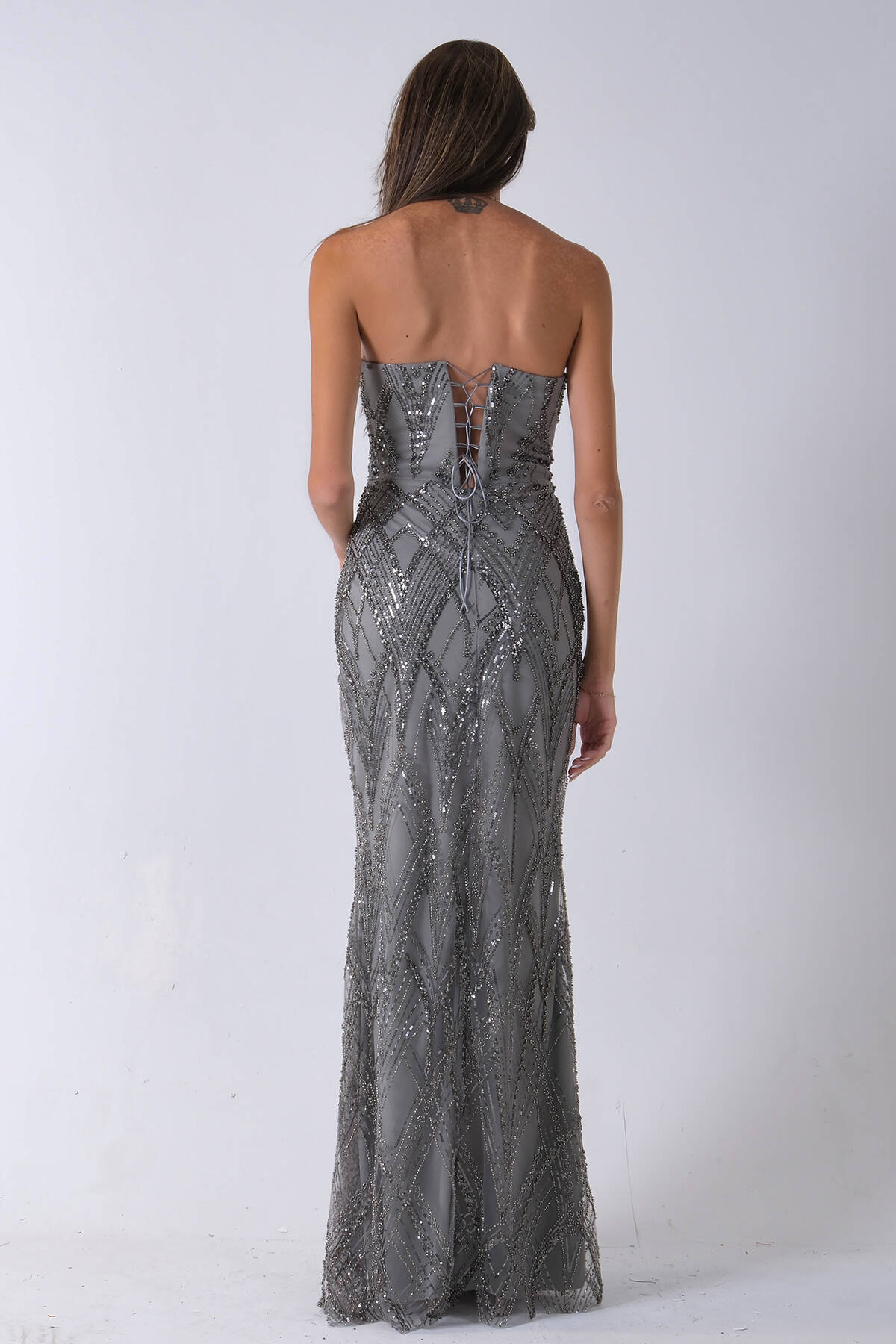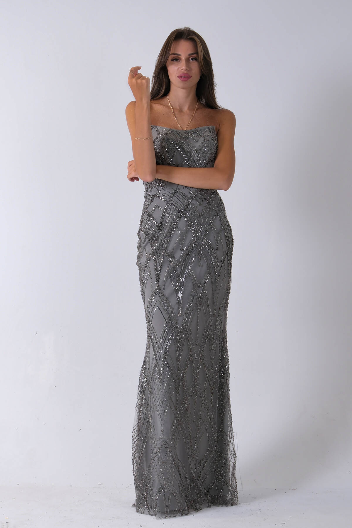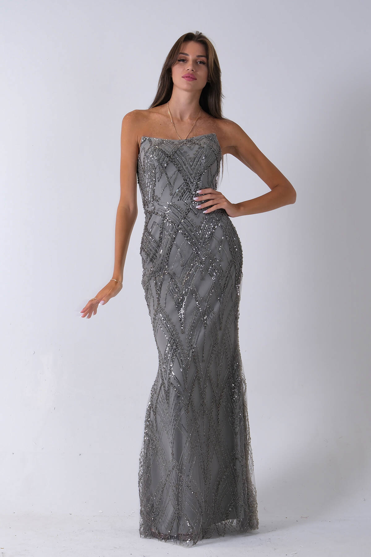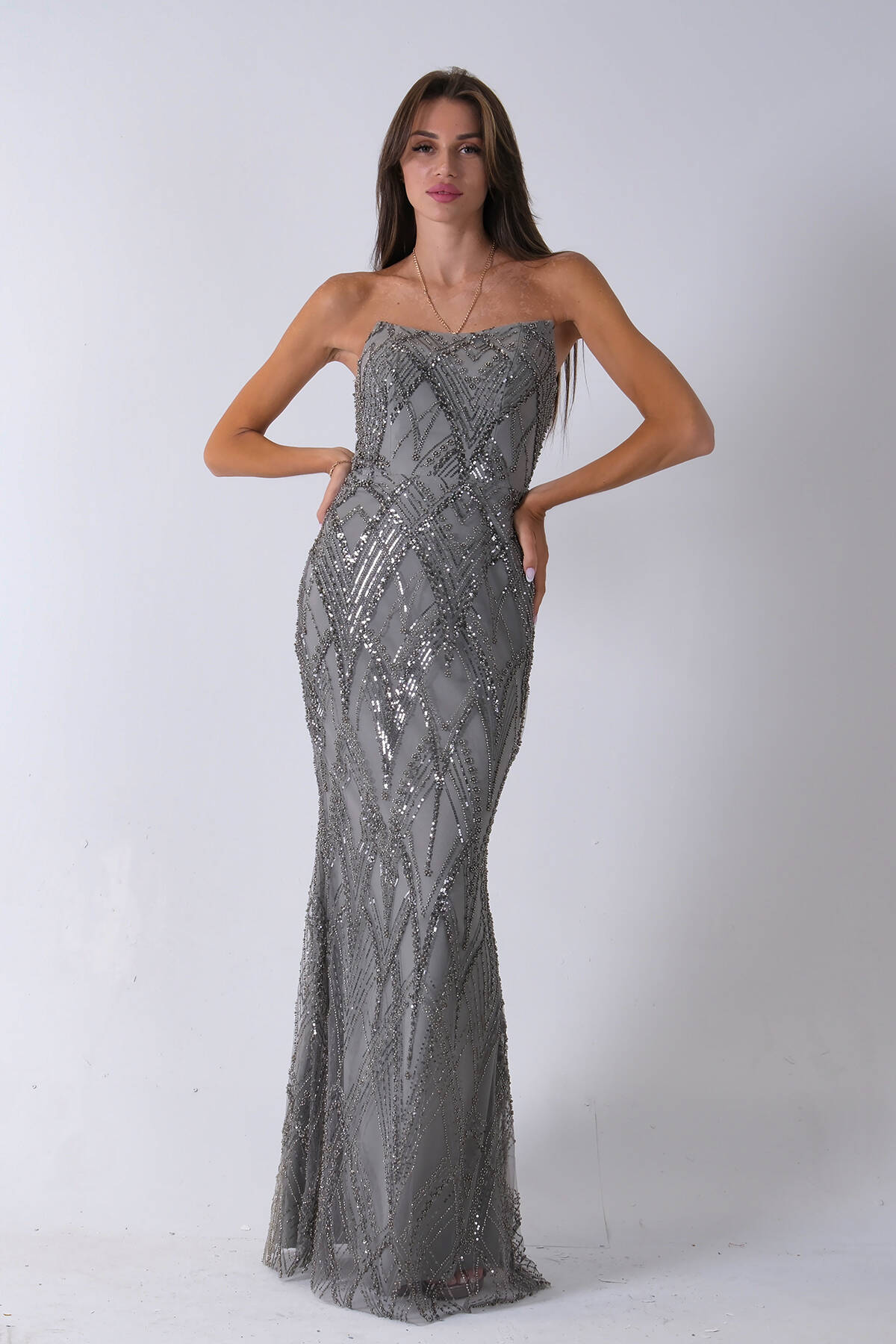 Gri Önü Taş Detaylı Yırtmaçlı Pul Payet Straplez Abiye 0801163.06