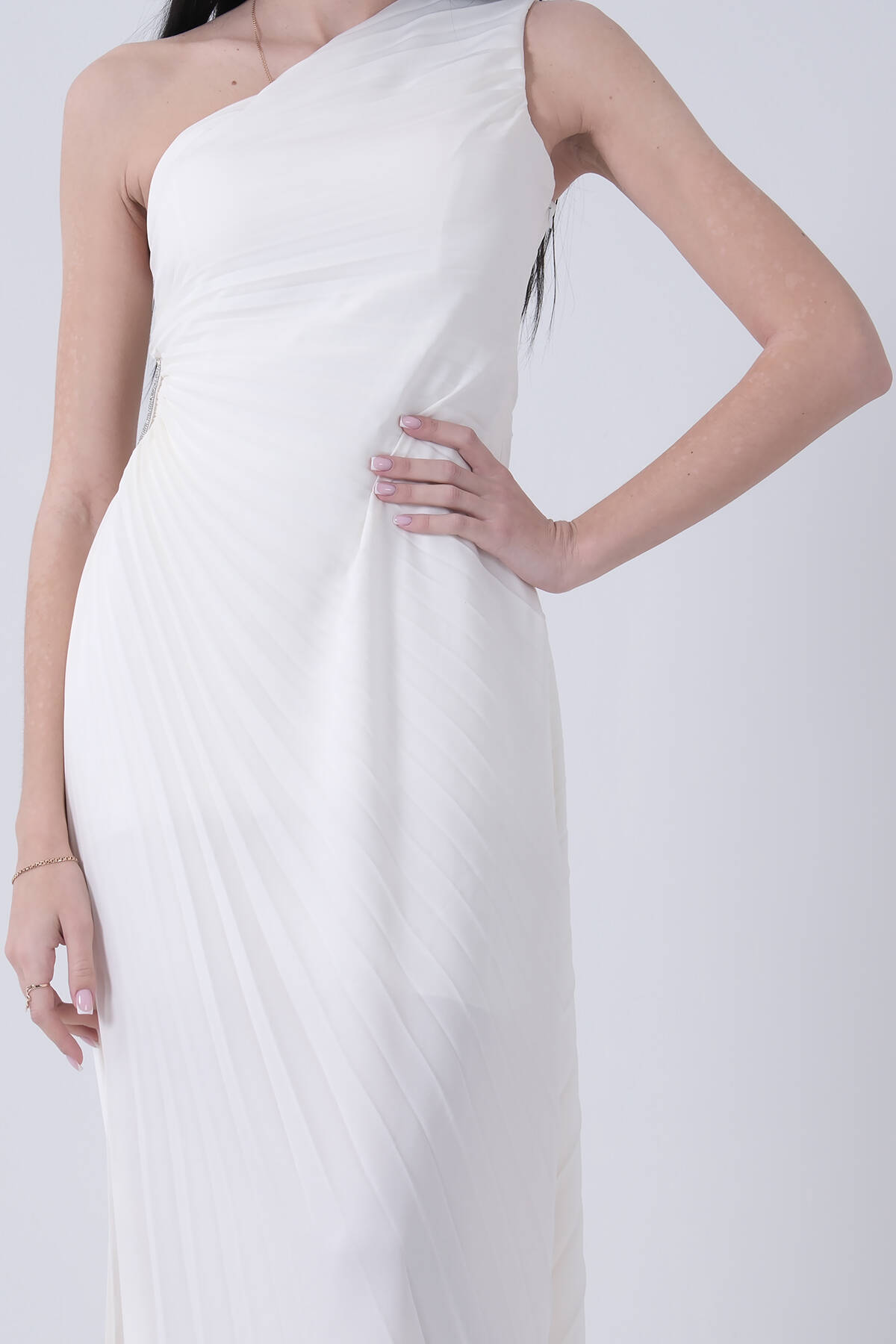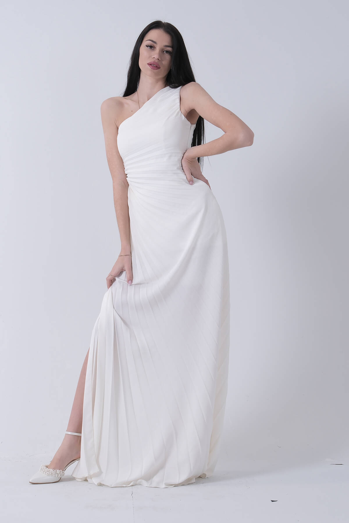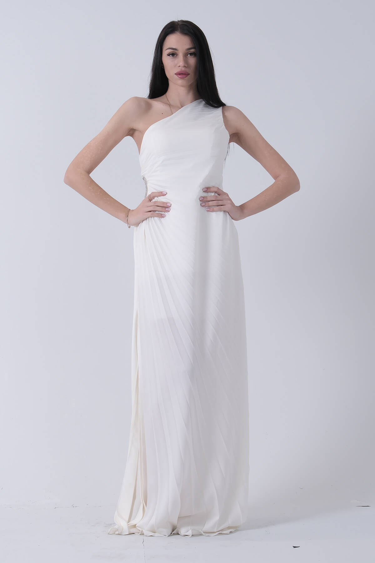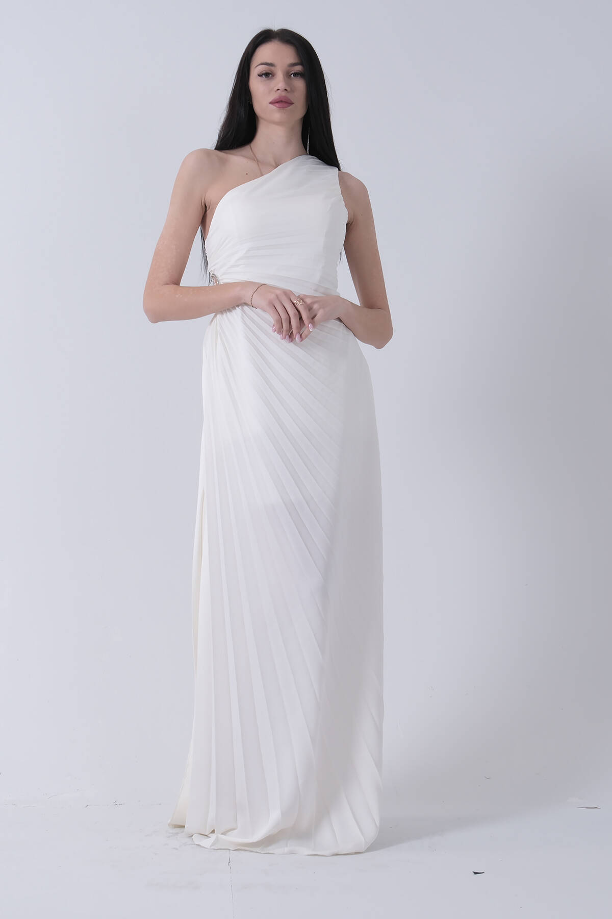 Uzun Tek Omuz Bel Dekolteli Yırtmaçlı Gögüsü Balenli Astarlı Piliseli Saten Abiye Elbise
