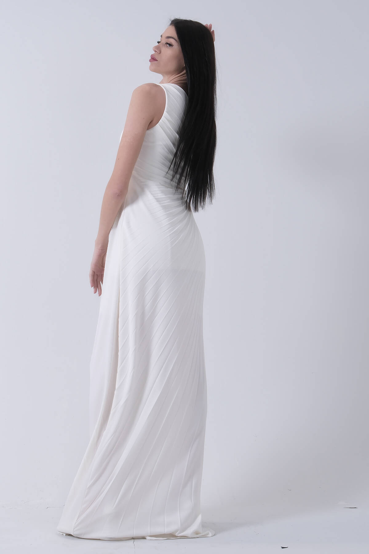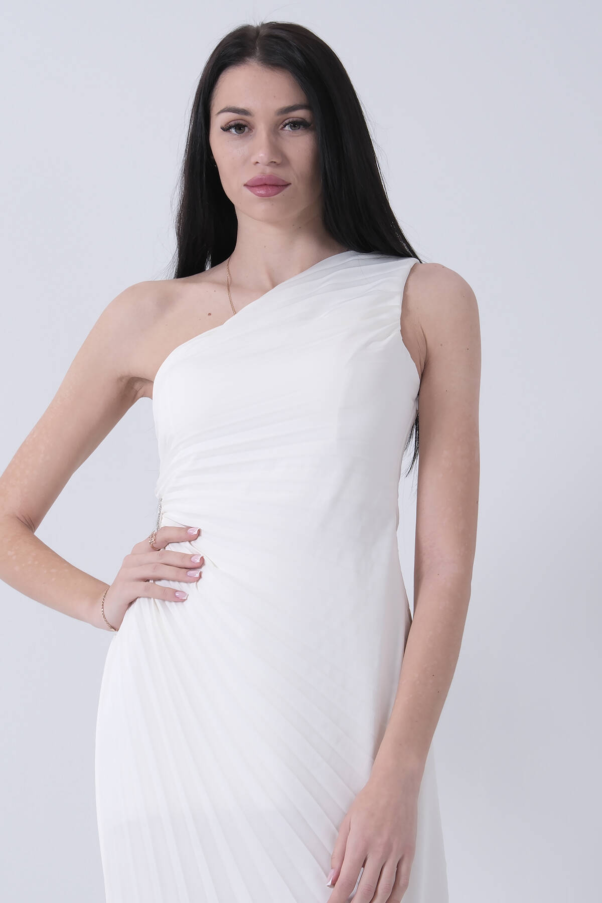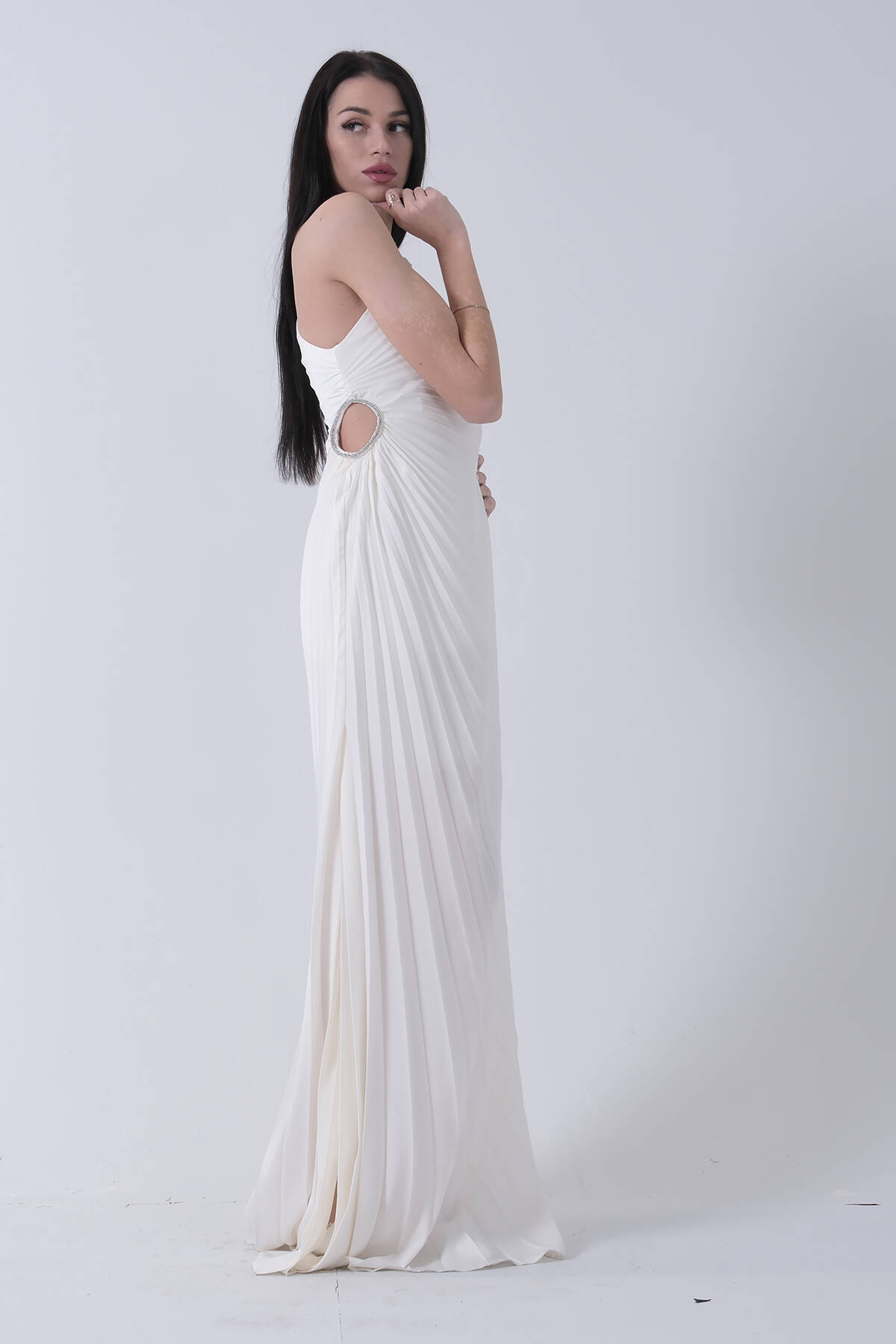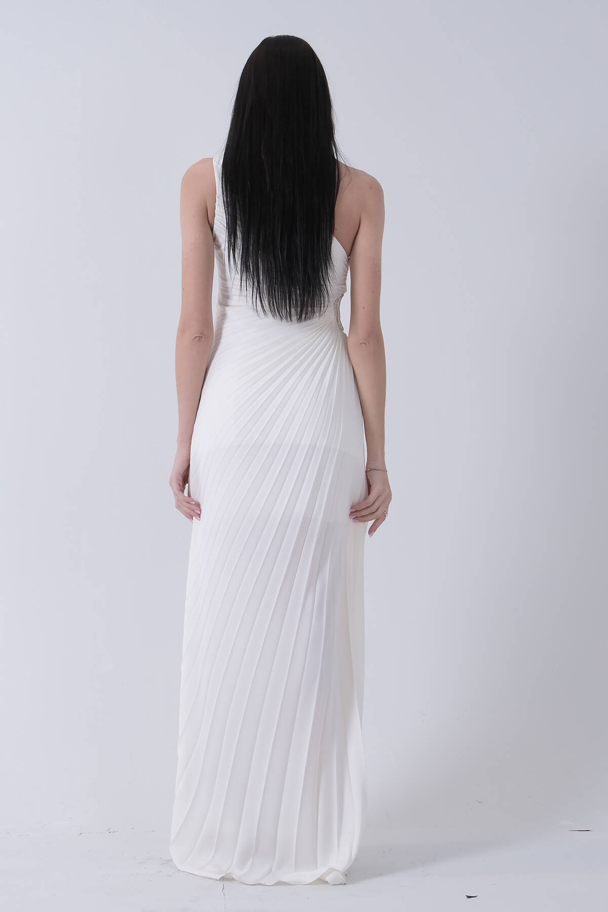 Uzun Tek Omuz Bel Dekolteli Yırtmaçlı Gögüsü Balenli Astarlı Piliseli Saten Abiye Elbise