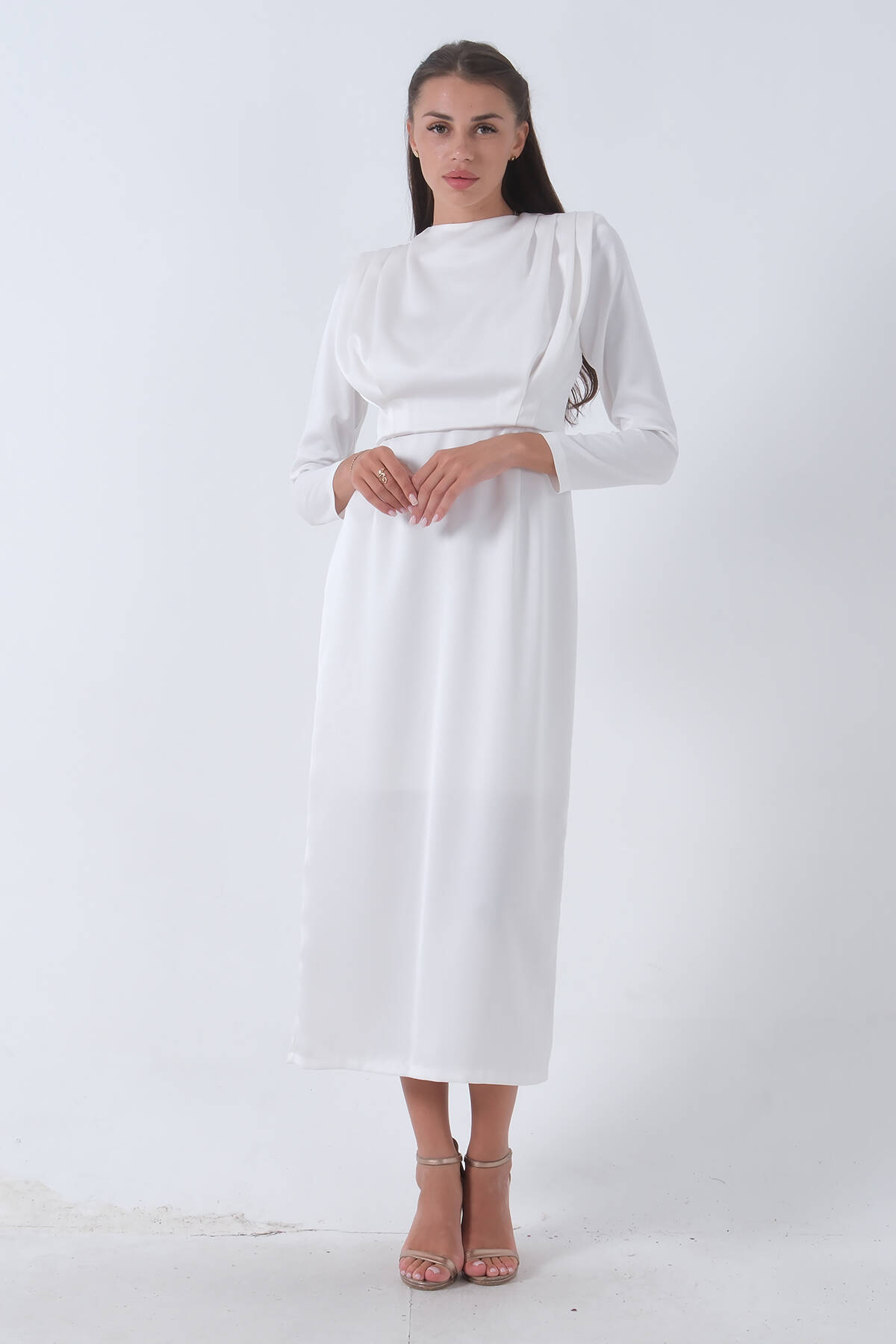 Modelin Ölçüleri : Boy: 1.75 cm / Göğüs: 87 cm / Bel: 66 cm /Basen : 94 cm Mankenin Üzerindeki Ürün 36/S Bedendir %100 Polyester Uzun Kol Omuzu Vatkalı Bisiklet Yaka Üzeri Plise Detaylı Astarlı Saten Abiye Elbise Ürün Boyu: 131 cm Stüdyo Çekimlerinde Renkler Işık Farklılıgından Dolayı Değişiklik Gösterebilir. (Dikkat! Ürünlerimiz güvenlik bandı ile gönderilmektedir . Güvenlik bandı olmayan ürünlerin iadesi kabul edilmeyecektir)