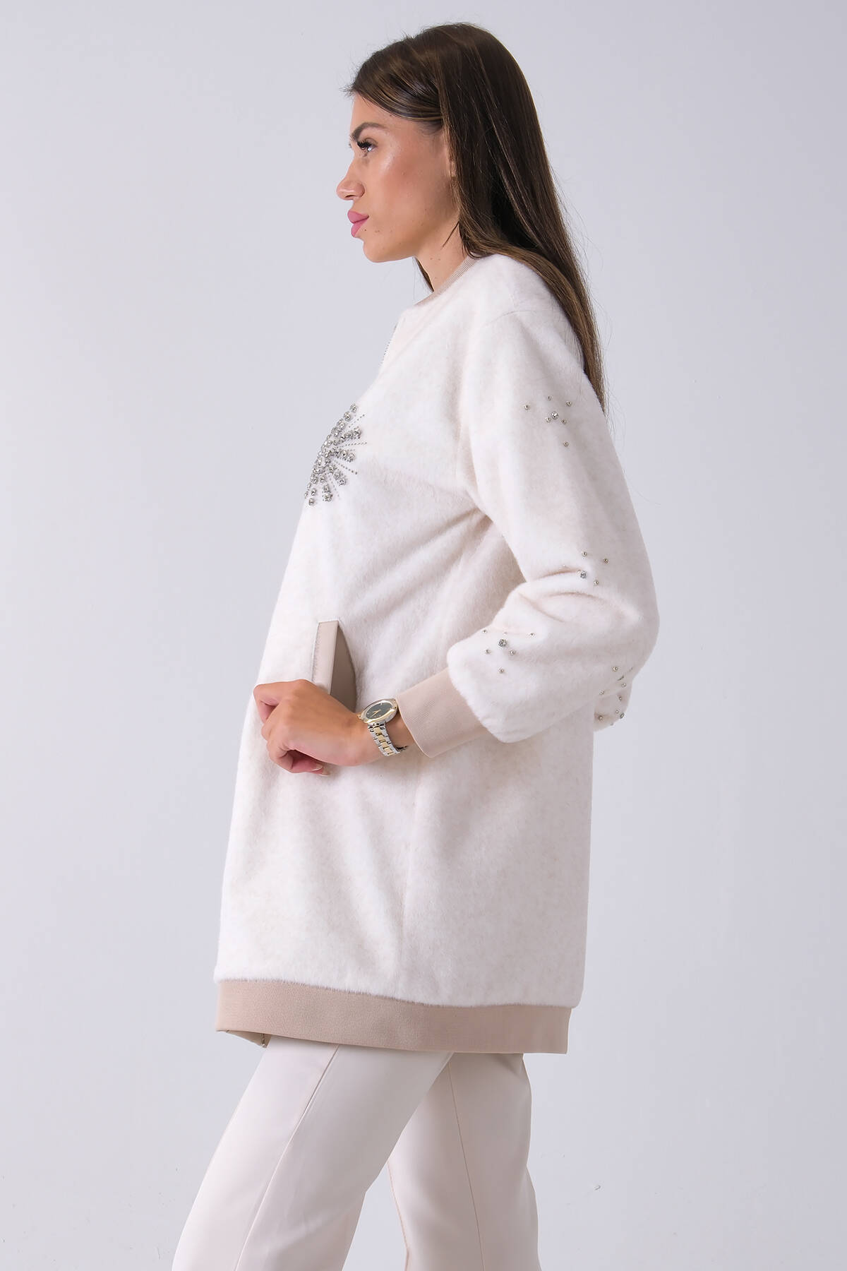 Ekru Üzeri Taş Detaylı Yandan Cepli Peluş Hırka 4701420.147