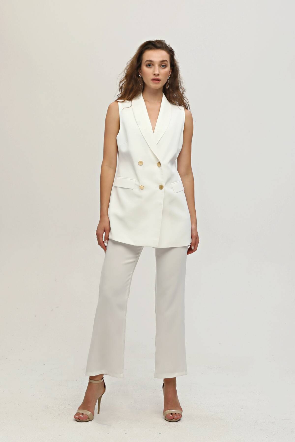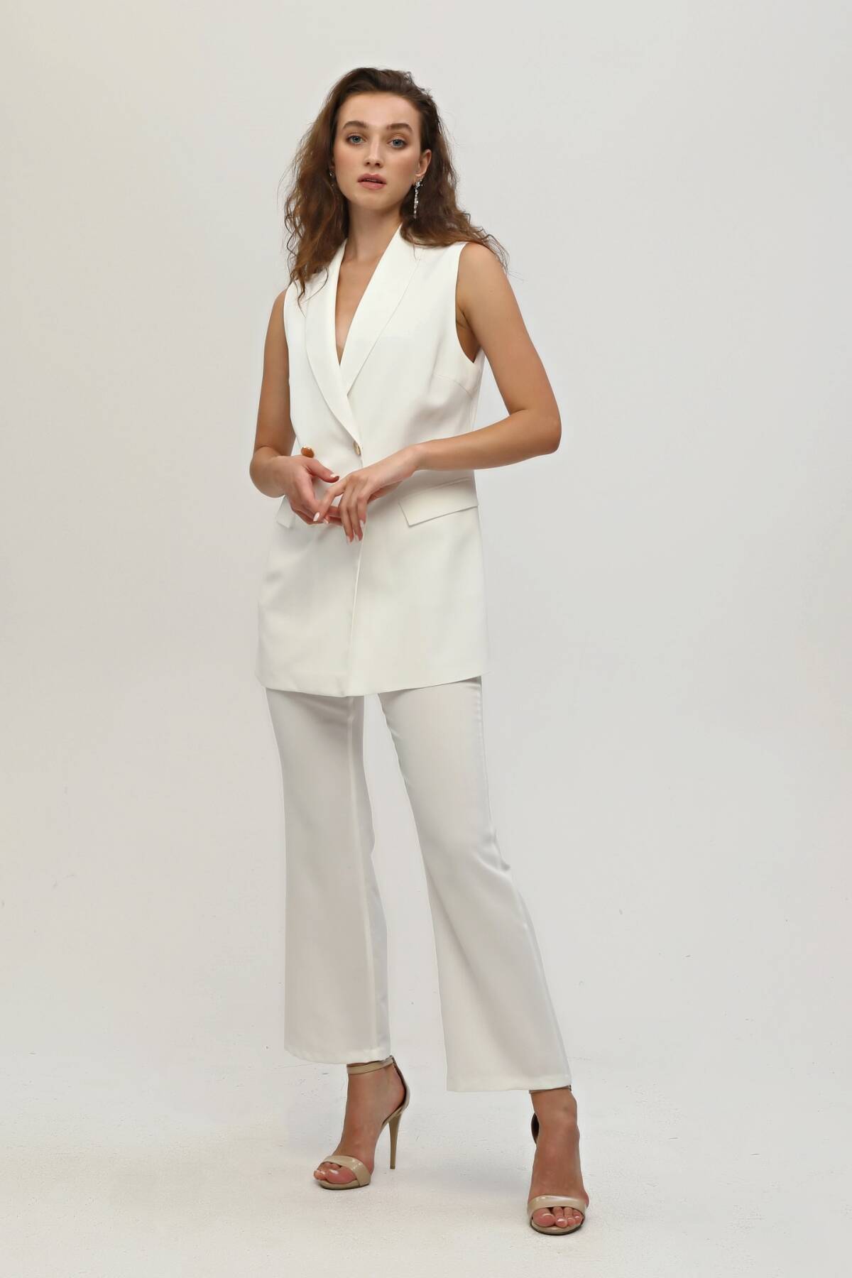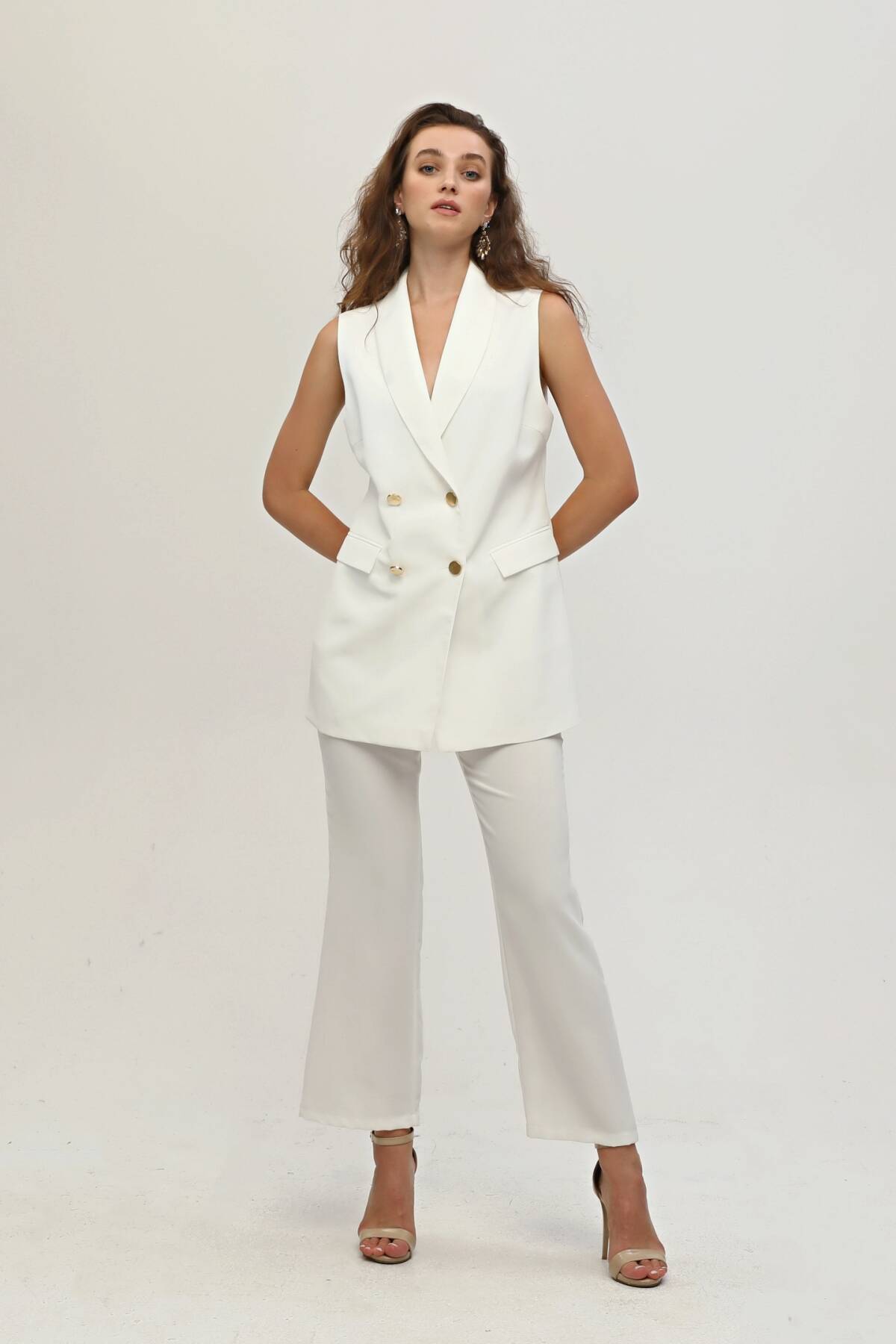 Modelin Ölçüleri : Boy: 1.80 cm / Göğüs: 88 cm / Bel: 69 cm /Basen : 94 cm Mankenin Üzerindeki Ürün 36/XS Bedendir %100 Polyester Kolsuz Klasik Yaka Cep Görünüm Detaylı Astarlı Çift Düğme Kapamalı Yelek Yüksek Bel Yandan Fermuarlı Bol Paça Pantolonlu Krep Kumaş Takım Ürün Boyu : Yelek 78 cm Pantolon 104 cm Stüdyo Çekimlerinde Renkler Işık Farklılıgından Dolayı Değişiklik Gösterebilir
