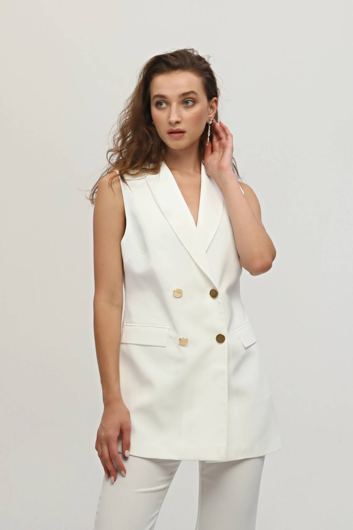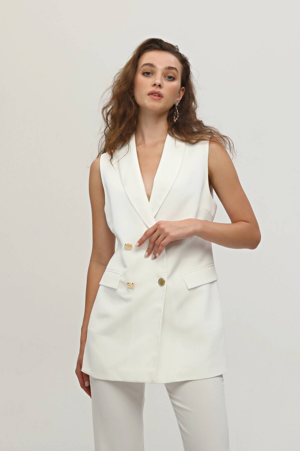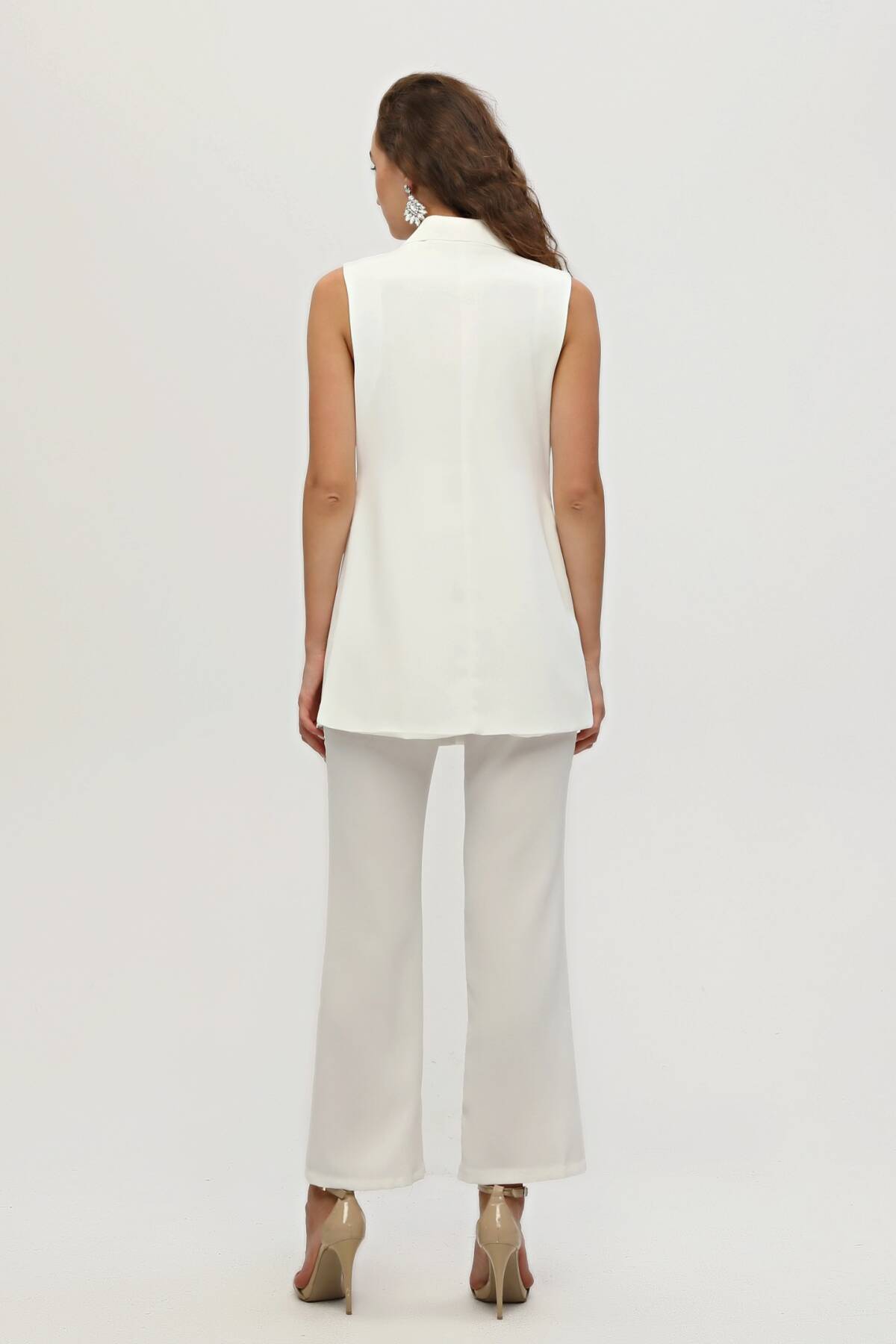 Modelin Ölçüleri : Boy: 1.80 cm / Göğüs: 88 cm / Bel: 69 cm /Basen : 94 cm Mankenin Üzerindeki Ürün 36/XS Bedendir %100 Polyester Kolsuz Klasik Yaka Cep Görünüm Detaylı Astarlı Çift Düğme Kapamalı Yelek Yüksek Bel Yandan Fermuarlı Bol Paça Pantolonlu Krep Kumaş Takım Ürün Boyu : Yelek 78 cm Pantolon 104 cm Stüdyo Çekimlerinde Renkler Işık Farklılıgından Dolayı Değişiklik Gösterebilir